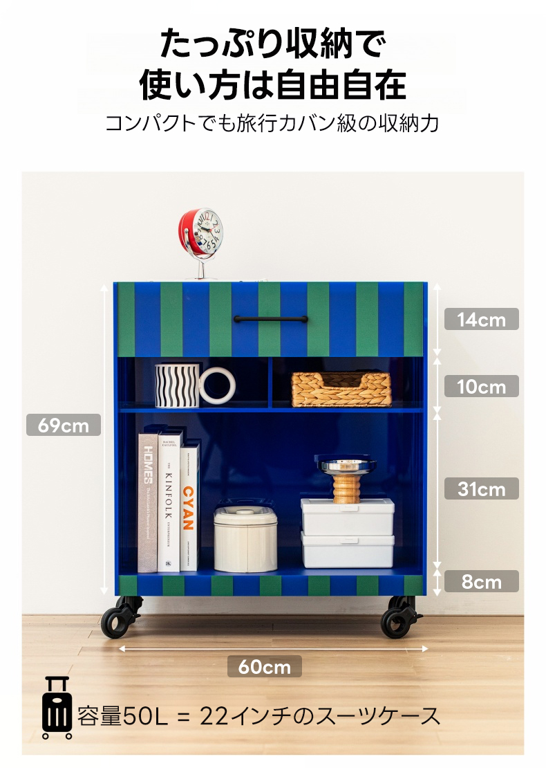 - 【多機能な収納力】:ストライプ収納カートは50Lの大容量を誇り、旅行カバン並みの収納力を持っています。キャスター付きで移動が簡単、ストッパーで安全に固定可能。リビングや寝室での使用に最適です。