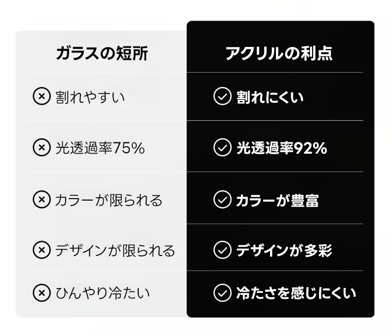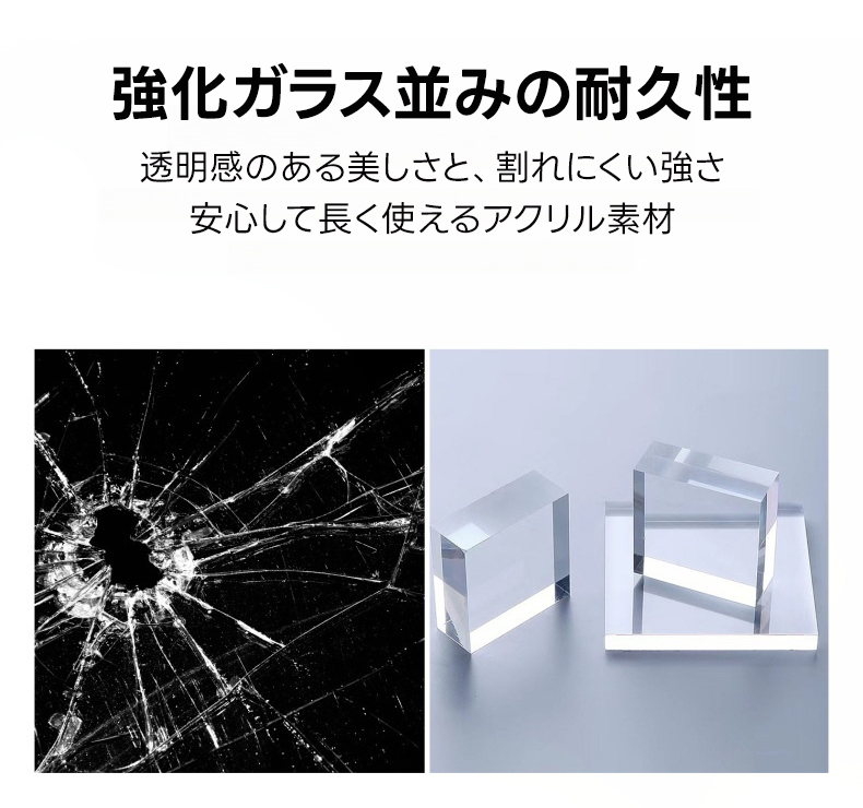 - 【高品質な素材とデザイン】アクリル素材を使用し、強化ガラス並みの耐久性を持ちます。光透過率が92%と高く、割れにくいのが特長です。色褪せしにくいUV印刷が施されており、長期間美しい状態を保ちます。