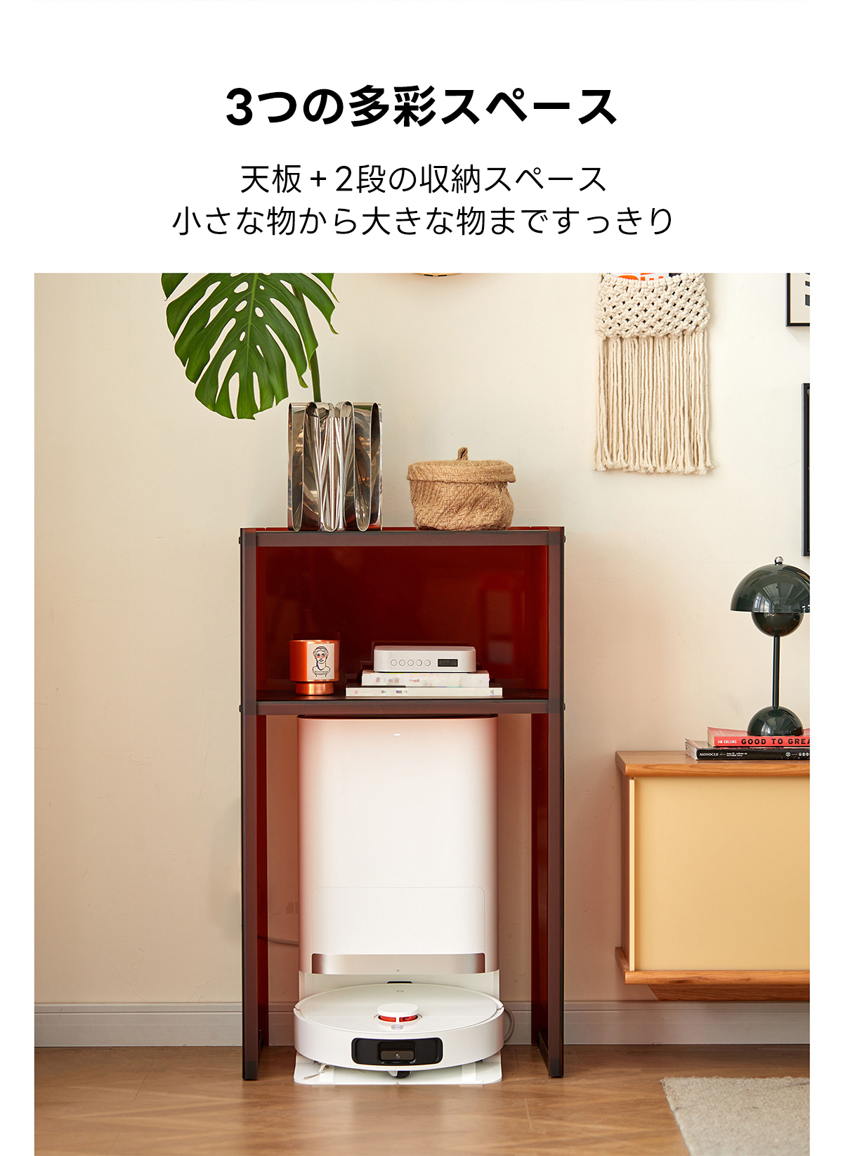 - 【快適な使用体験】:コンパクトながら十分な収納力を持ち、掃除機ロボットも収納可能なスペースを確保。生活に寄り添う設計で、日々の整理整頓をサポートします。