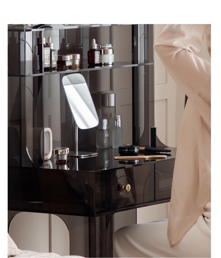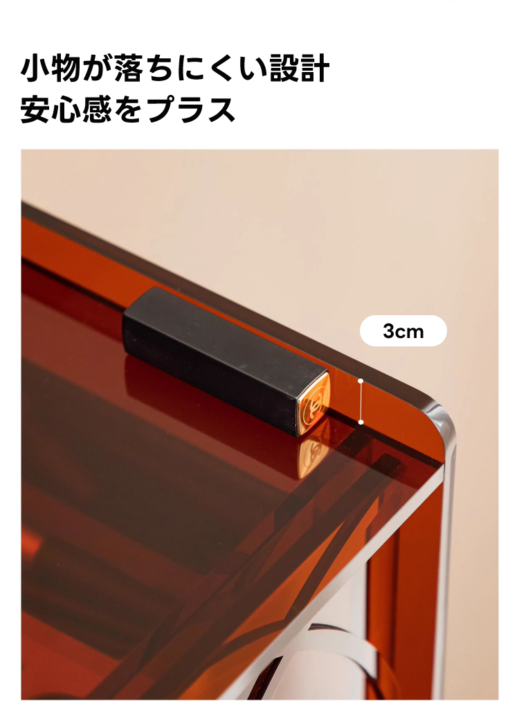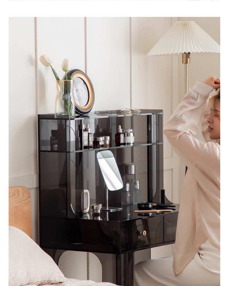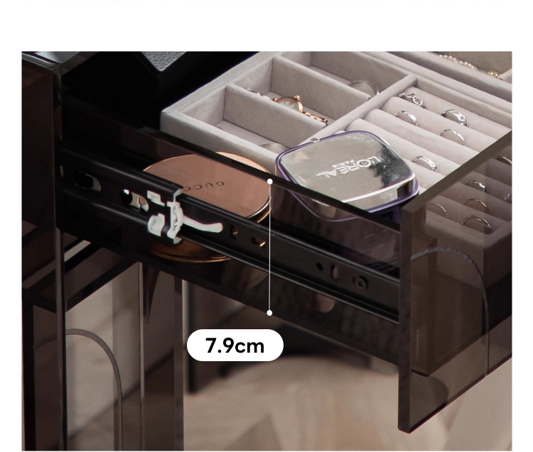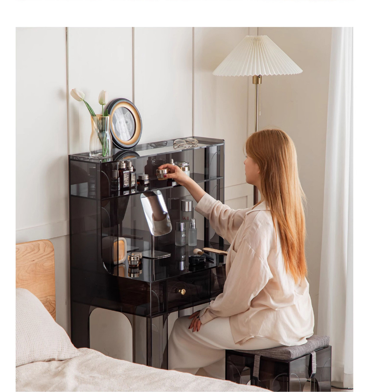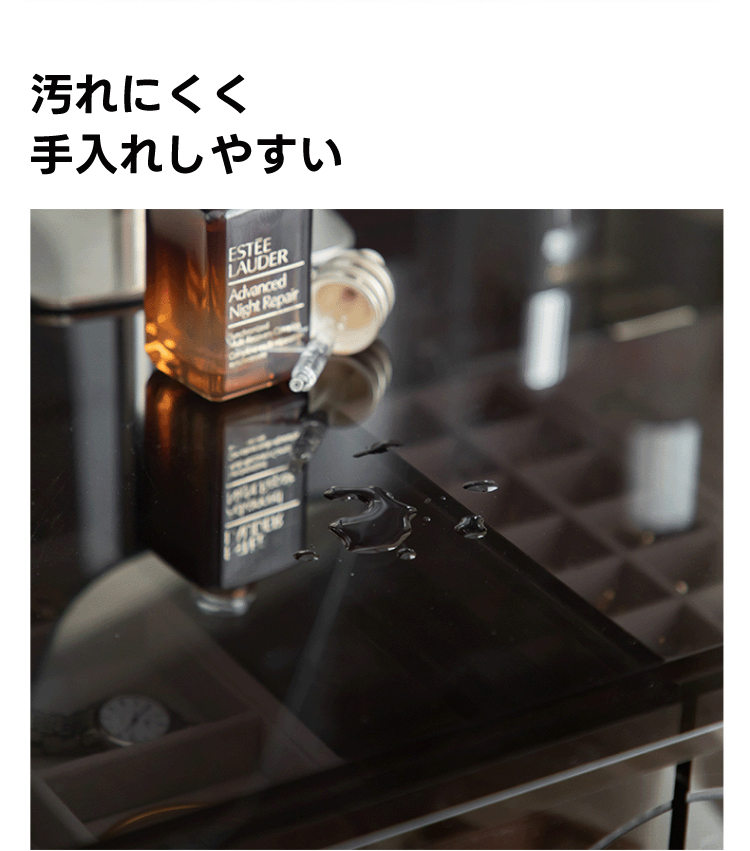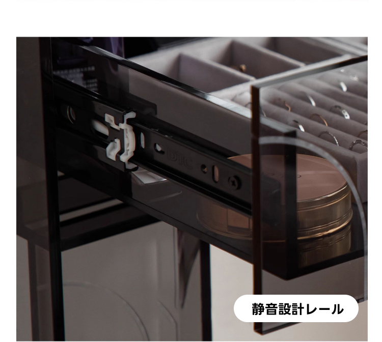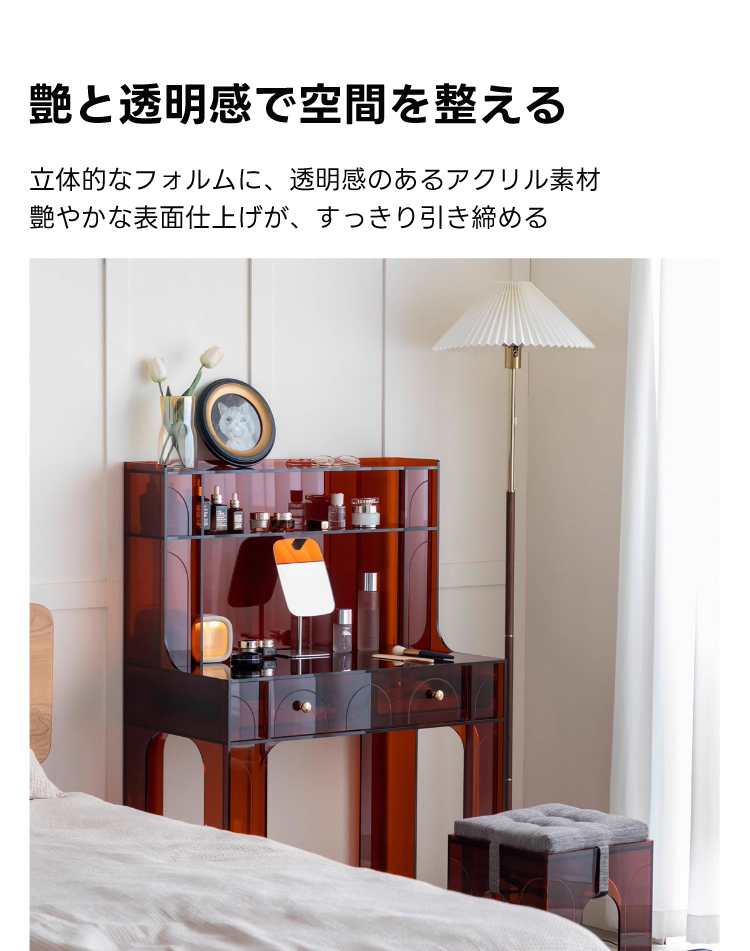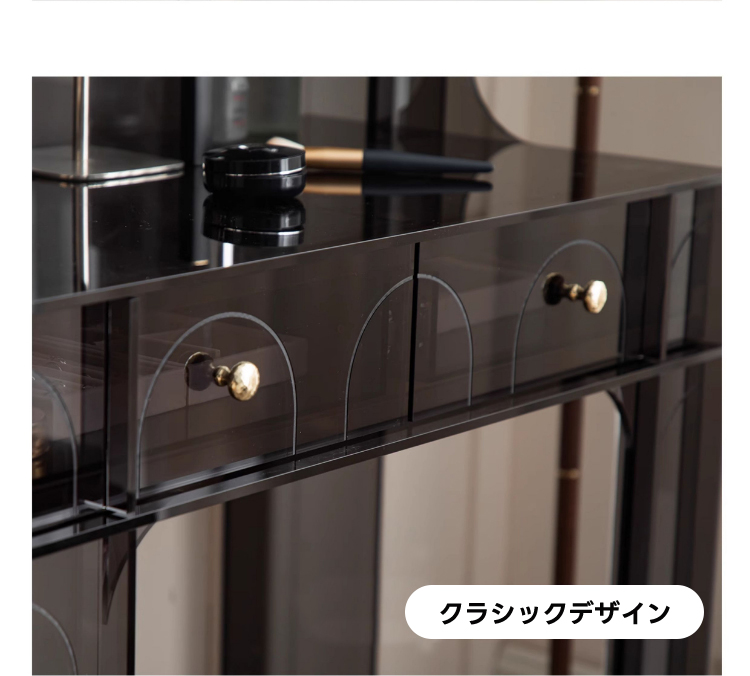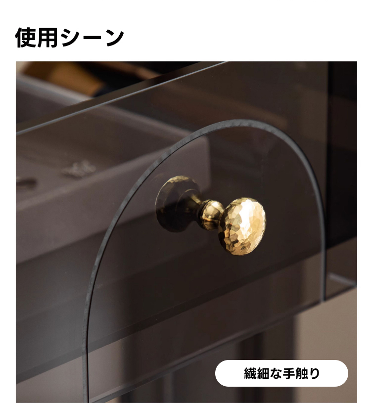 - 【アクリル素材と静音設計】:アクリル素材を使用したこのドレッサーは、汚れにくく手入れが簡単です。静音設計のレールを使用しており、引き出しの開閉がスムーズです。