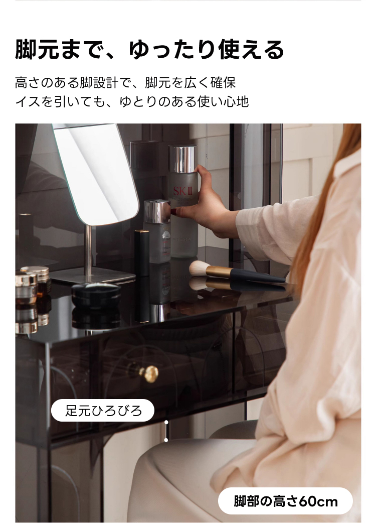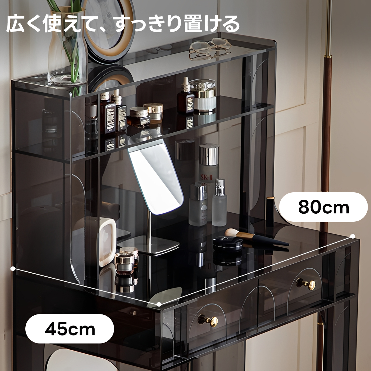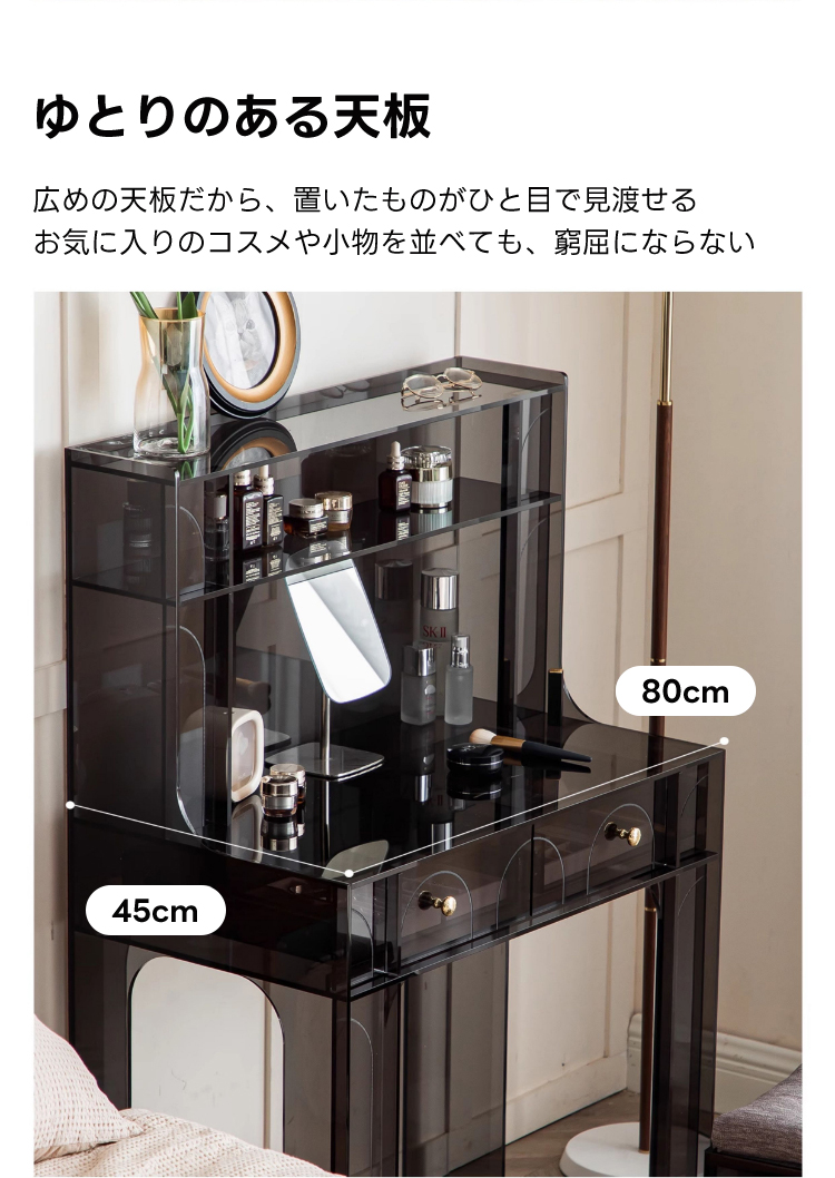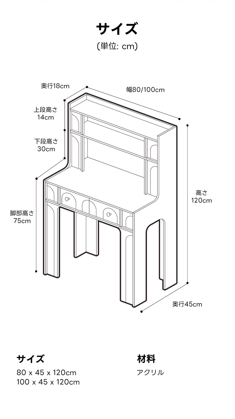 - 【広めの天板と収納スペース】:80cmまたは100cm x 45cm x 120cmの広めの天板で、化粧品や小物をすっきりと配置できます。上段と下段の収納スペースは高さが異なり、ボトル類を整理しやすく設計されています。