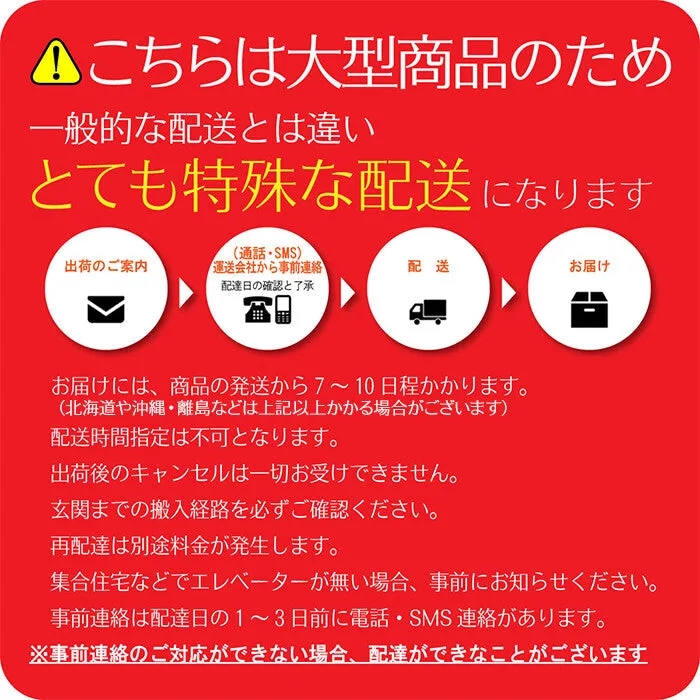 ※沖縄・離島:大型商品の配送には、送料30,000円(税込)を頂戴します。該当地域からのご注文はサイト上では承れませんので、ご注文前に必ずカスタマーサポートまでご相談ください。なお、商品・地域によりお届けできない場合があります。組立・開梱サービスもご利用いただけません。