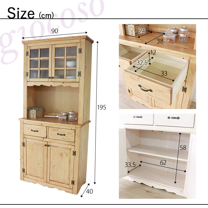 - 【クラシカルなカントリーデザイン】北欧パイン材を使用したクラシカルなデザインが特徴のカップボード。ナチュラルな風合いがキッチンやダイニングを華やかに演出し、使い込むほどに味わいが増します。