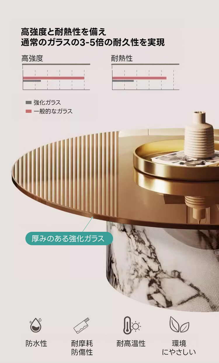 - 【強化ガラス天板の優れた耐久性】このマーブルガラステーブルは、強化ガラス天板を採用しており、通常のガラスの3~5倍の耐久性を持ちます。衝撃や熱に強く、安定性が高いため、長期間にわたって安心してご使用いただけます。
