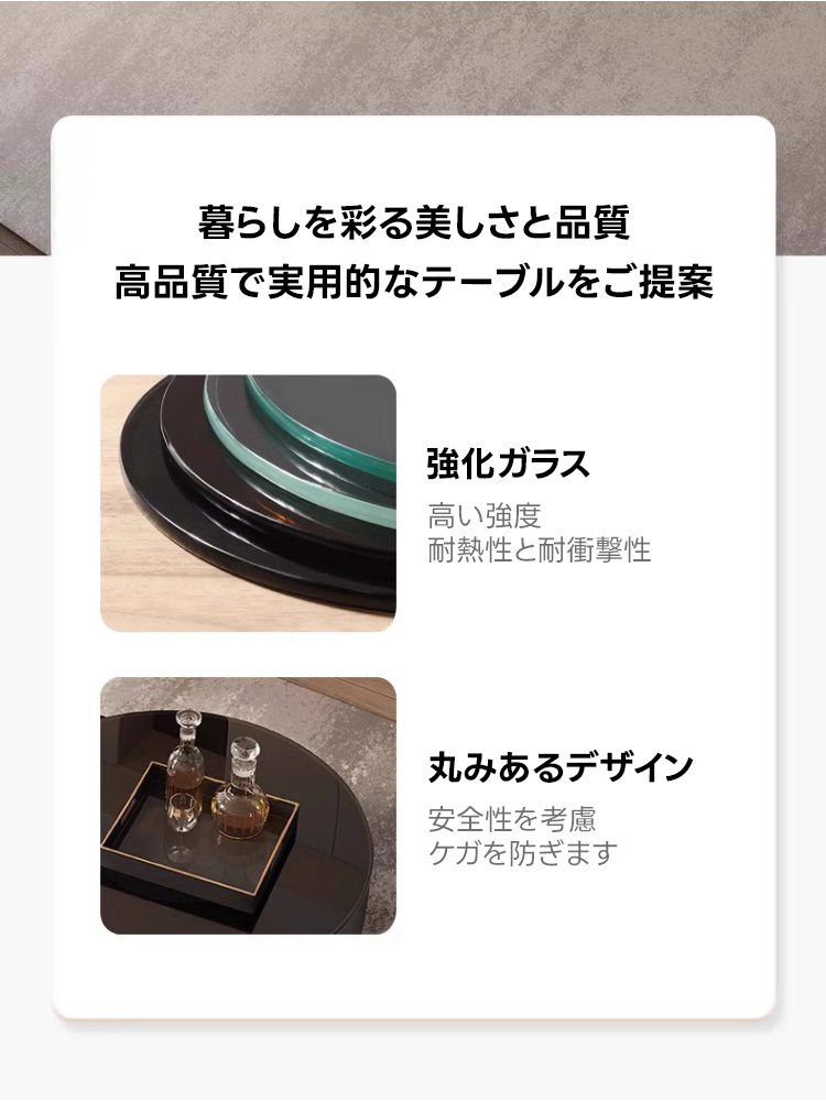 - 【多様な利用シーン】このテーブルは、カップルやファミリー向けに最適で、リビングルームでの使用にぴったりです。家族や友人と過ごす時間をより快適にし、一人暮らしの方にもコンパクトなサイズ感で対応します。どんなインテリアにもマッチするデザインです。