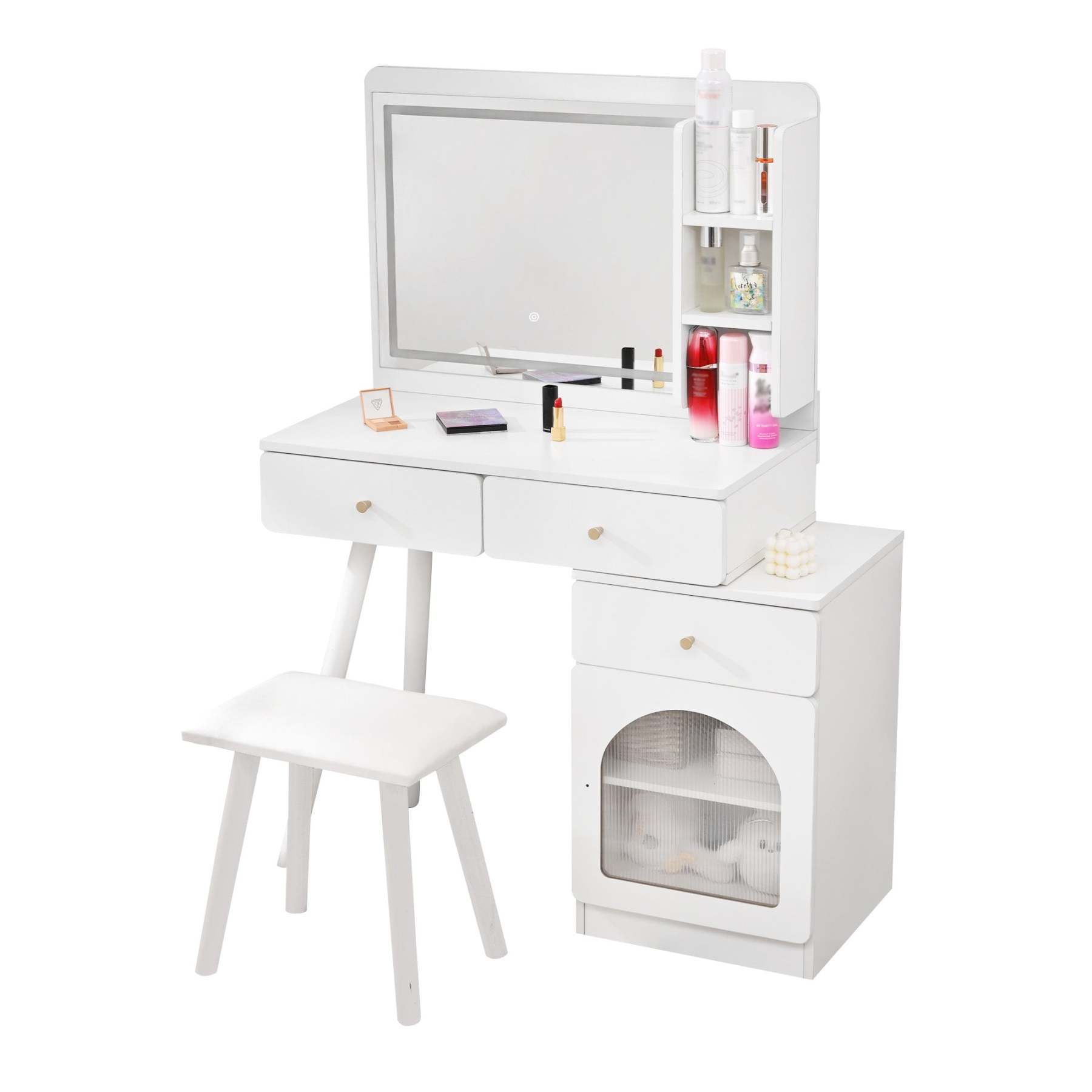 - 【豊富な収納スペース】オープン棚や引き出しが多数あり、化粧品や小物を整理整頓できます。引き出しは大小合わせて3杯あり、日常的に使うアイテムをすっきり収納可能。扉内収納も備え、ボトル類や高さのある物も収納できます。