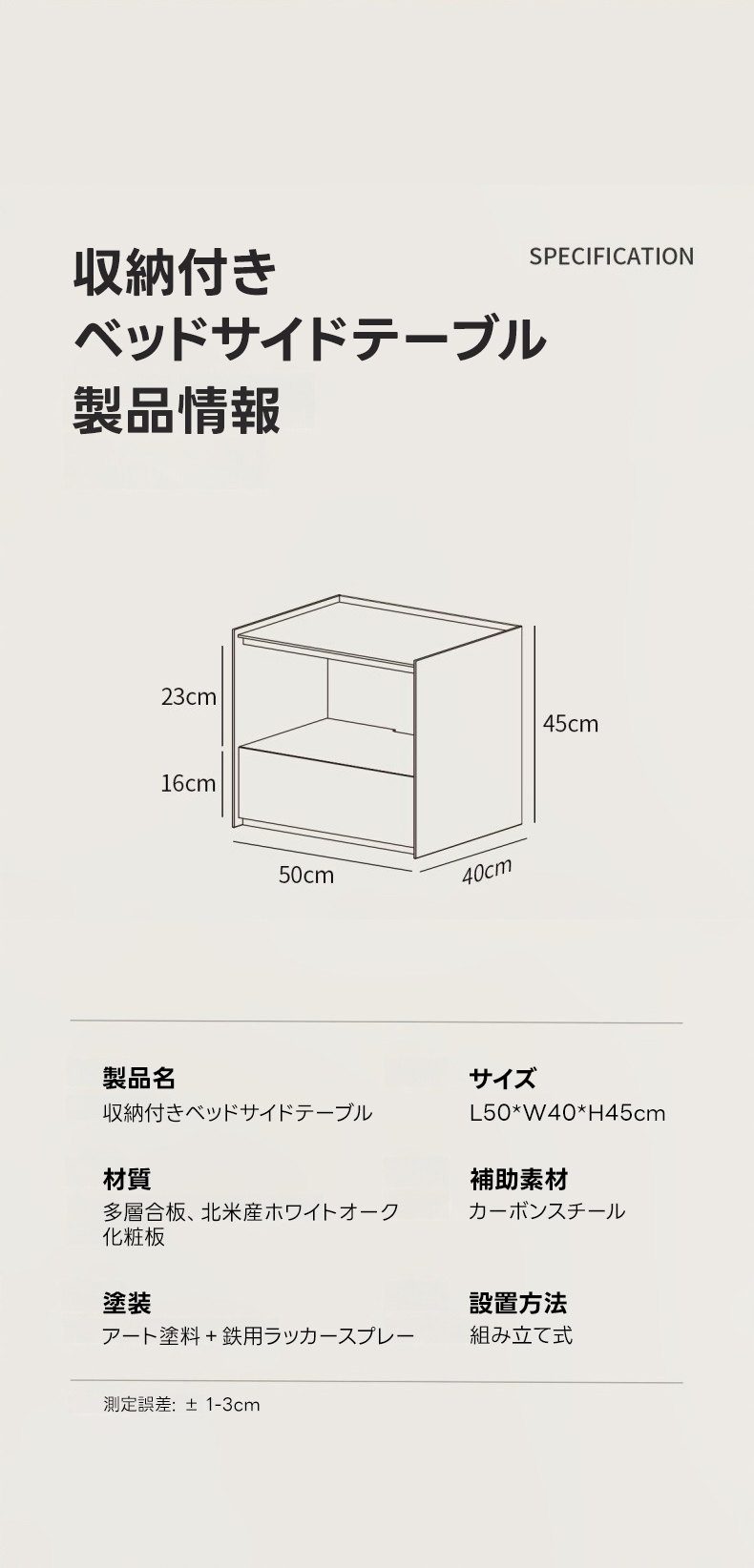 - 【幅広い適用性】:幅50cm、奥行き40cm、高さ45cmのコンパクトなサイズで、一人暮らしや学生の方にもぴったりです。カップルやファミリー、一人暮らしの方、学生の方に最適で、寝室をスタイリッシュに演出します。