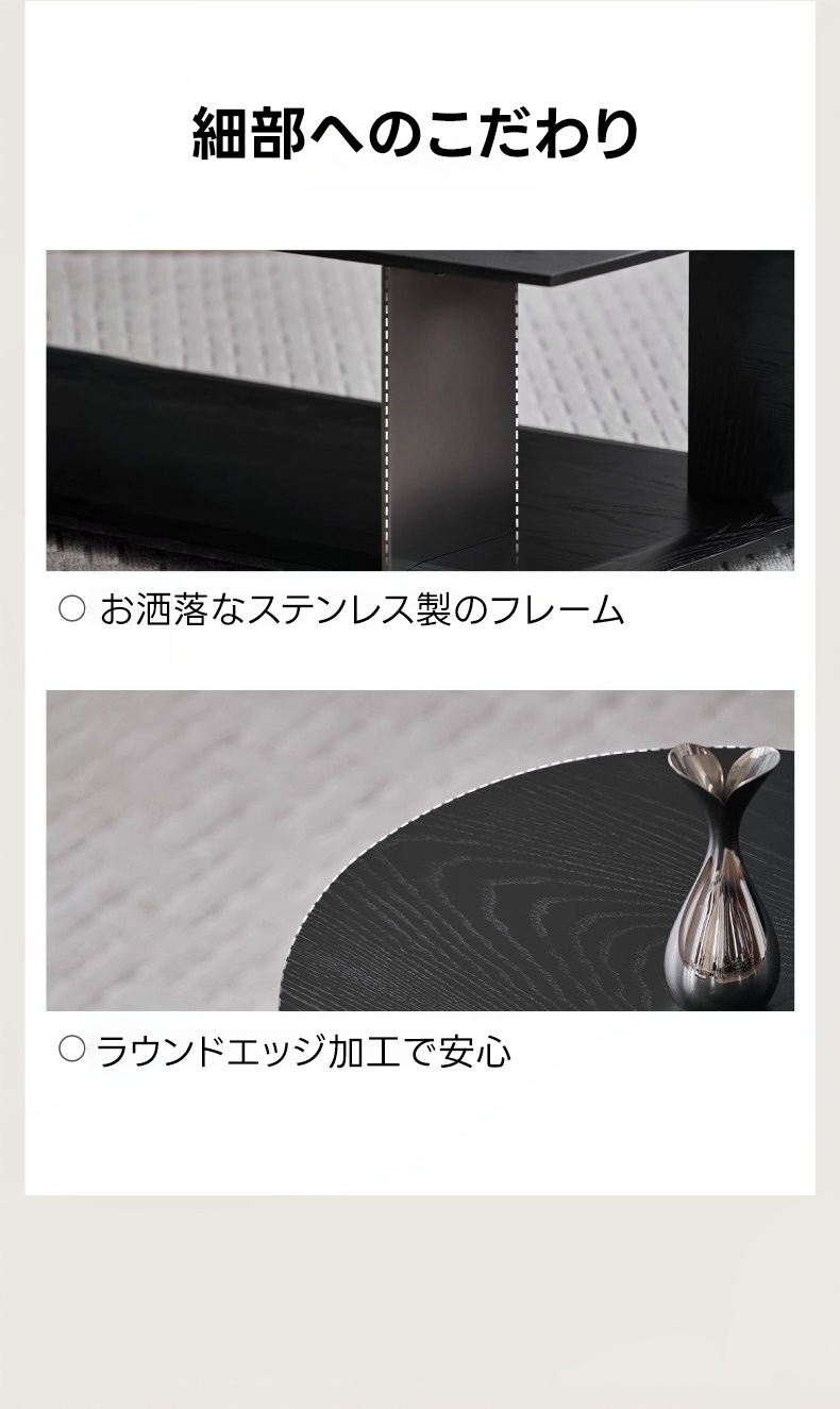 - 【高品質素材とデザイン】北米産FASグレードのホワイトオーク材を使用し、耐久性と美しさを兼ね備えています。脚部にはステンレスを使用し、耐久性を高めています。美しいラインとラウンドエッジ加工で安全性も考慮されています。