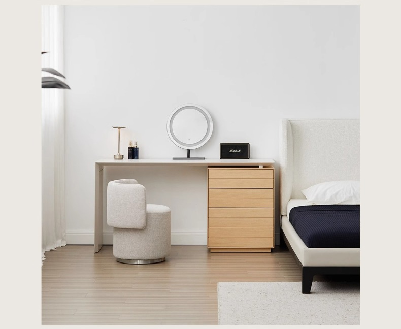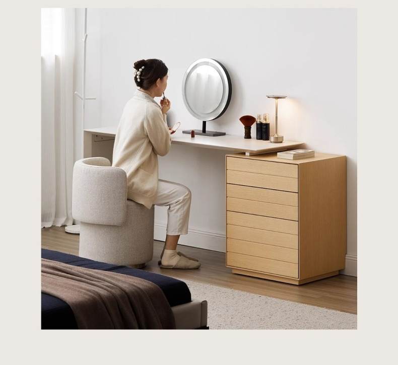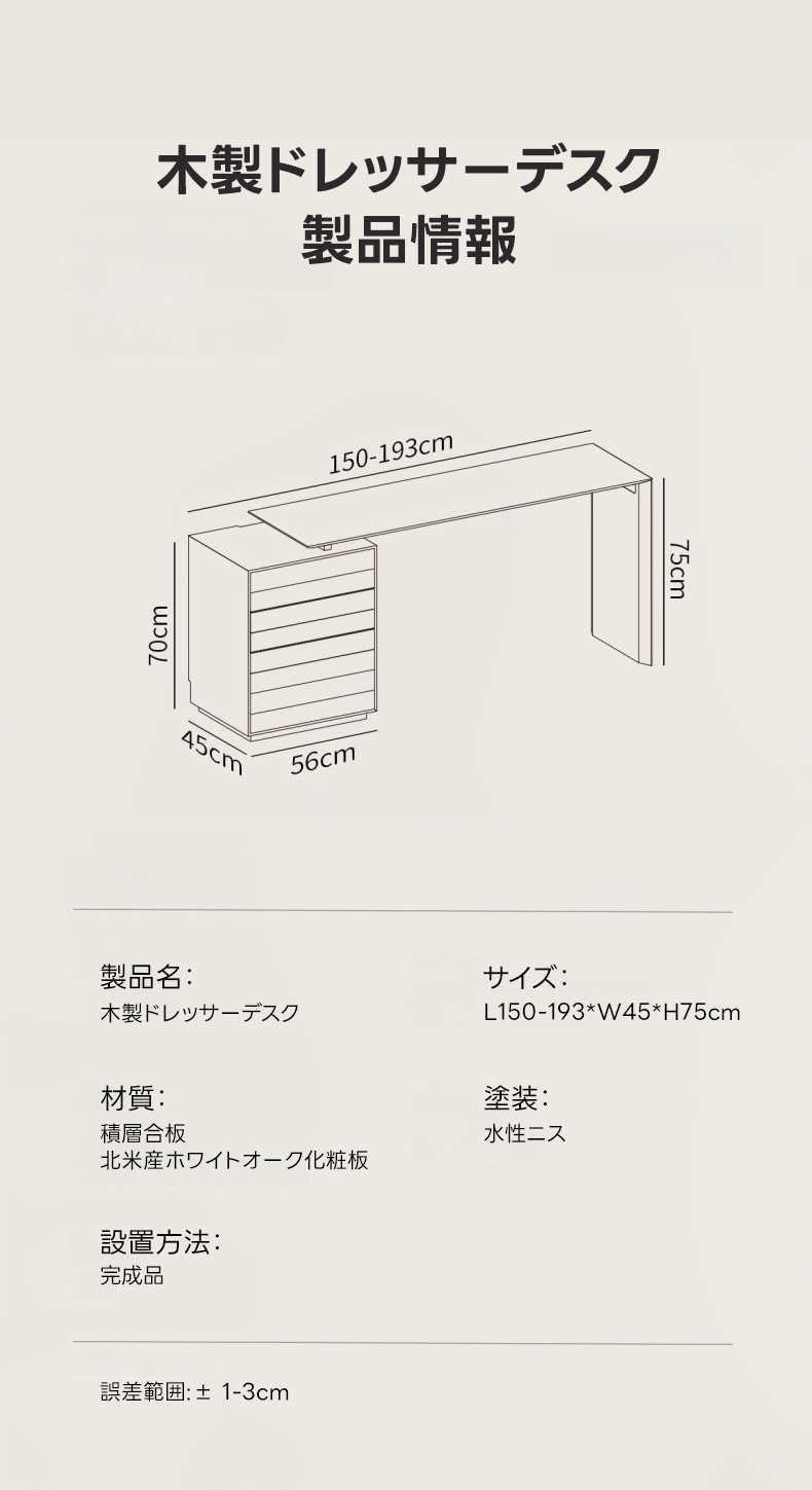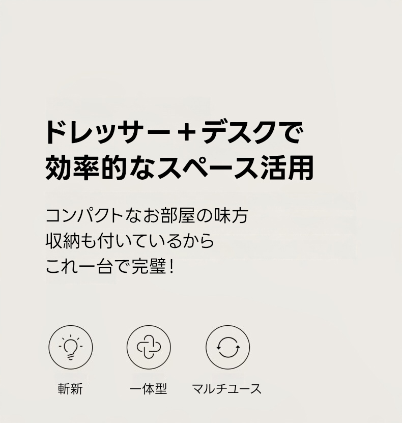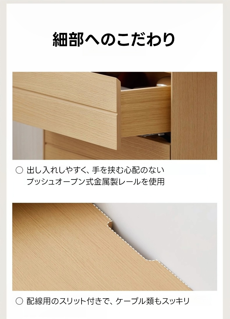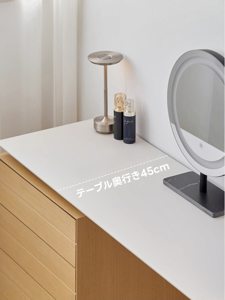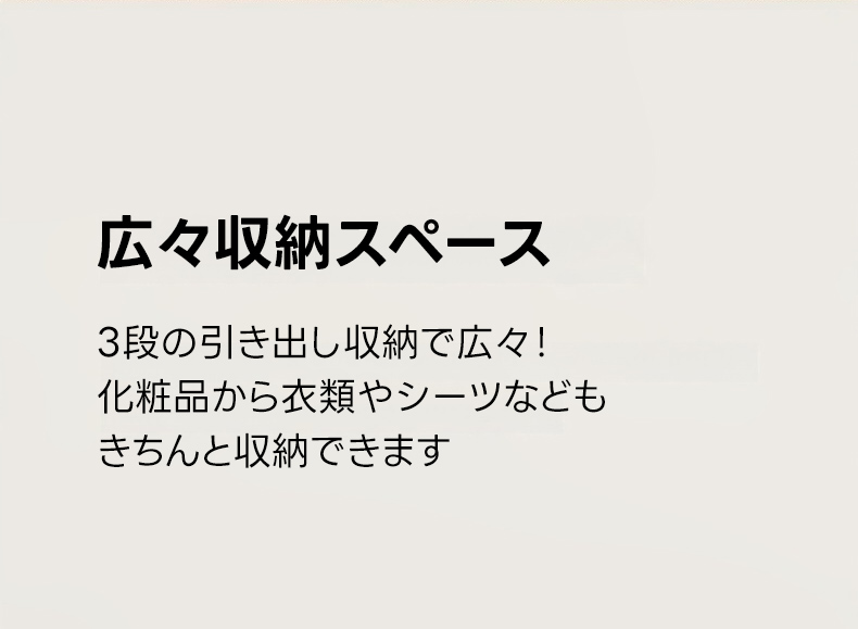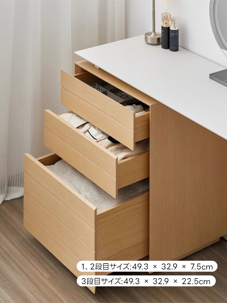 - 【快適な使用感】3段の引き出しがあり、化粧品から衣類までしっかり収納できます。プッシュオープン式でスムーズな出し入れが可能です。足元広々デザインで、快適な使用感を提供します。