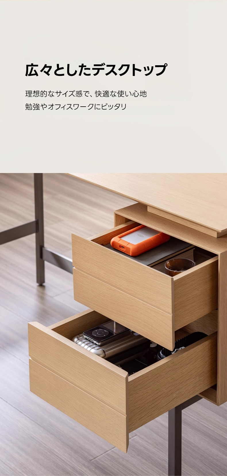 - 【広々としたデスクトップ&大容量収納】このモダンナチュラルワークデスクは、広々としたデスクトップを提供し、勉強やオフィスワークに最適です。大容量の引き出し収納が付いており、本や書類、PC用品やケーブル類までスッキリ収納可能です。