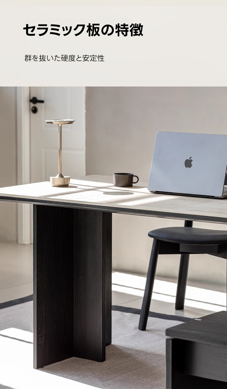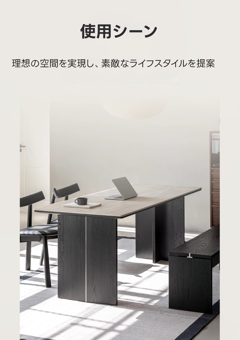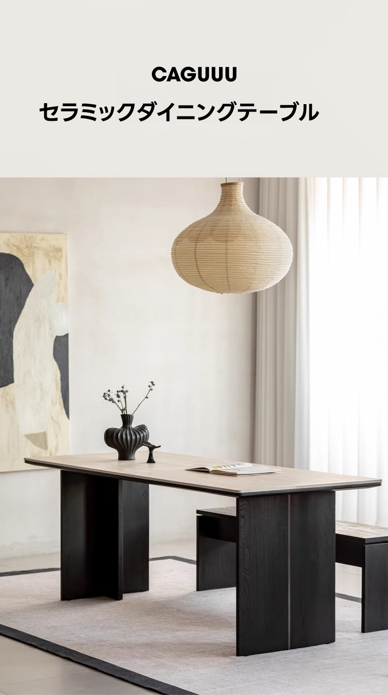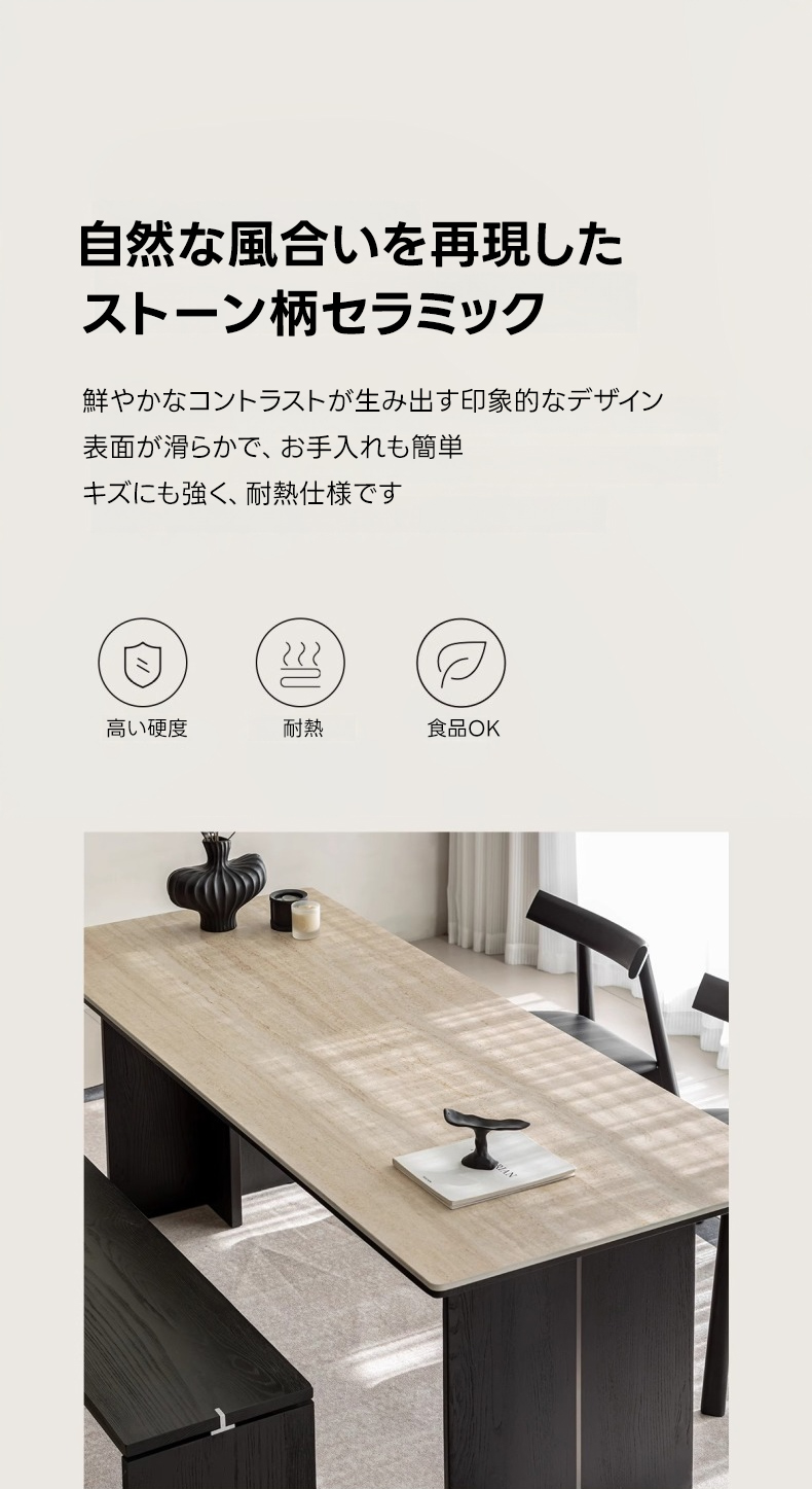 - 【洗練されたデザイン】:ジャパンディスタイルを取り入れたこのテーブルは、ブラックの木製フレームとセラミックの天板が調和し、空間に軽やかさをもたらします。T字型の脚部デザインは、見た目の美しさと機能性を両立しています。
