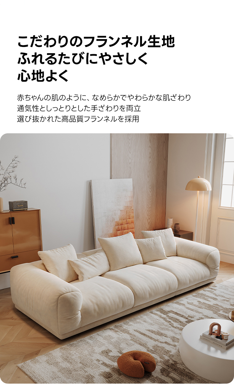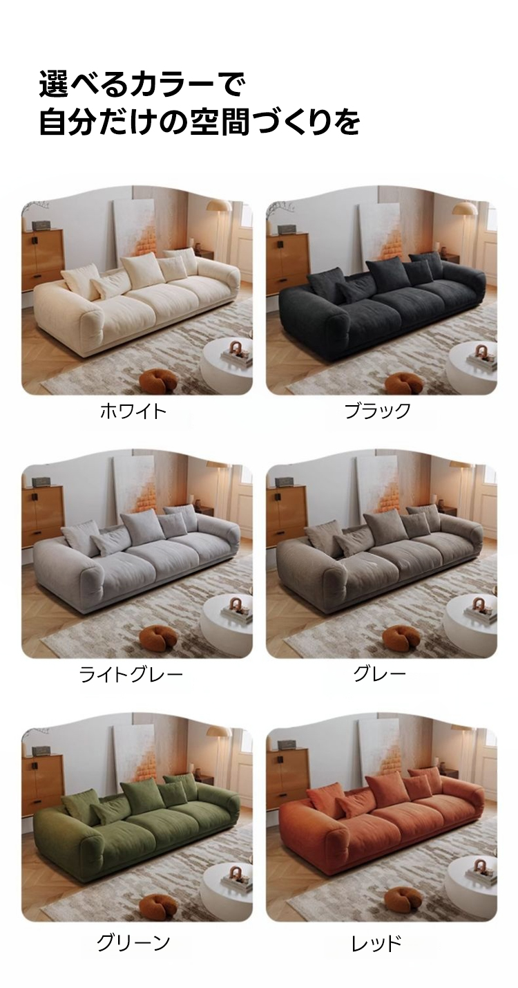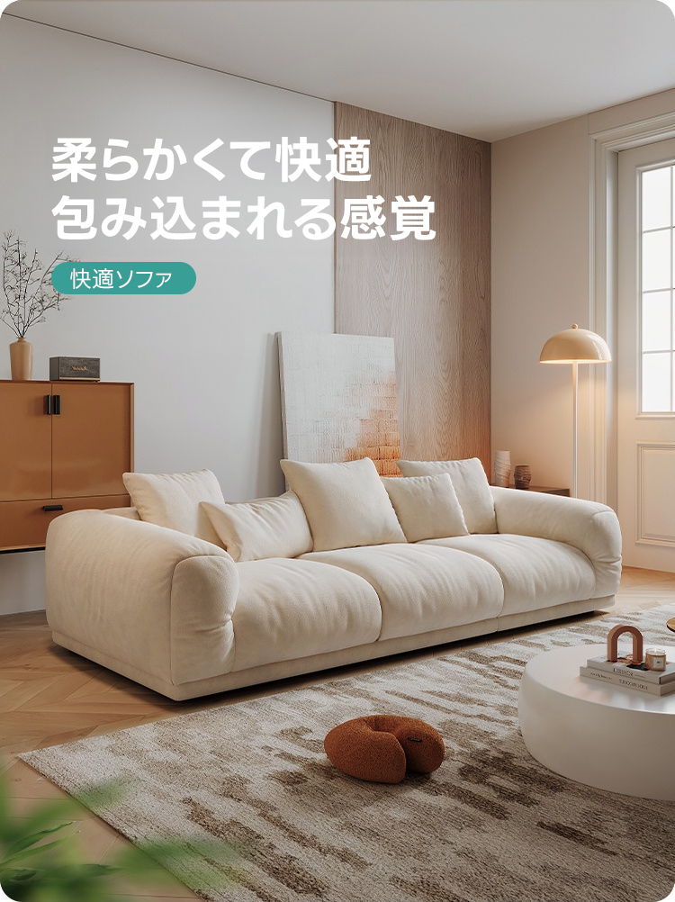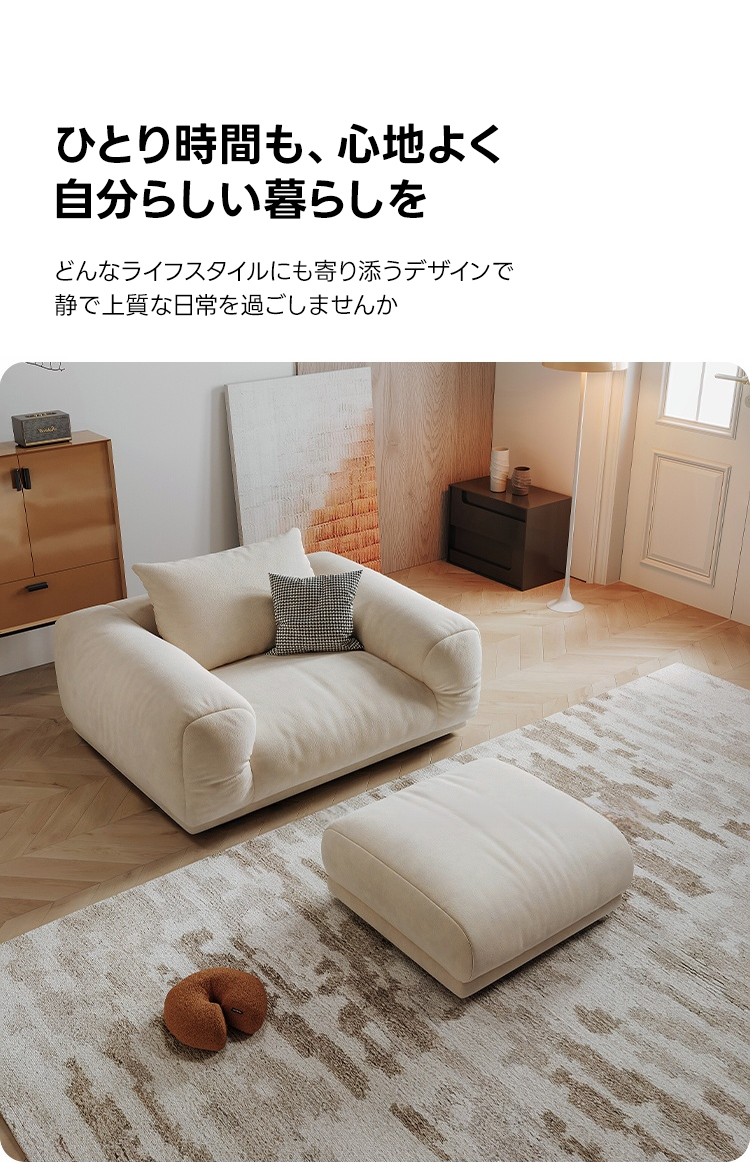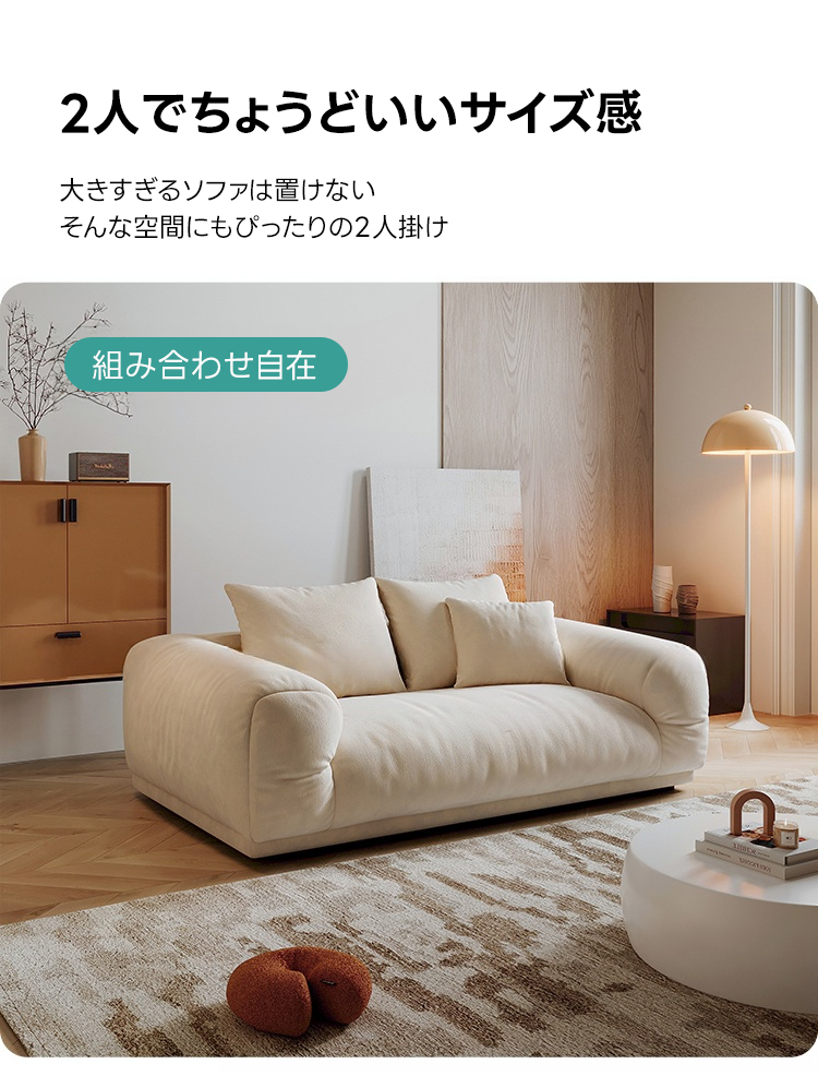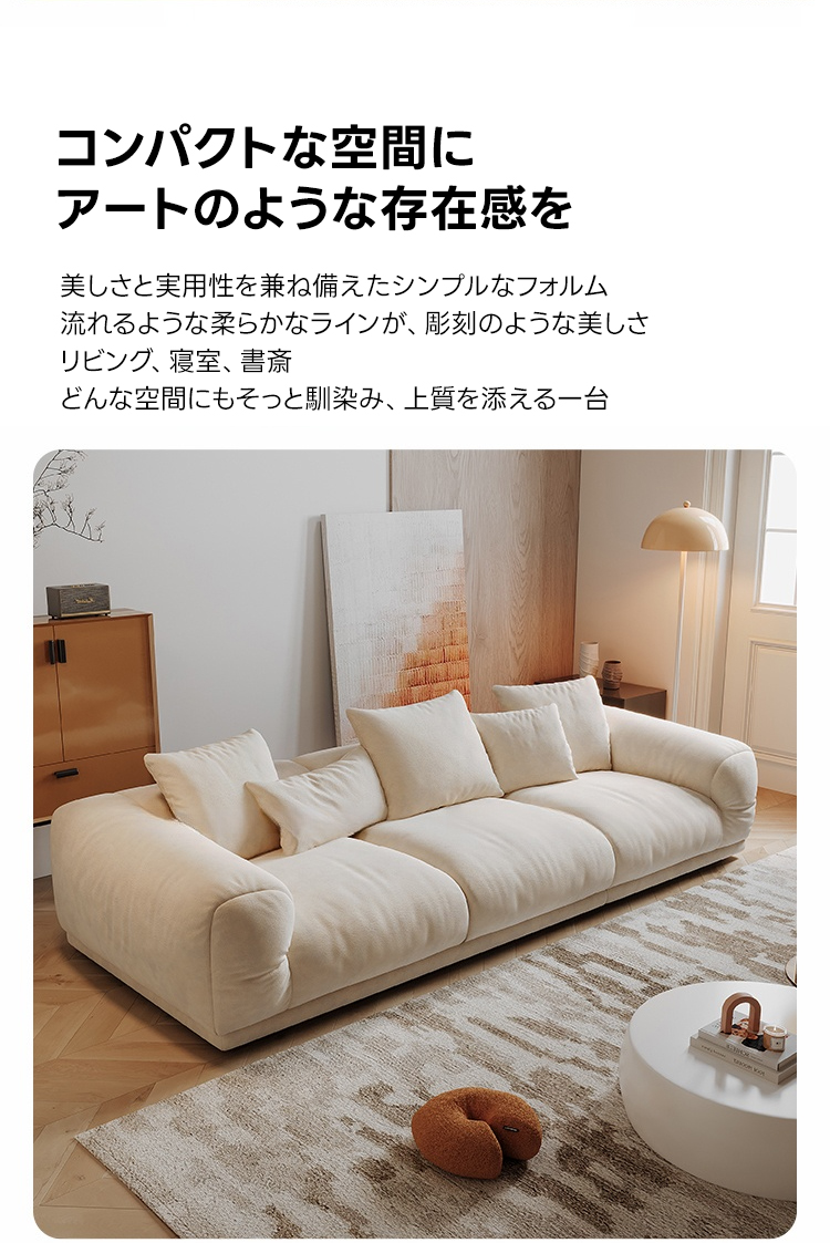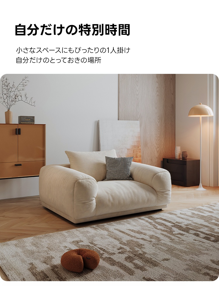 - 【多様なサイズとデザイン】:コンパクトな一人掛けからゆったりとした三人掛け、大型ソファまで、さまざまなサイズ展開があり、どんな空間にもフィットします。パステルホワイトのカラーはどんなインテリアにも調和し、リビングや寝室、書斎など多様なシーンで活躍します。