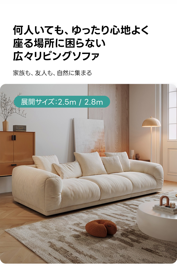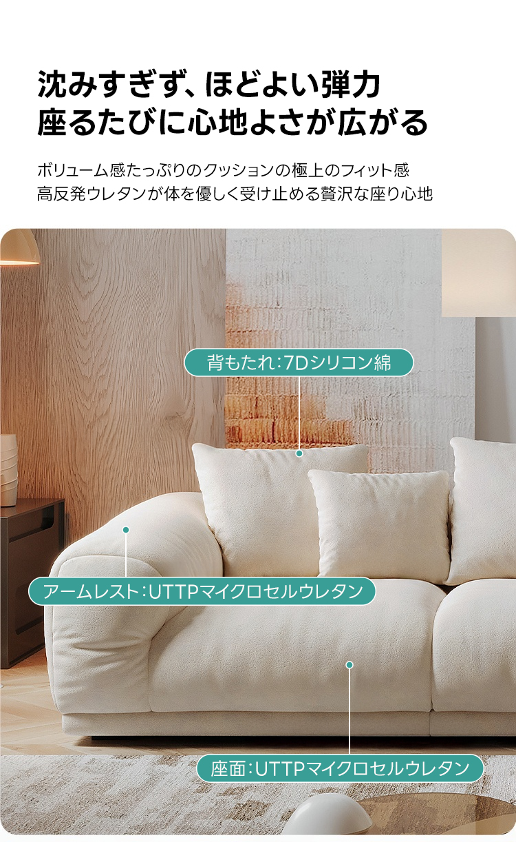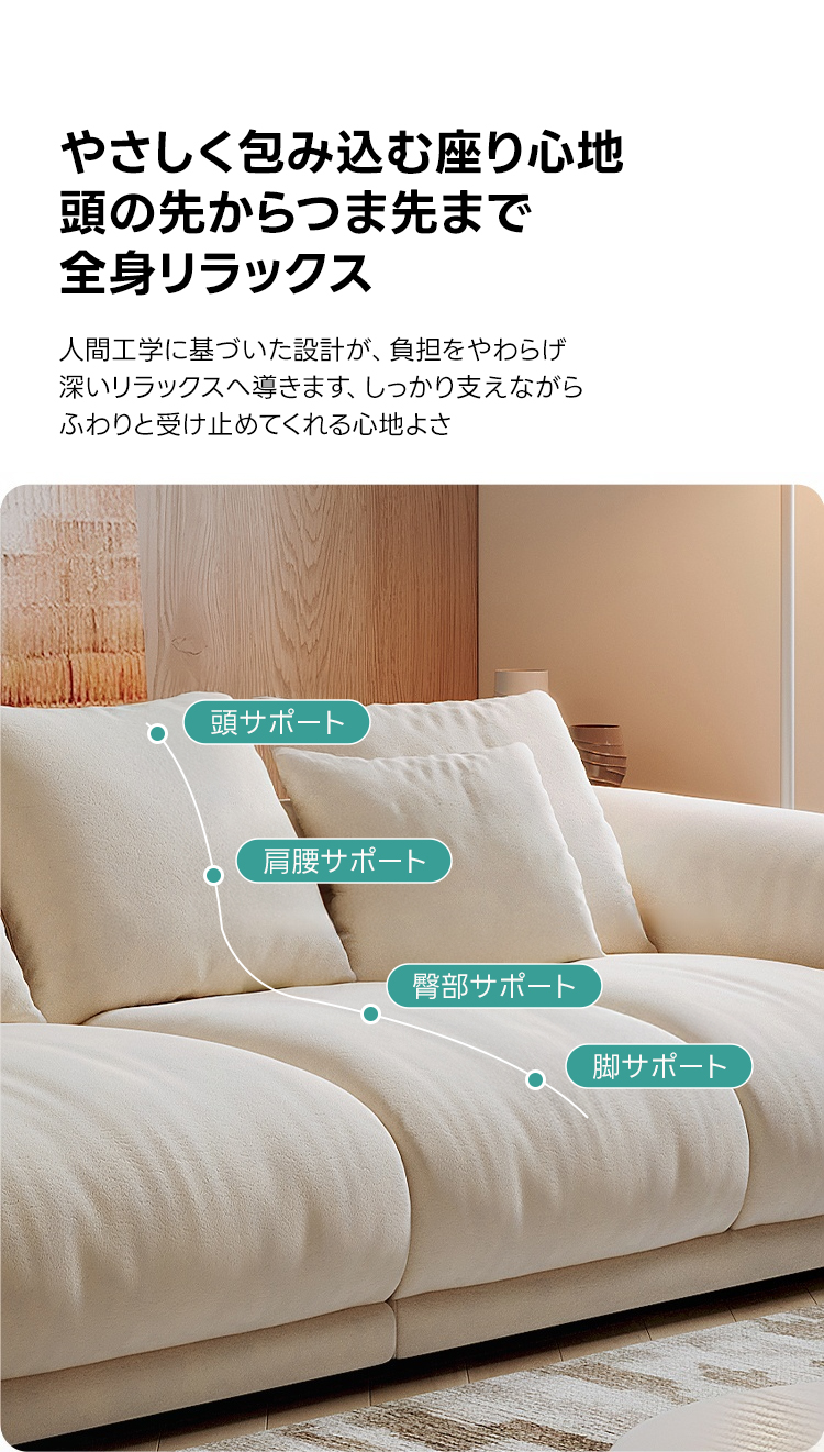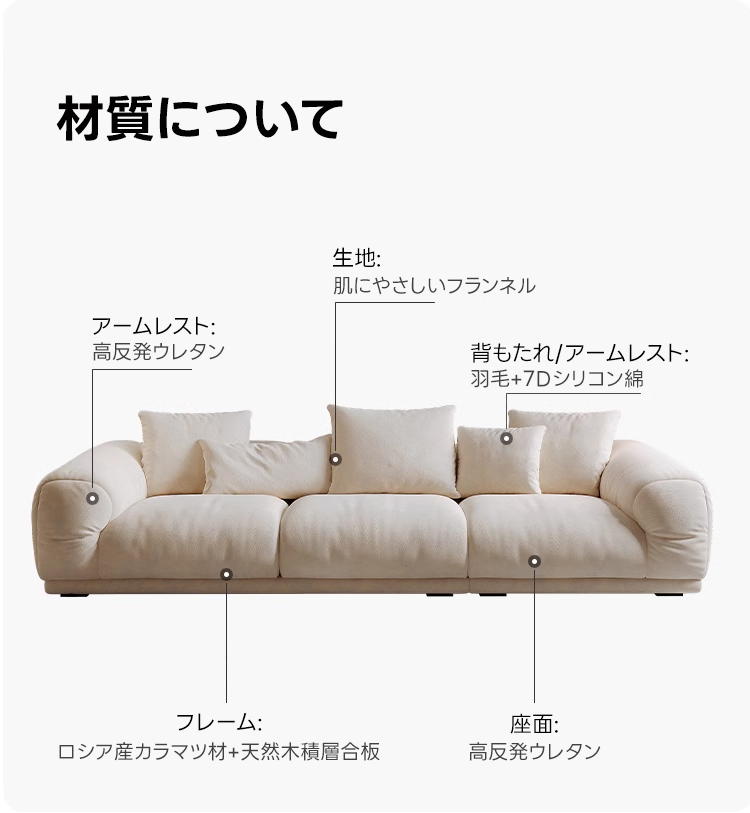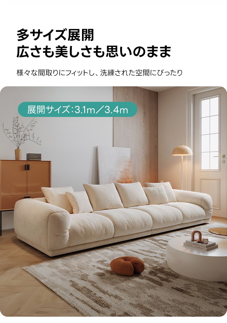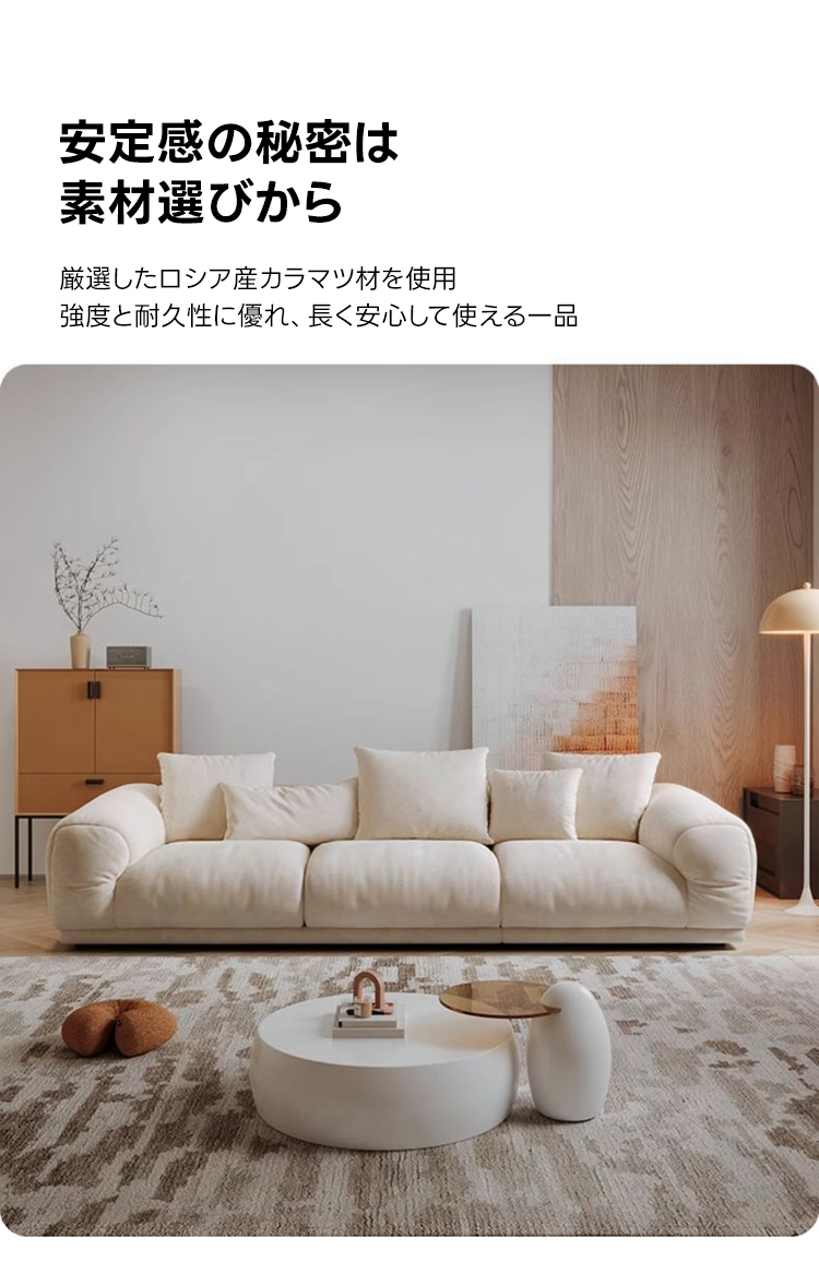 - 【多様なサイズとデザイン】:コンパクトな一人掛けからゆったりとした三人掛け、大型ソファまで、さまざまなサイズ展開があり、どんな空間にもフィットします。パステルホワイトのカラーはどんなインテリアにも調和し、リビングや寝室、書斎など多様なシーンで活躍します。