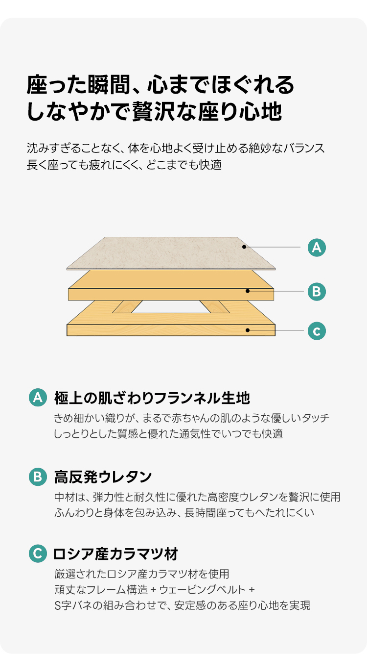 - 【高品質な素材と人間工学】:ソファの表面には、滑らかで柔らかなフランネル生地を採用し、内部には高反発ウレタンを使用。頭からつま先まで全身を優しく包み込むデザインで、深いリラックスを実現します。背もたれには7Dシリコン綿を使用し、柔らかさとサポート力を両立。