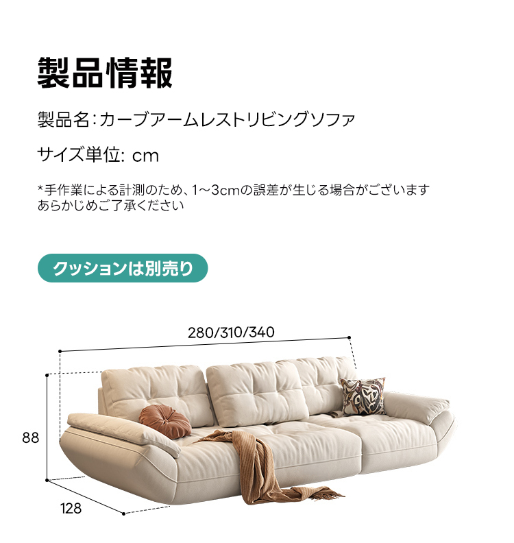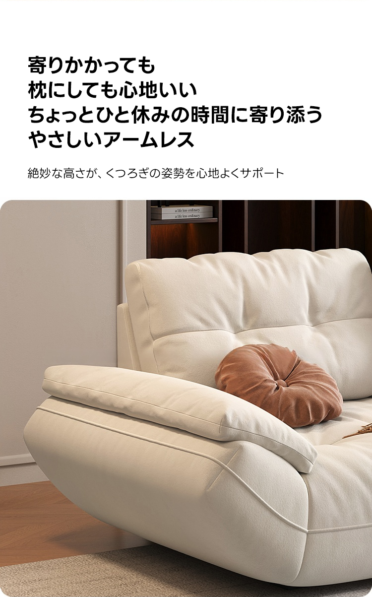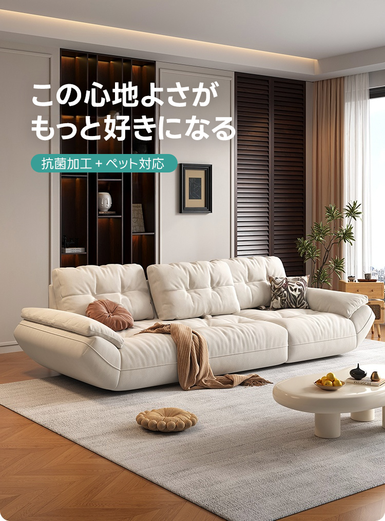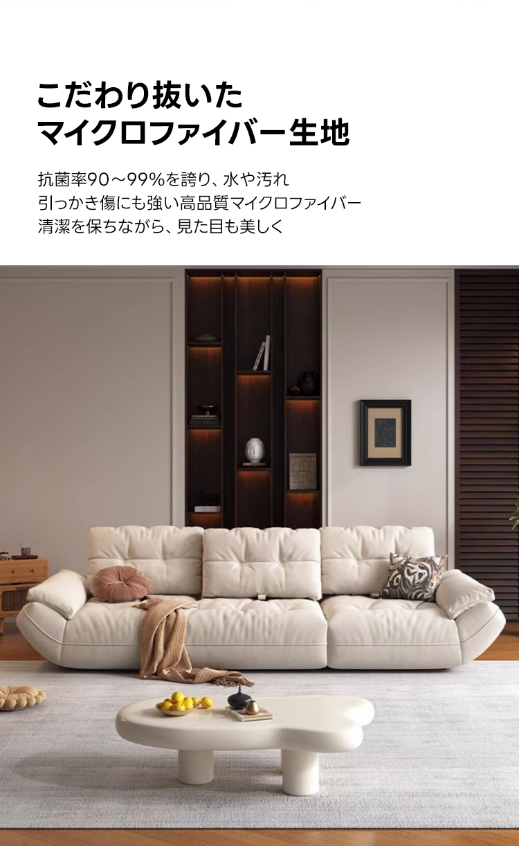 - 【シンプルモダンなデザインと多機能性】:カーブアームレストリビングソファは、シンプルモダンなデザインとパステルホワイトのカラーが特徴です。抗菌加工されたファブリックと合皮から選べ、ペットがいる家庭でも安心してお使いいただけます。
