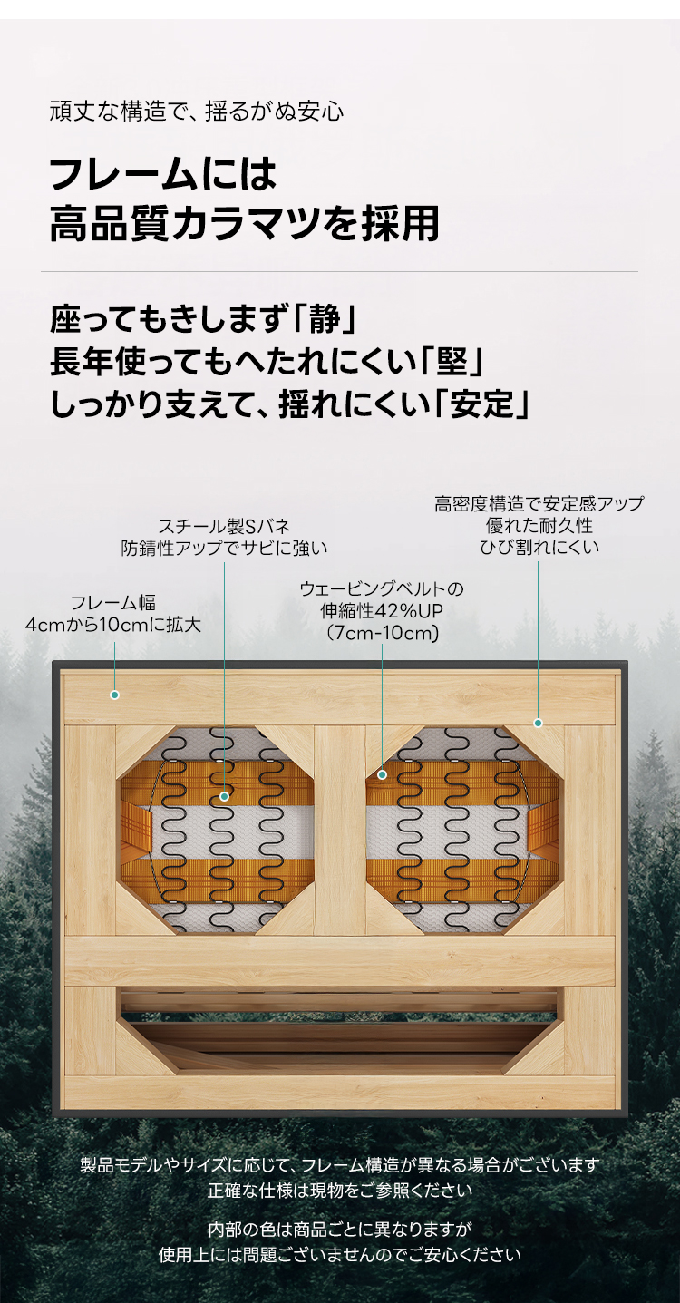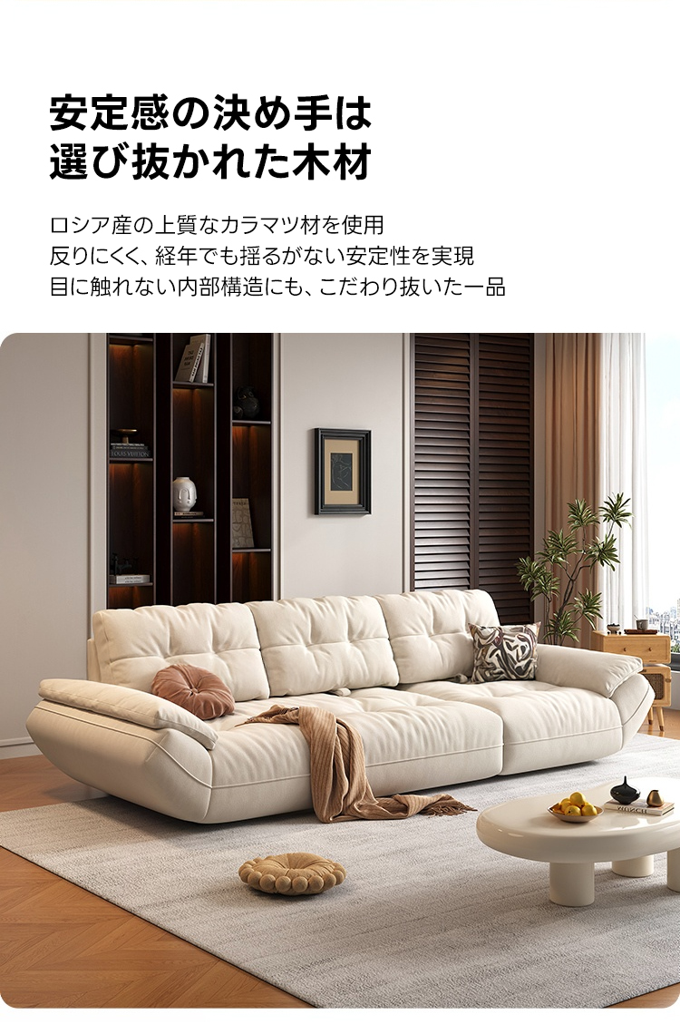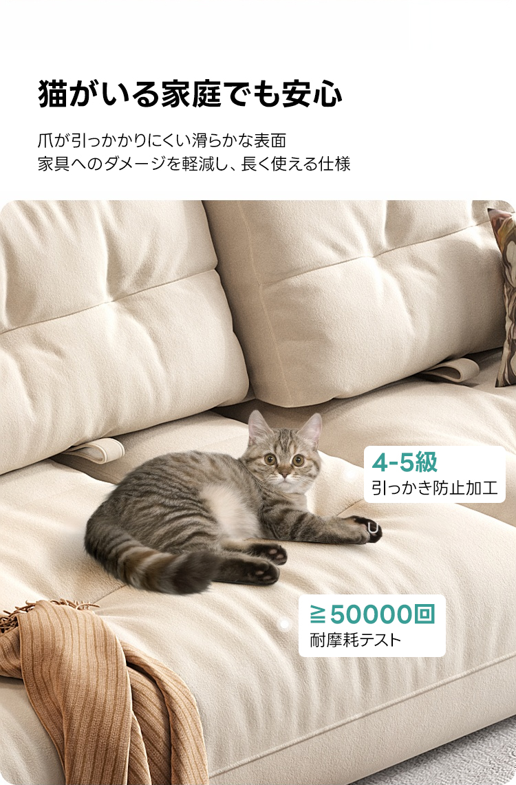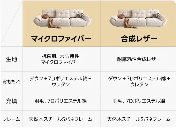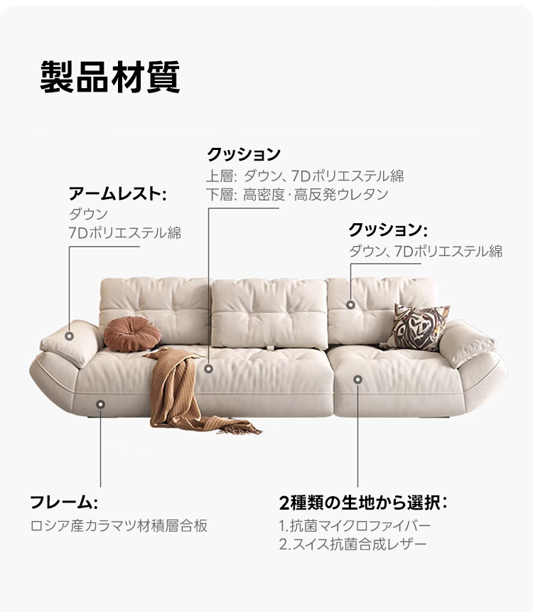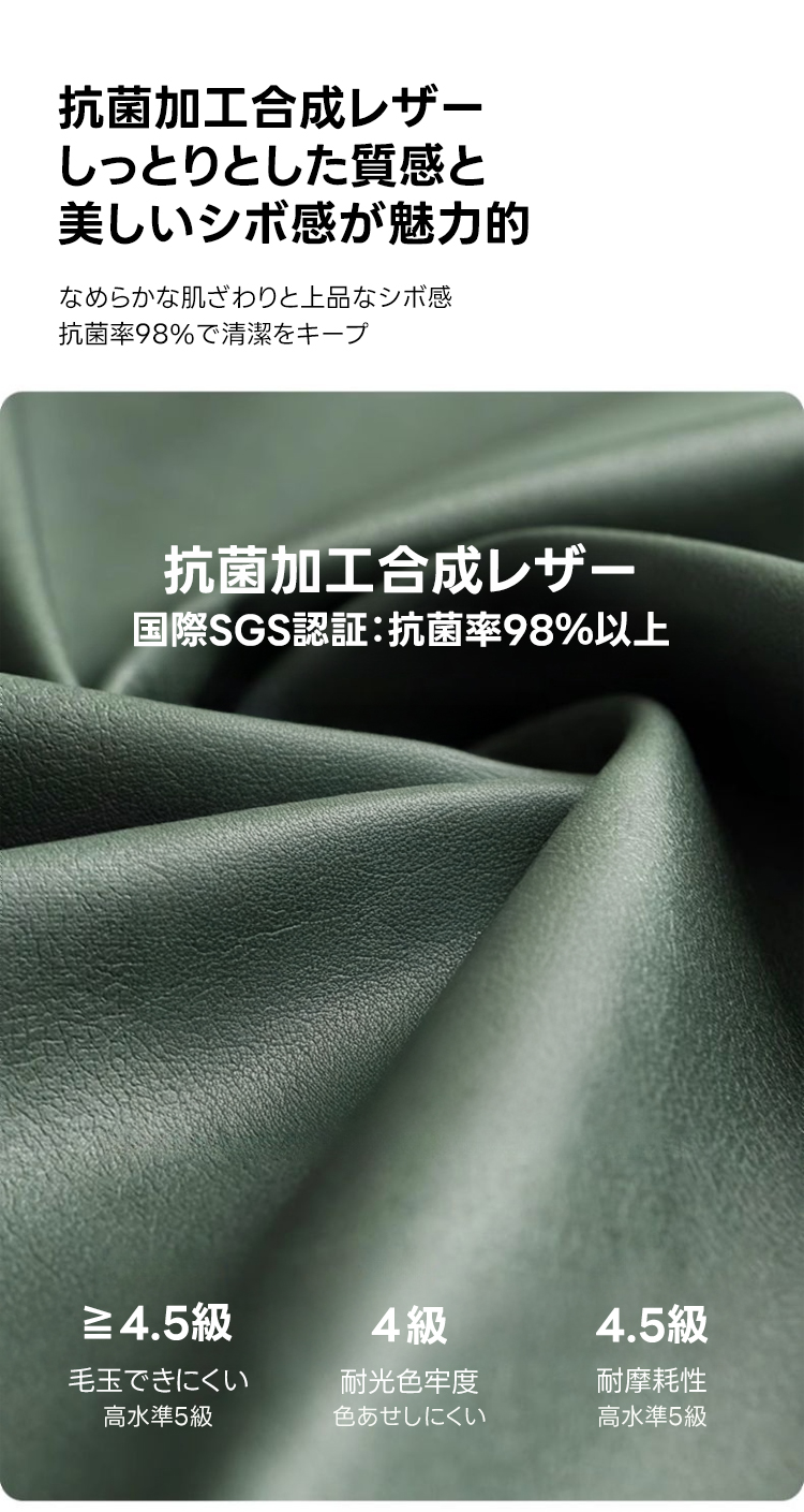 - 【高品質な素材とデザイン】:高品質なマイクロファイバー生地は抗菌率90〜99%を誇り、水や汚れに強く、ペットの毛も付きにくい仕様です。合成レザーはしっとりとした質感で、耐摩耗性に優れています。フレームにはロシア産のカラマツ材を使用しています。