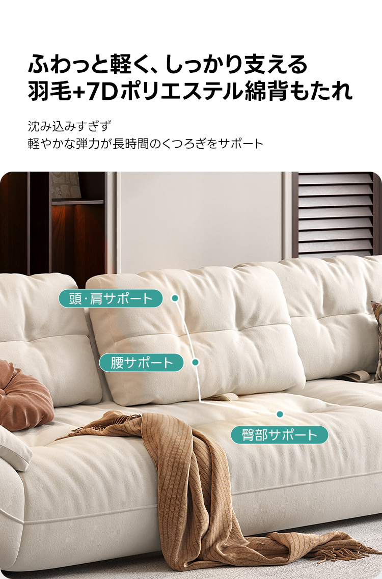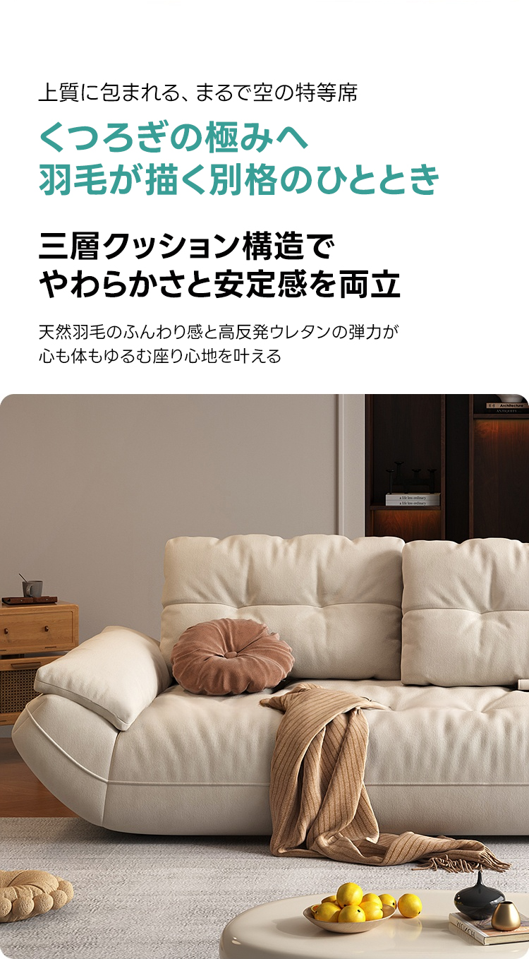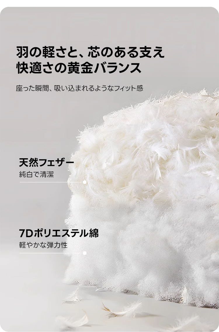 - 【快適な座り心地】:座面には7Dポリエステル綿と天然フェザーを使用し、ふんわりとした柔らかさとしっかりとしたサポートを両立しています。長時間座っても疲れにくく、快適な座り心地を提供します。