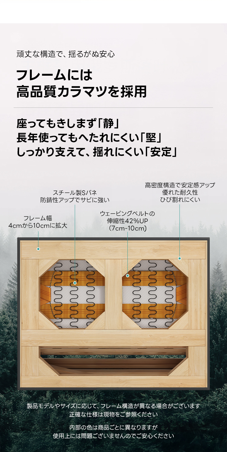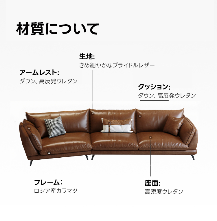 - 【高品質な素材とデザイン】高品質なフルグレインレザーを使用し、使い込むほどに味わいが増すしっとりとした質感が特徴です。フレームにはロシア産カラマツを採用し、頑丈で安定感があります。ダウンと高反発ウレタンを組み合わせたクッションは、ふんわりとした座り心地を提供し、肌にも優しいです。