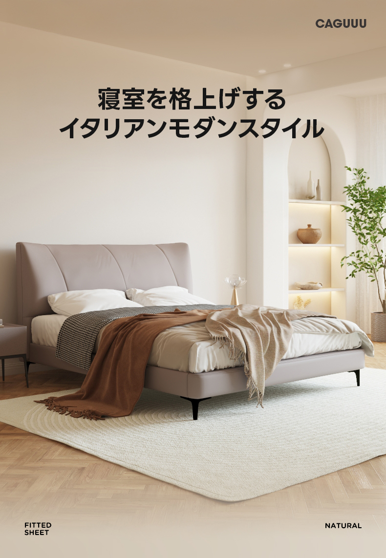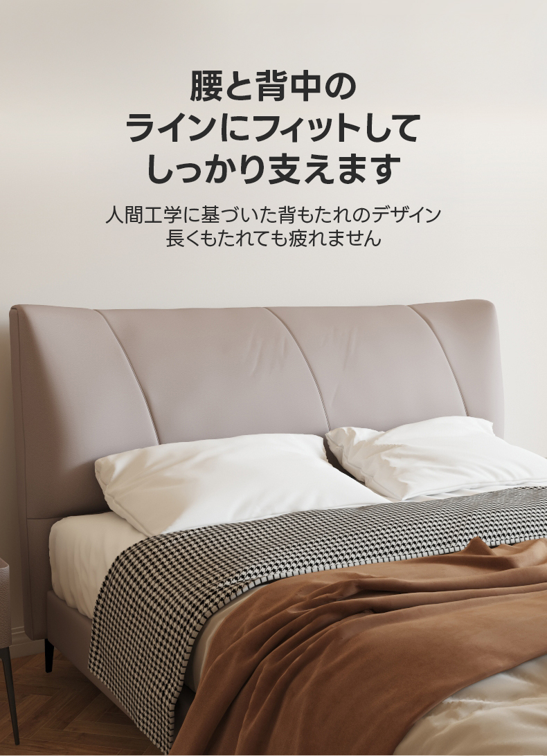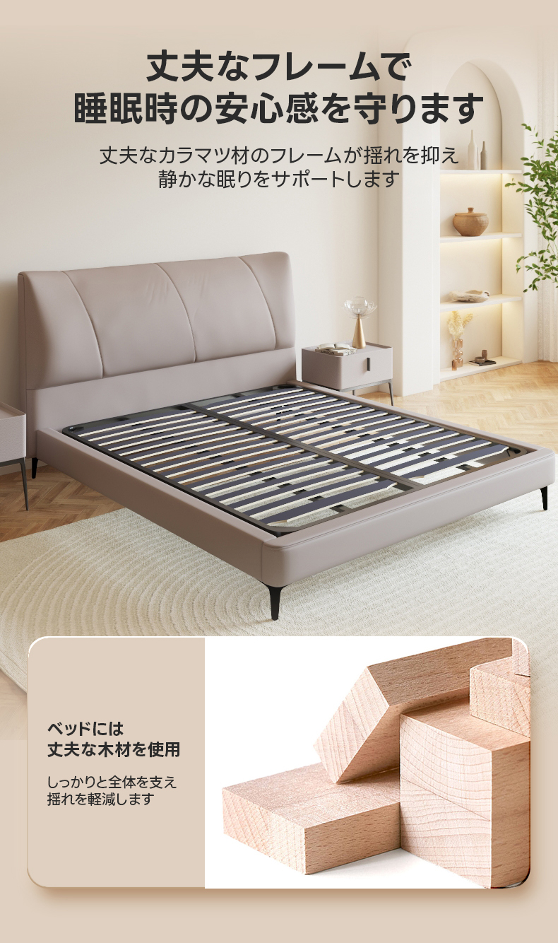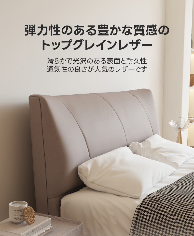 - 【高品質なトップグレインレザーと頑丈なフレーム】:滑らかで光沢のあるトップグレインレザーを使用し、耐久性と通気性に優れています。カラマツ材のフレームがしっかりと全体を支え、安定した睡眠をサポートします。