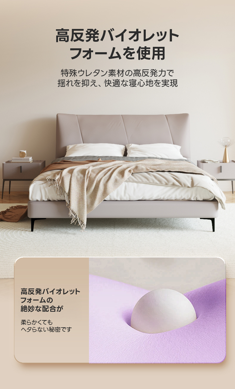 - 【快適な寝心地を実現する高反発バイオレットフォーム】:特殊ウレタン素材を使用した高反発バイオレットフォームが、揺れを抑え、快適な寝心地を提供します。寝返りの際の体圧を分散し、理想的な寝姿勢をサポートします。