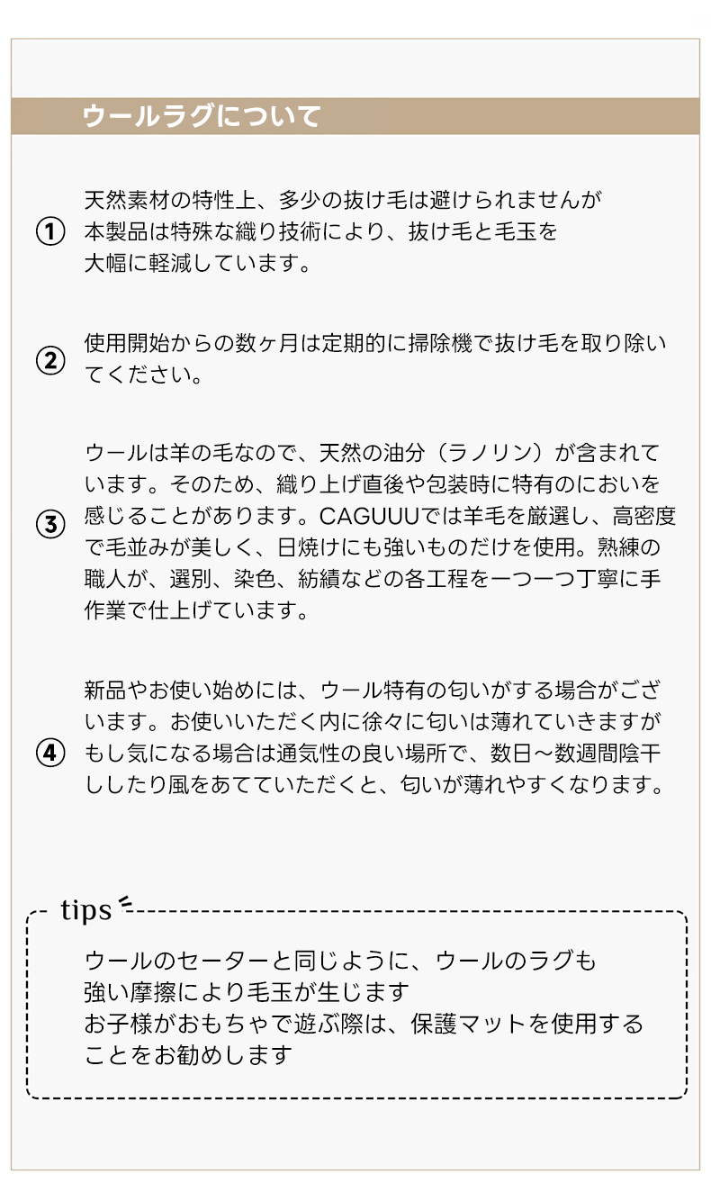 - 【安心のアフターサービス】このラグは環境に優しい素材を使用し、持続可能な製品です。購入後も安心してお使いいただけるよう、しっかりとしたアフターサービスを提供しています。