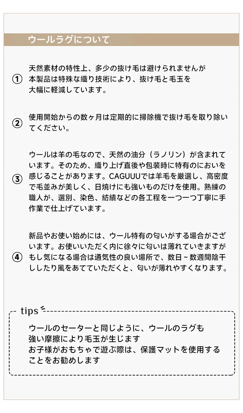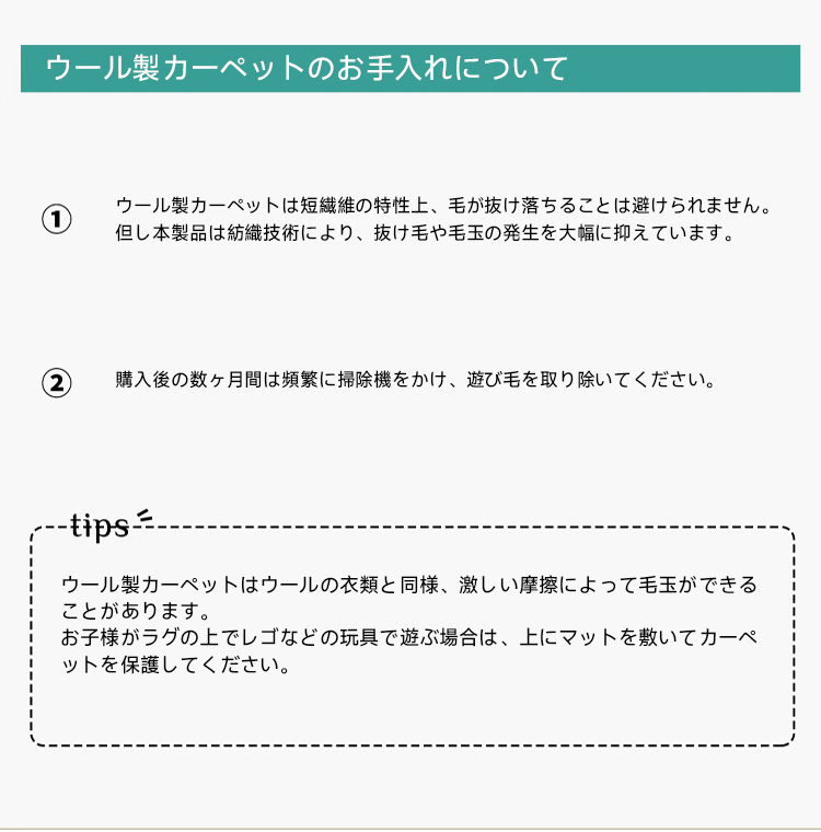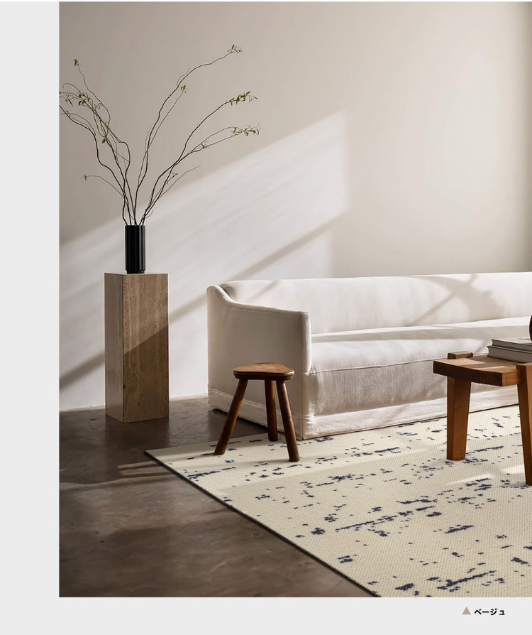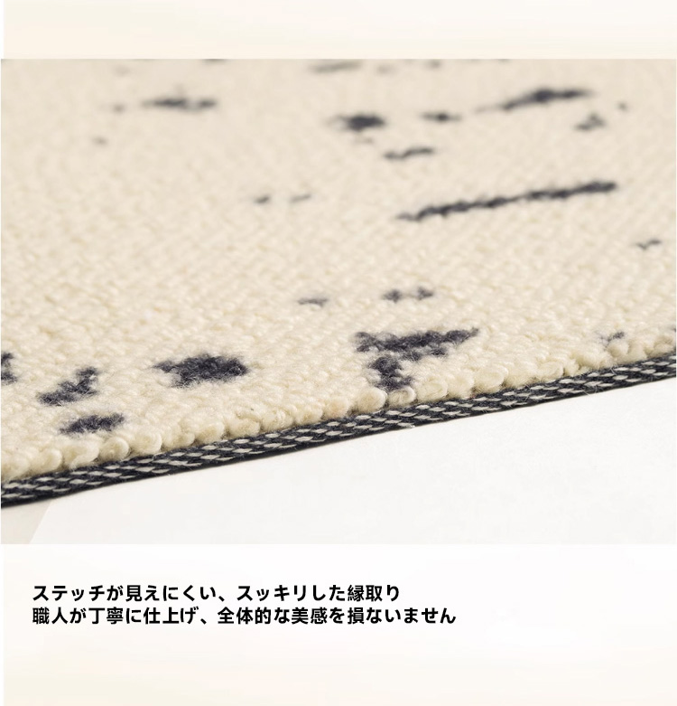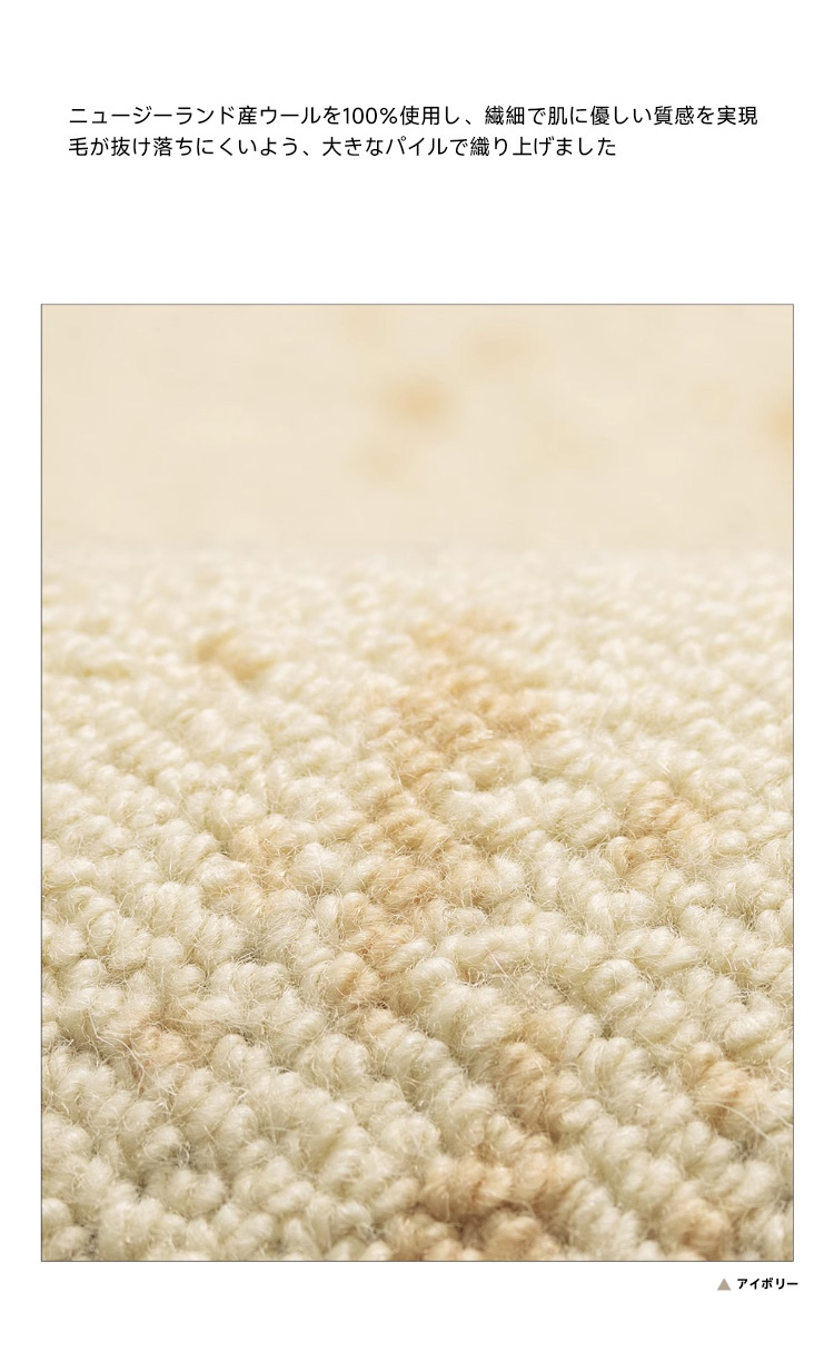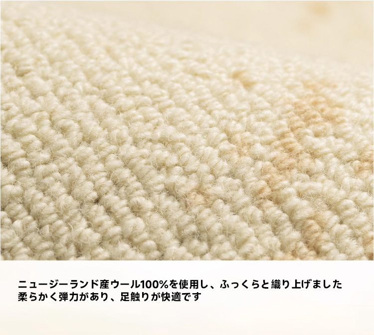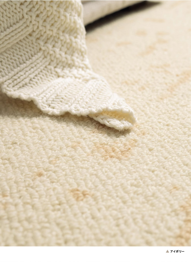 - 【簡単なお手入れ】ウールの自然な防汚効果により、日常の汚れからラグを守ります。定期的な掃除機掛けで美しさを保つことができ、メンテナンスも簡単です。