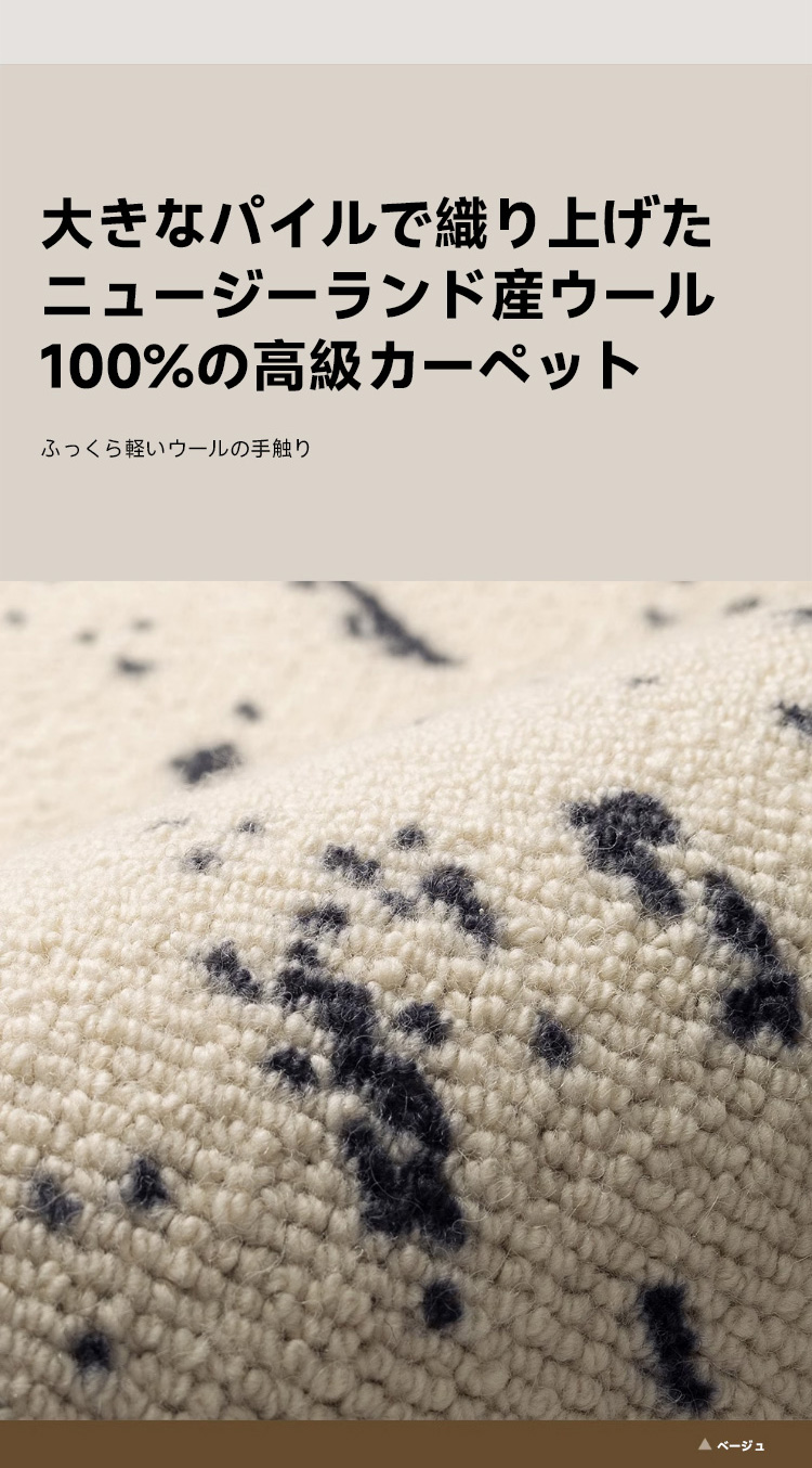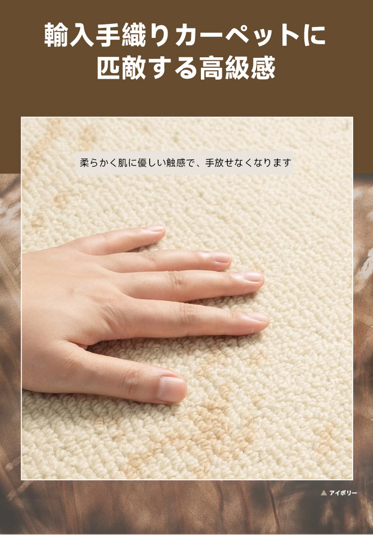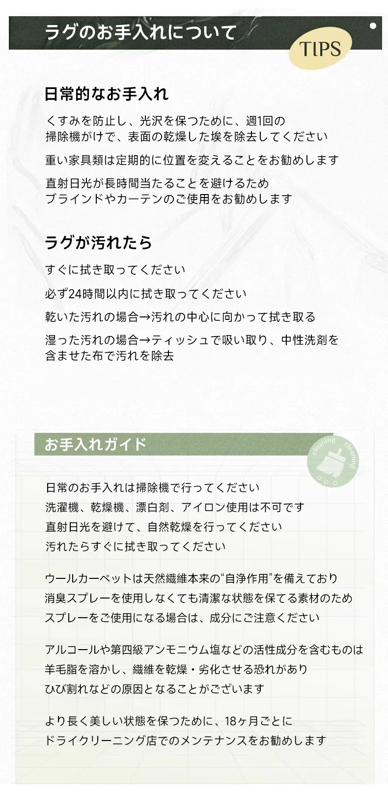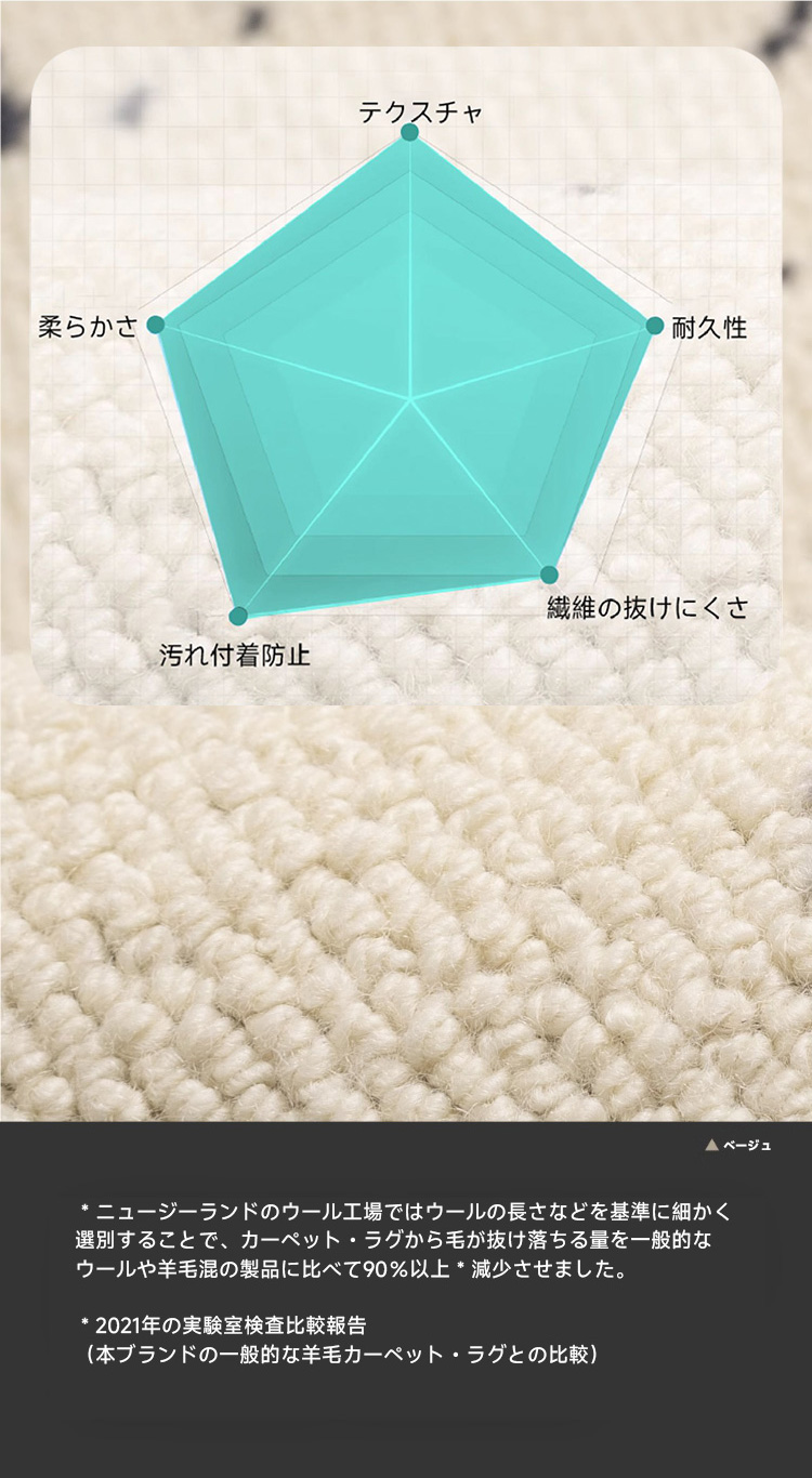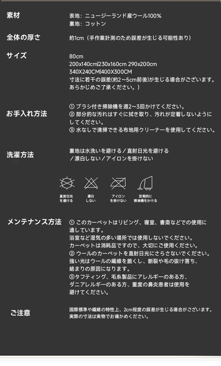 - 【簡単なお手入れ】ウールの自然な防汚効果により、日常の汚れからラグを守ります。定期的な掃除機掛けで美しさを保つことができ、メンテナンスも簡単です。