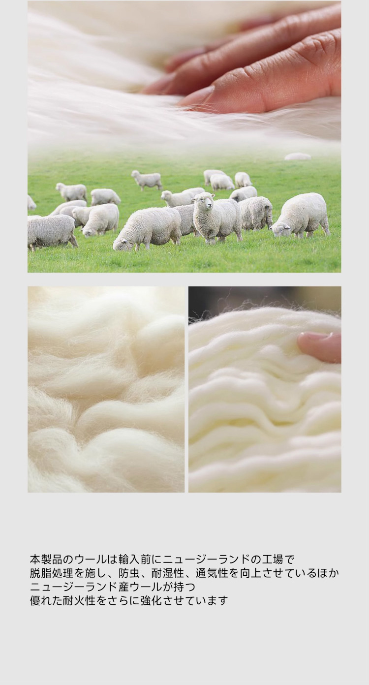 - 【環境に優しい素材】ニュージーランドの牧草地で育った羊毛を使用し、環境への配慮がされています。国際的に禁止されている殺虫剤を使用していないため、安心してご使用いただけます。