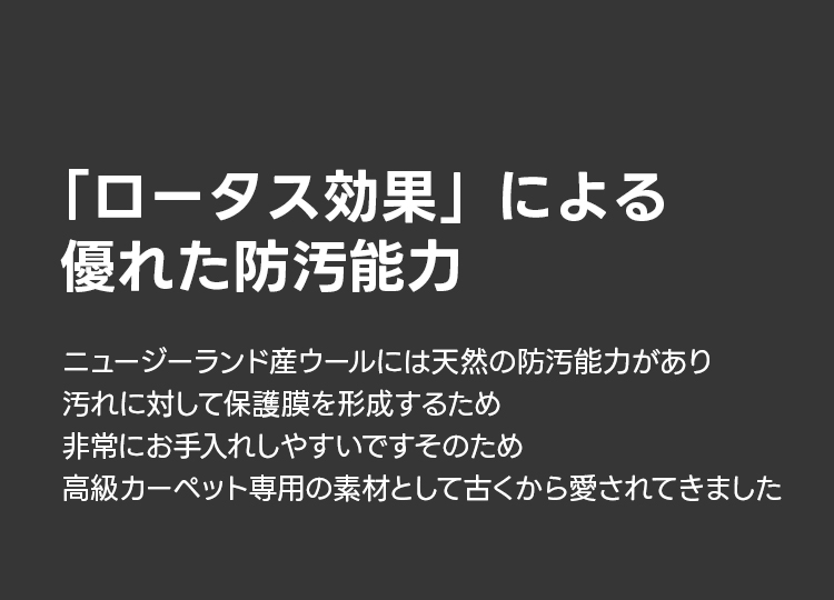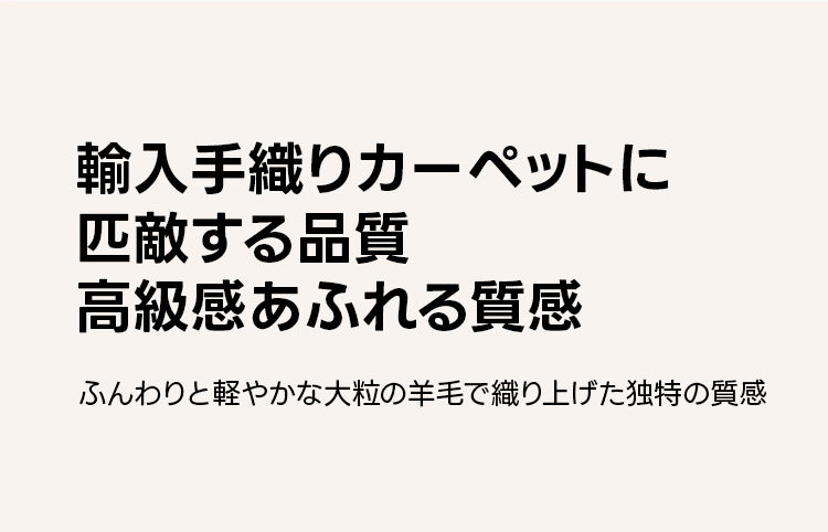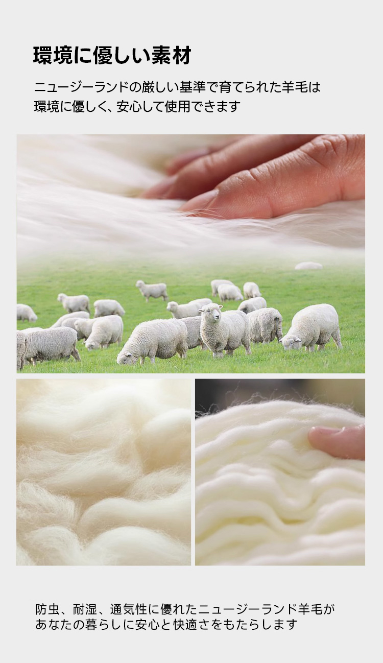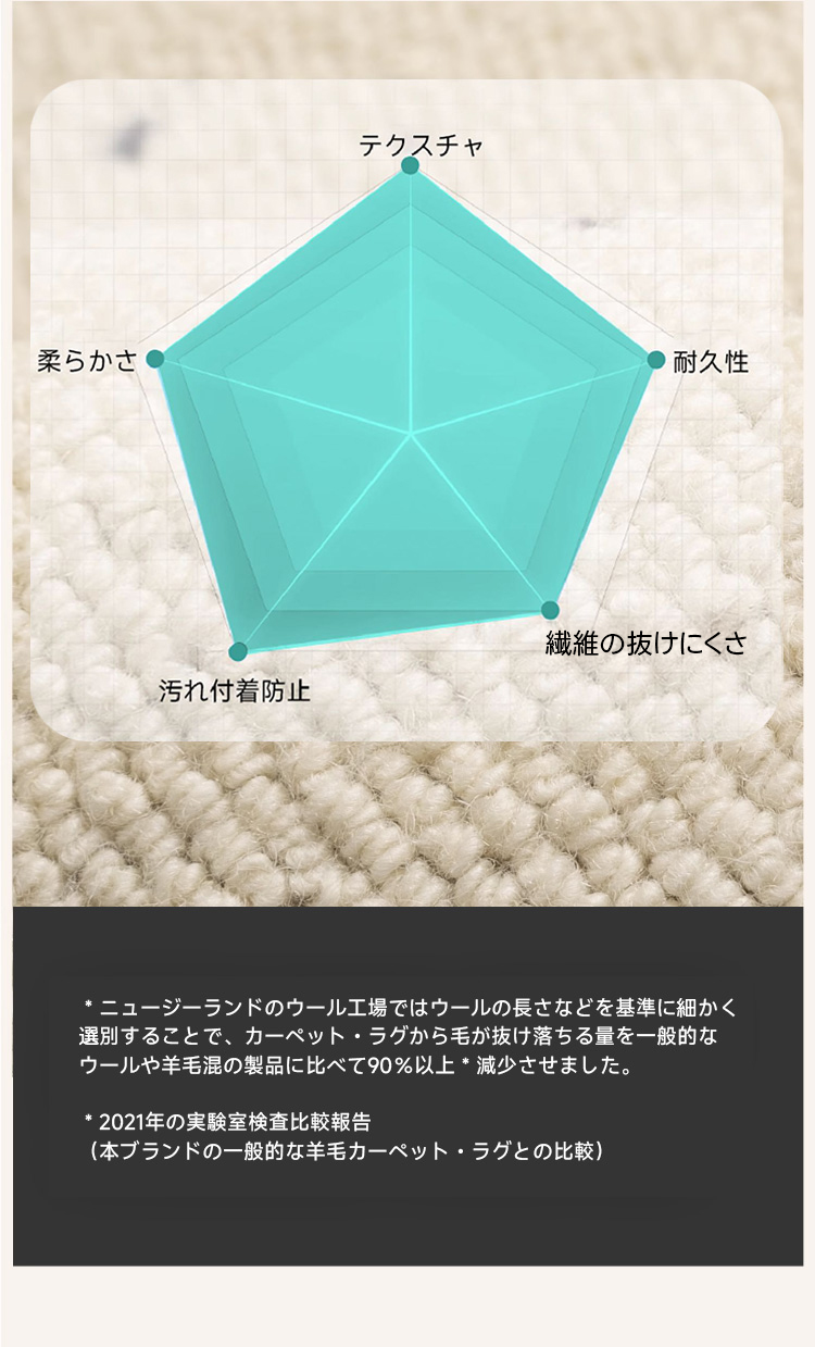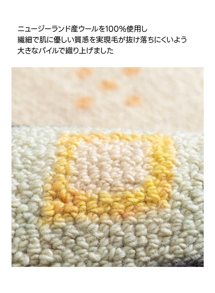 - 【高品質素材と機能性】ニュージーランド産のウールを100%使用し、柔らかく肌に優しい質感を実現。自然な抗汚性を持ち、汚れを弾くロータス効果があります。床暖房にも対応し、通気性の良い底面が床を保護します。