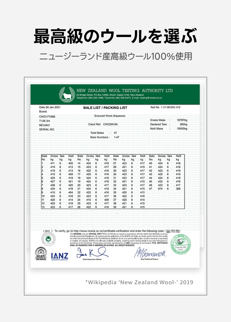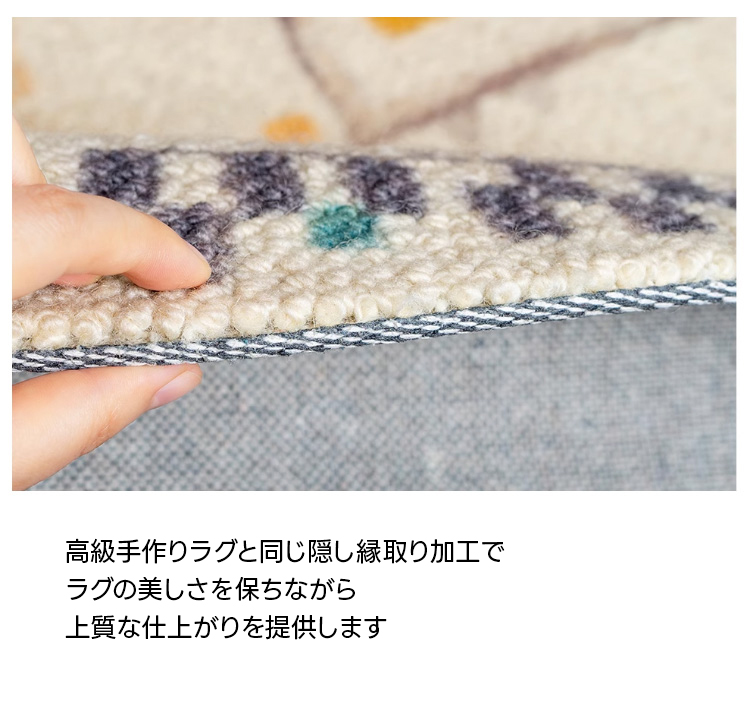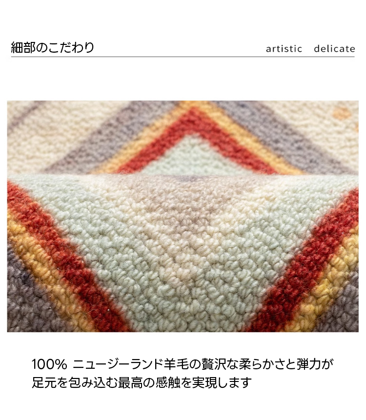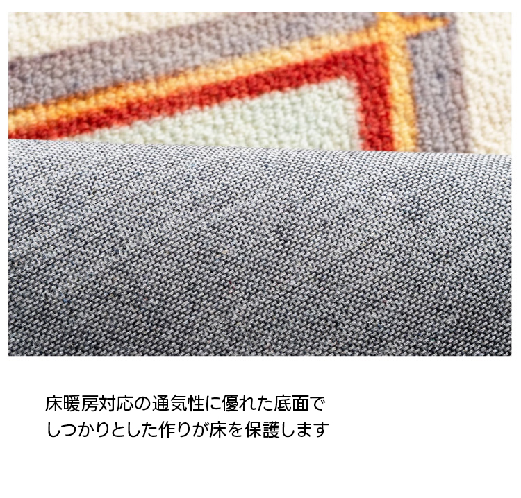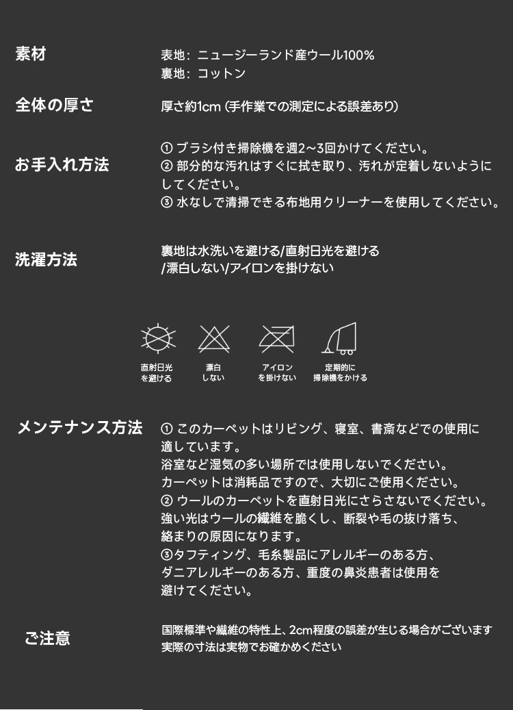 - 【高品質素材と機能性】ニュージーランド産のウールを100%使用し、柔らかく肌に優しい質感を実現。自然な抗汚性を持ち、汚れを弾くロータス効果があります。床暖房にも対応し、通気性の良い底面が床を保護します。