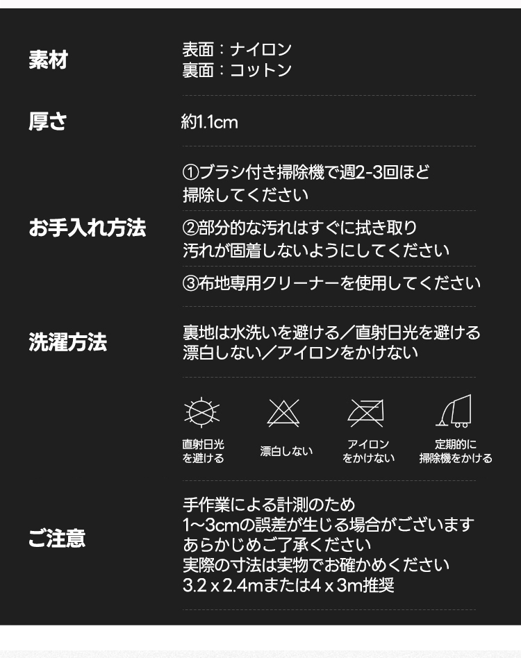 - 【安心のアフターサービス】:ラグは長く美しさを保つための手入れが簡単で、安心してお使いいただけます。お手入れ方法や使用上の注意点についても詳しくサポートいたします。