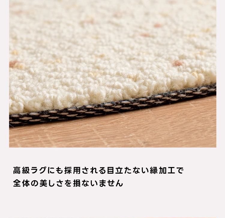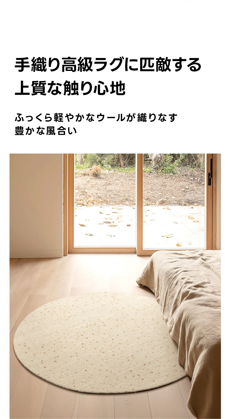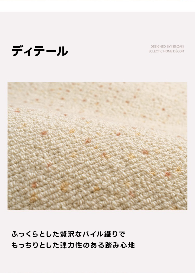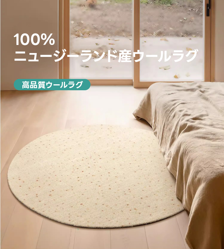 - 【柔らかい質感と高い防音性】:ニュージーランド産の高品質ウールを100%使用したラグは、柔らかくてふっくらとした質感が特徴です。厚さ約1.1cmのブークレ生地は、弾力性があり、踏み心地が良く、防音性を備えています。