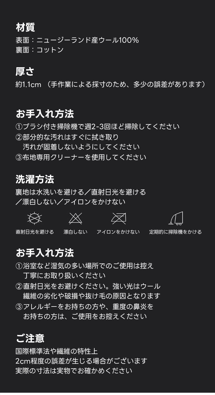- 【快適な生活空間を実現】:ウールの自然な防汚性と撥水性により、手入れが簡単で、清潔さを保てます。足元を暖かく保ち、リラックスした雰囲気を作り出します。