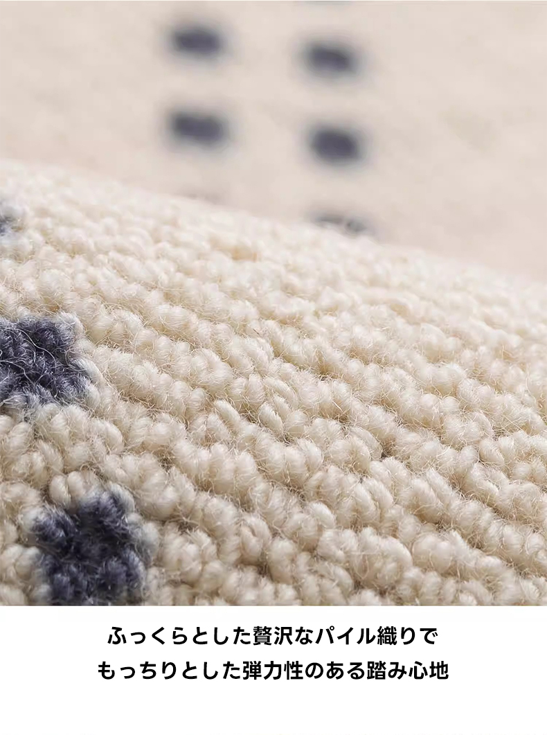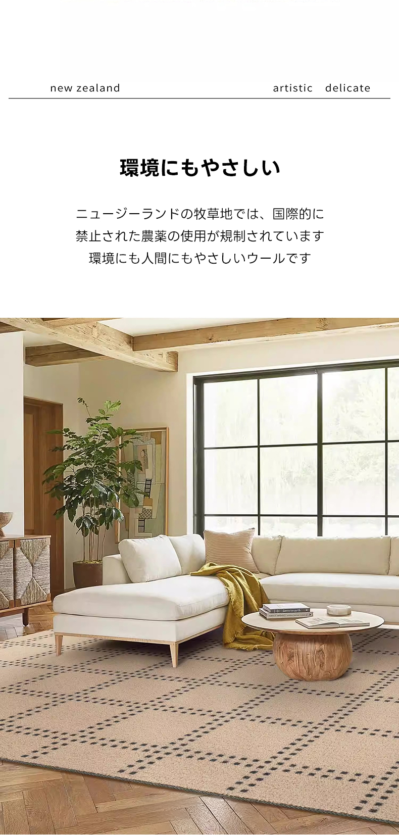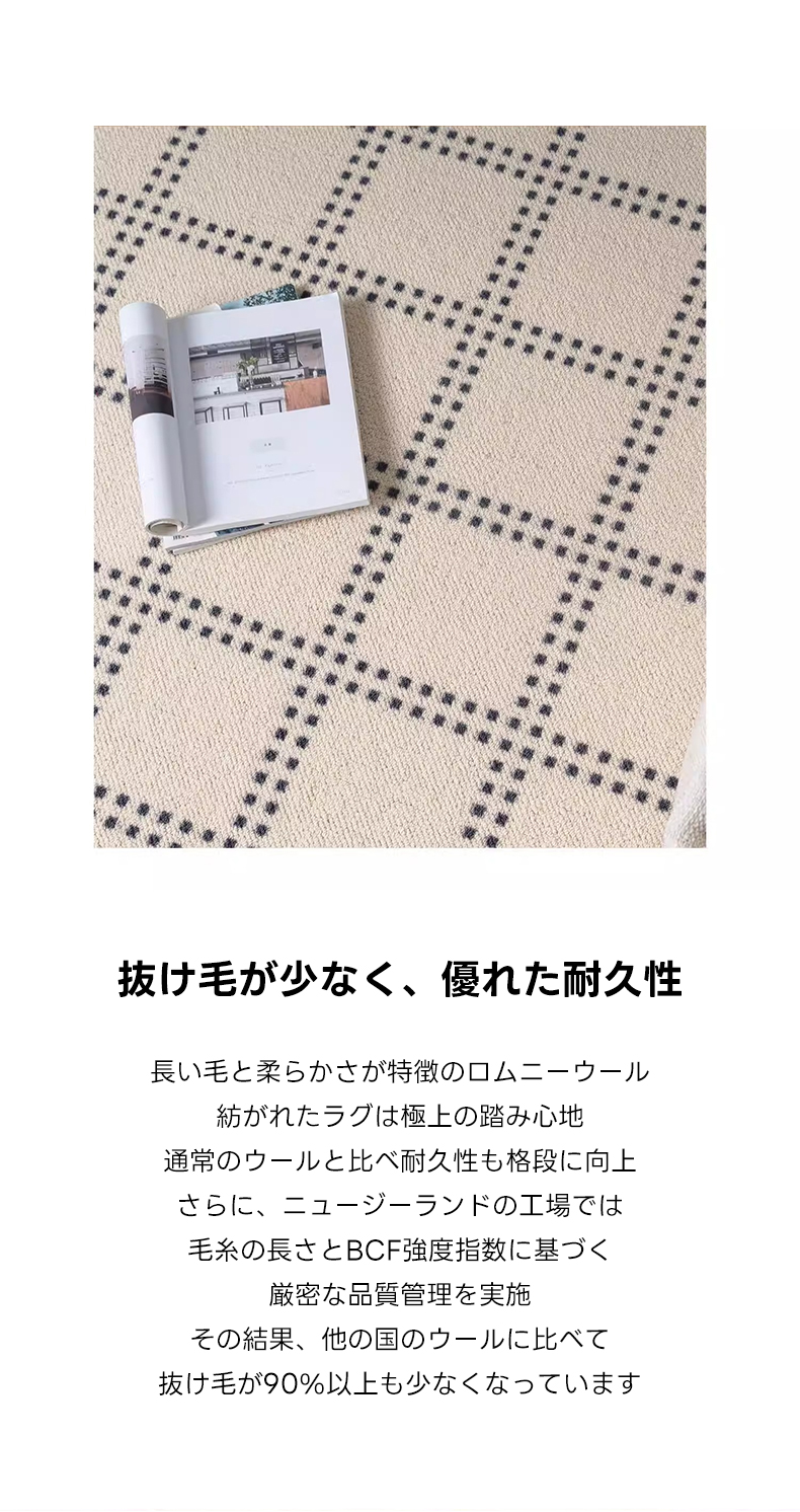 - 【高級ウール素材の贅沢な感触】ニュージーランド産の最高級ウールを100%使用したラグは、厚さ約1.1cmのパイル織りで、ふっくらとした弾力性があり、足元に心地よい感触を提供します。防汚性能と撥水効果により、清潔な状態を長く保ちます。