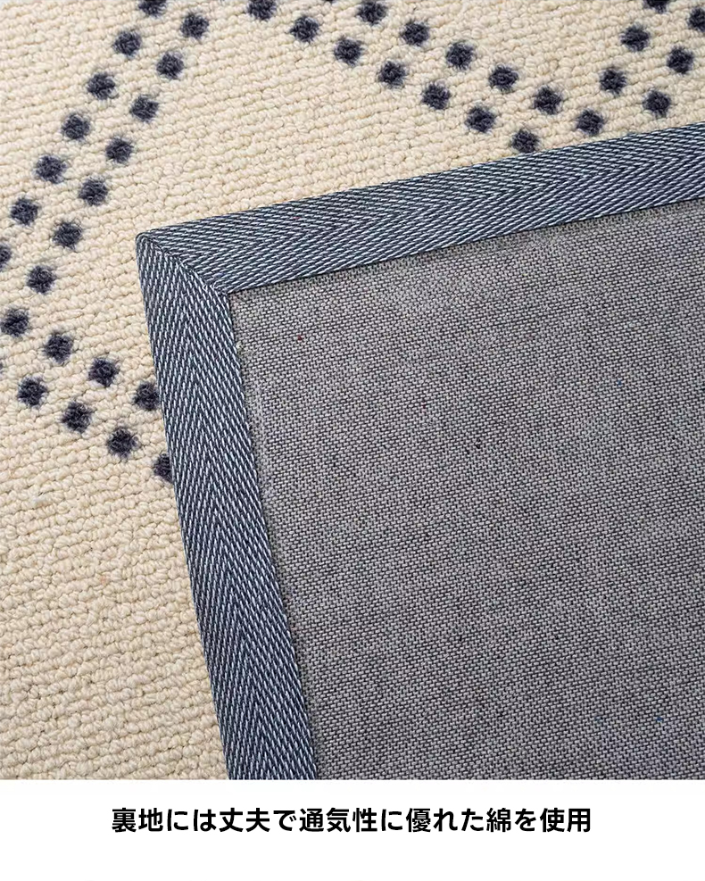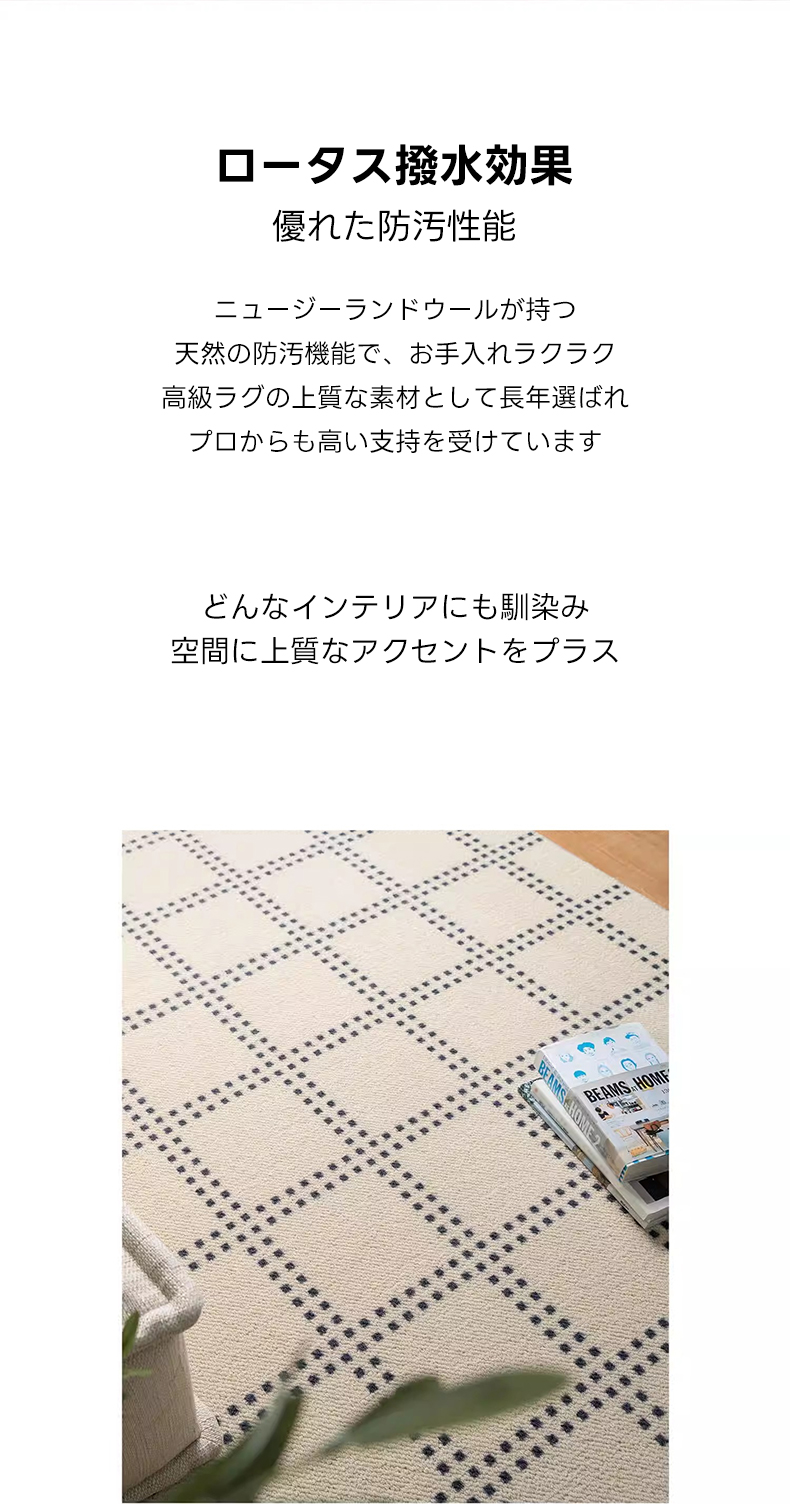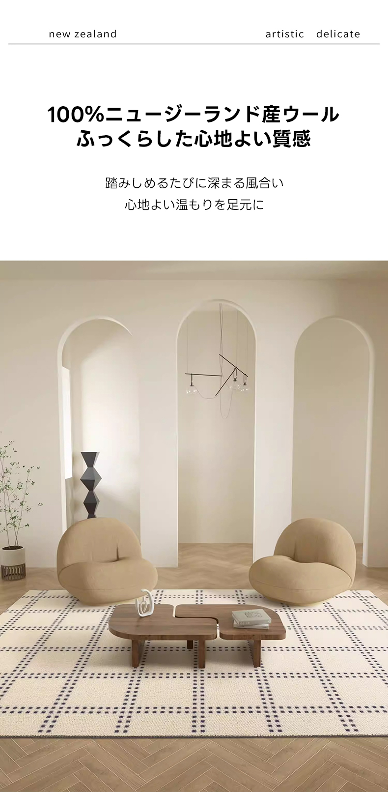 - 【高級ウール素材の贅沢な感触】ニュージーランド産の最高級ウールを100%使用したラグは、厚さ約1.1cmのパイル織りで、ふっくらとした弾力性があり、足元に心地よい感触を提供します。防汚性能と撥水効果により、清潔な状態を長く保ちます。