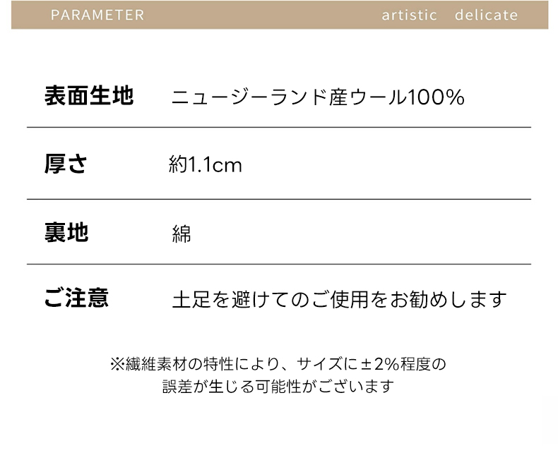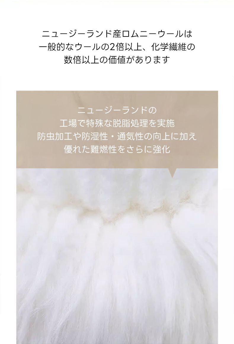 - 【耐久性と快適性の両立】抜け毛が少なく、長期間使用しても美しい状態を保ちます。通常のウールに比べて耐久性が格段に向上しており、長く快適にお使いいただけます。