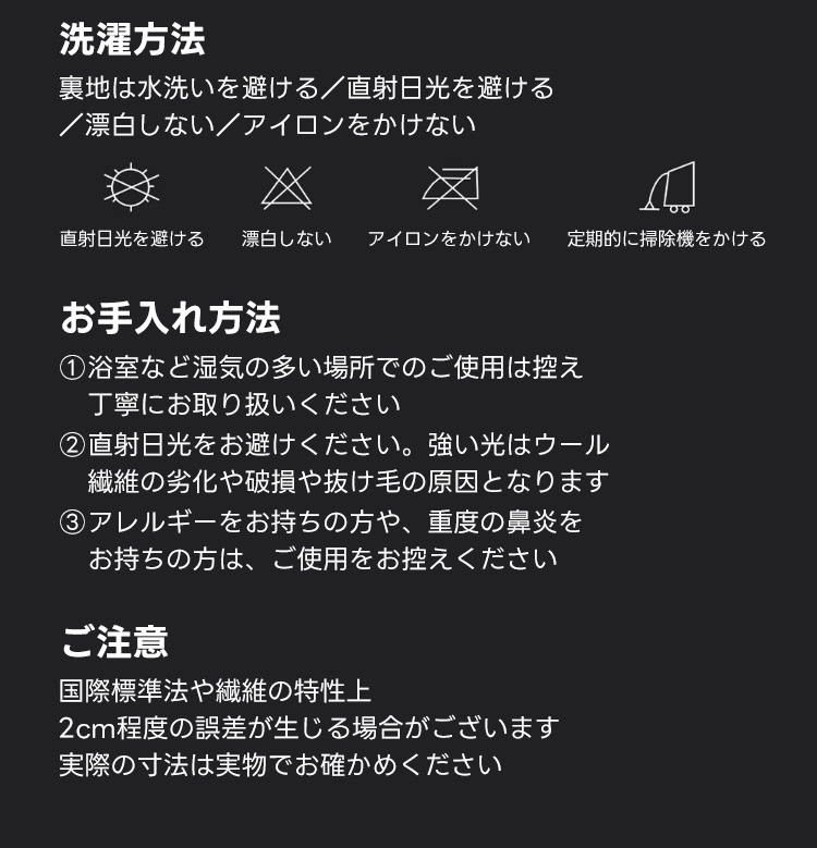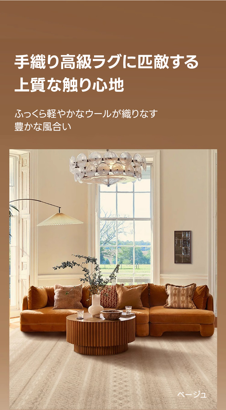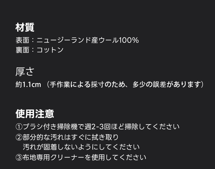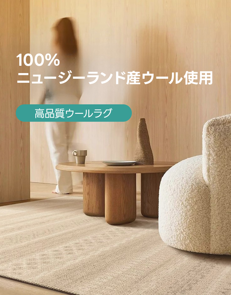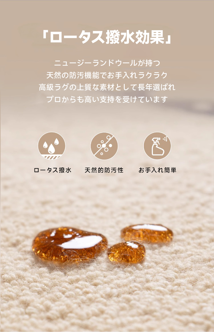 - 【高品質素材とデザイン】ニュージーランドウールの自然な防汚性と撥水効果を活かし、日常のお手入れも簡単。通気性に優れたコットン裏地で床暖房にも対応。