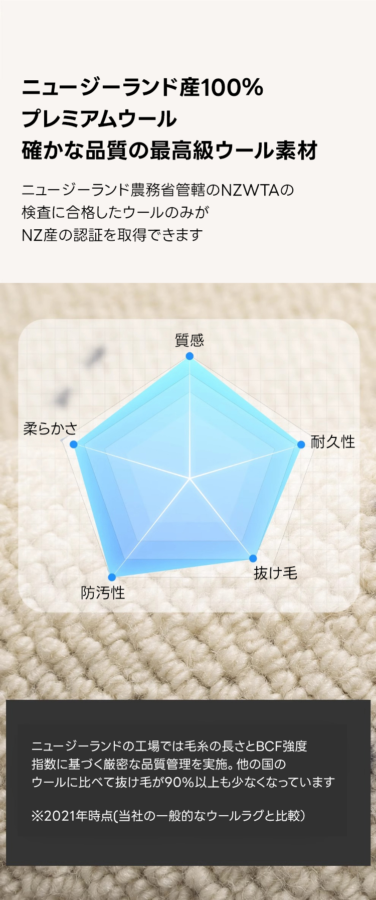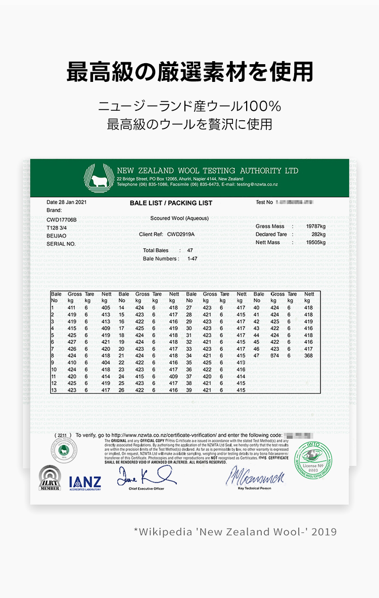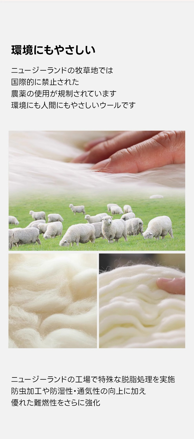 - 【環境に優しい素材】ニュージーランドの牧草地で育った羊から採取されたウールは、環境にも人間にも優しい素材です。特殊な脱脂処理を施し、防虫加工や防湿性、通気性を向上させています。