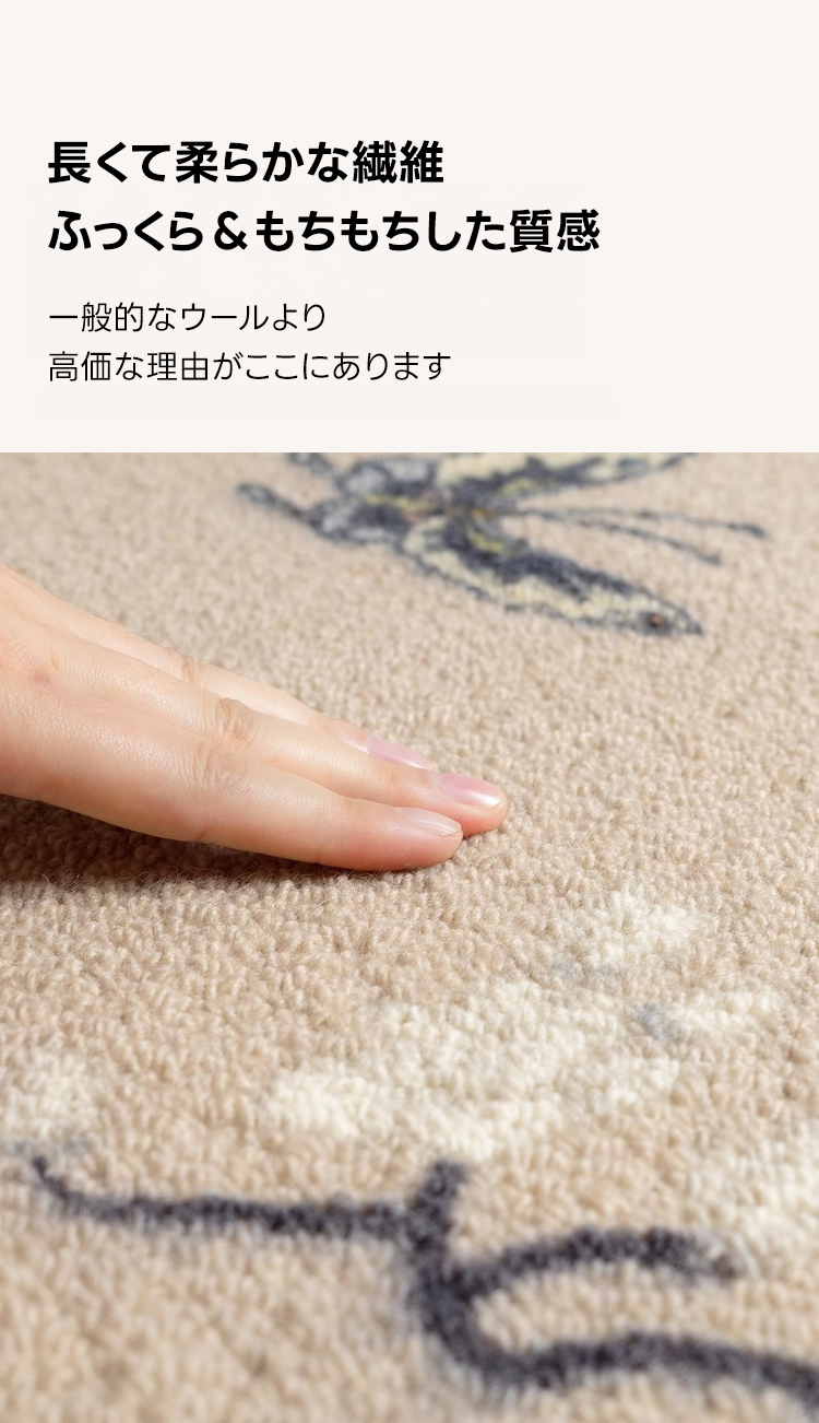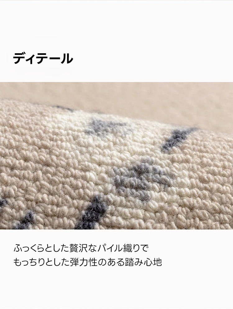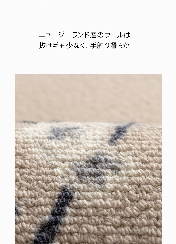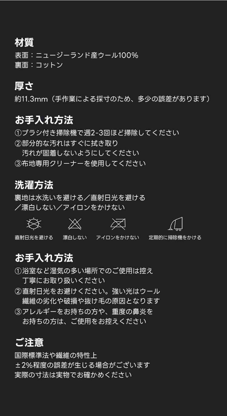 - 【高品質ウール使用】ニュージーランド産の100%ウールを使用し、耐久性と柔らかさを兼ね備えたラグです。長くて柔らかな繊維がふっくらとした質感を提供し、快適な足触りを実現します。