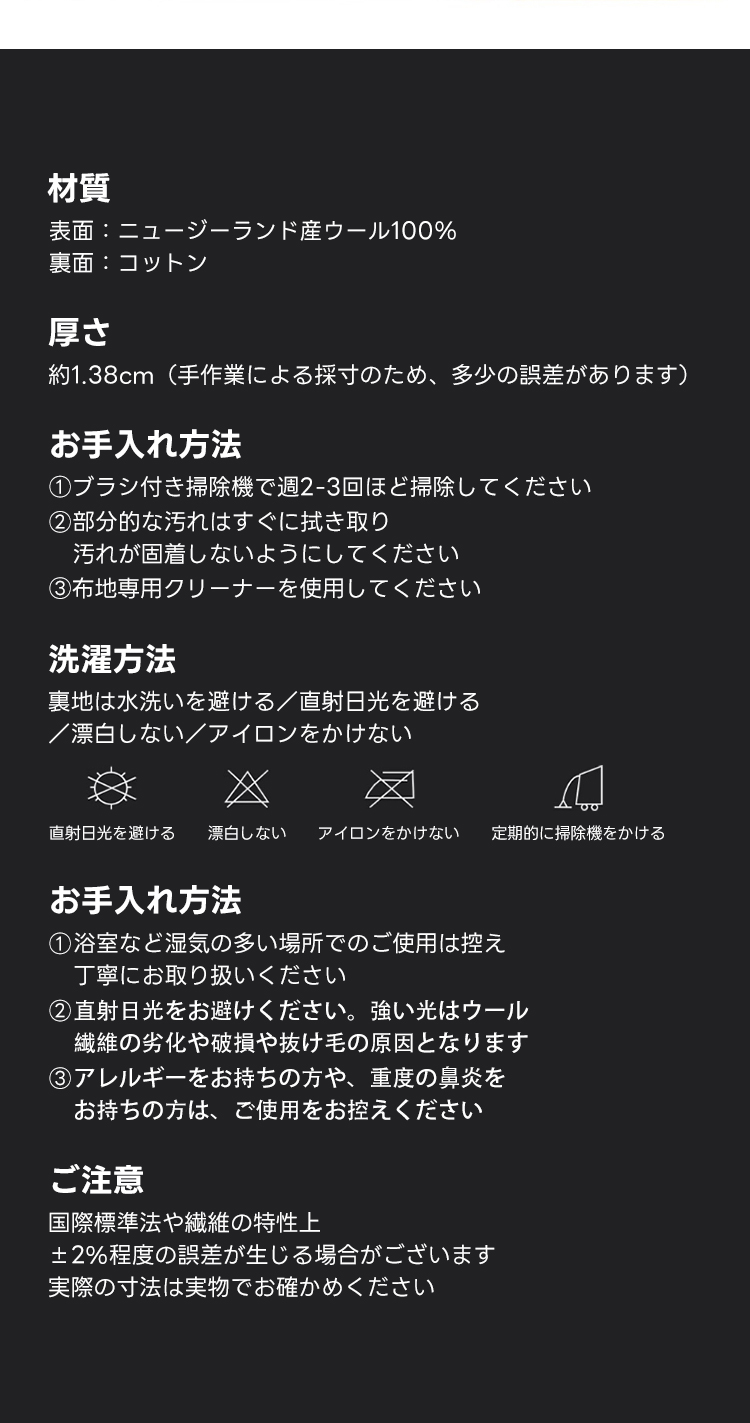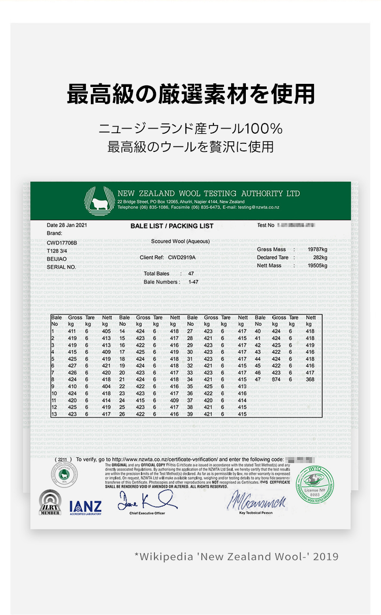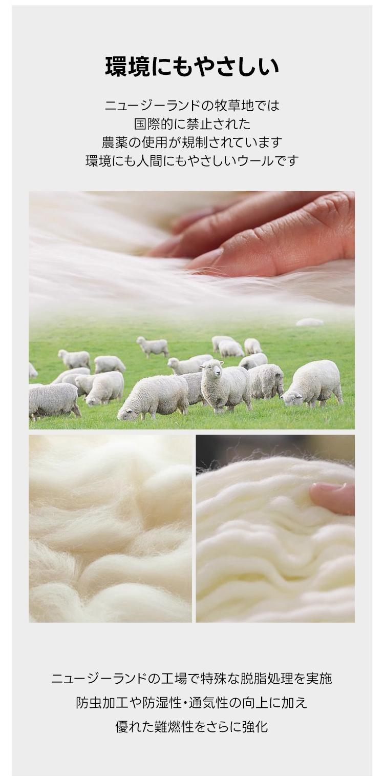- 【安心の品質とサービス】:環境に優しい素材を使用し、ニュージーランドの牧草地で育てられた羊のウールを使用。農薬の使用が制限されているため、安心して使用できます。