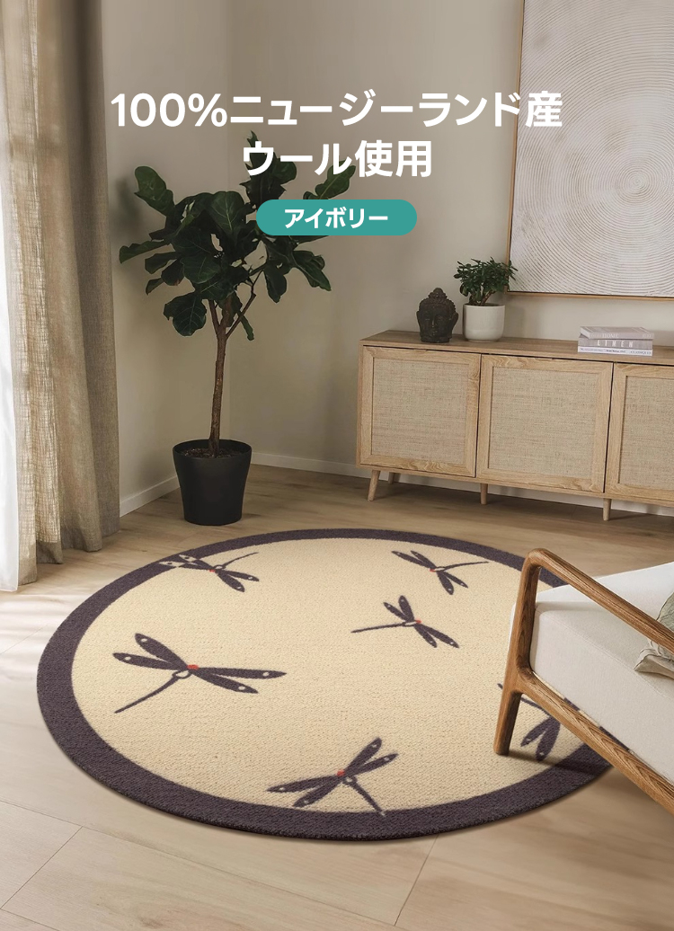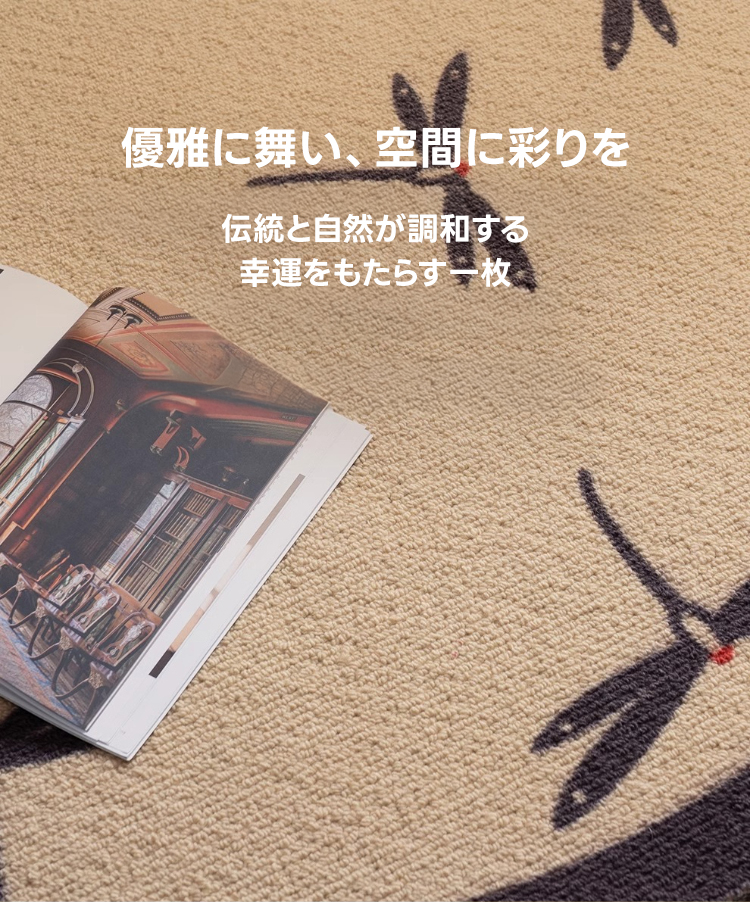 - 【優れたデザインと品質】:トンボの柄が施されたジャパンディスタイルのデザインで、空間に彩りを加えます。手織りのような風合いが高級感を演出し、インテリアのアクセントとしても活躍します。