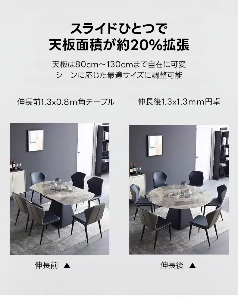 - 【回転式セラミック伸長機能】:このダイニングテーブルは、回転式構造と自動伸長機能を備え、80cmから130cmまで簡単にサイズを調整できます。家族の集まりやパーティーなど、さまざまなシーンに対応可能です。