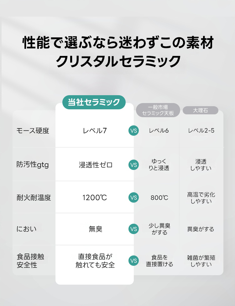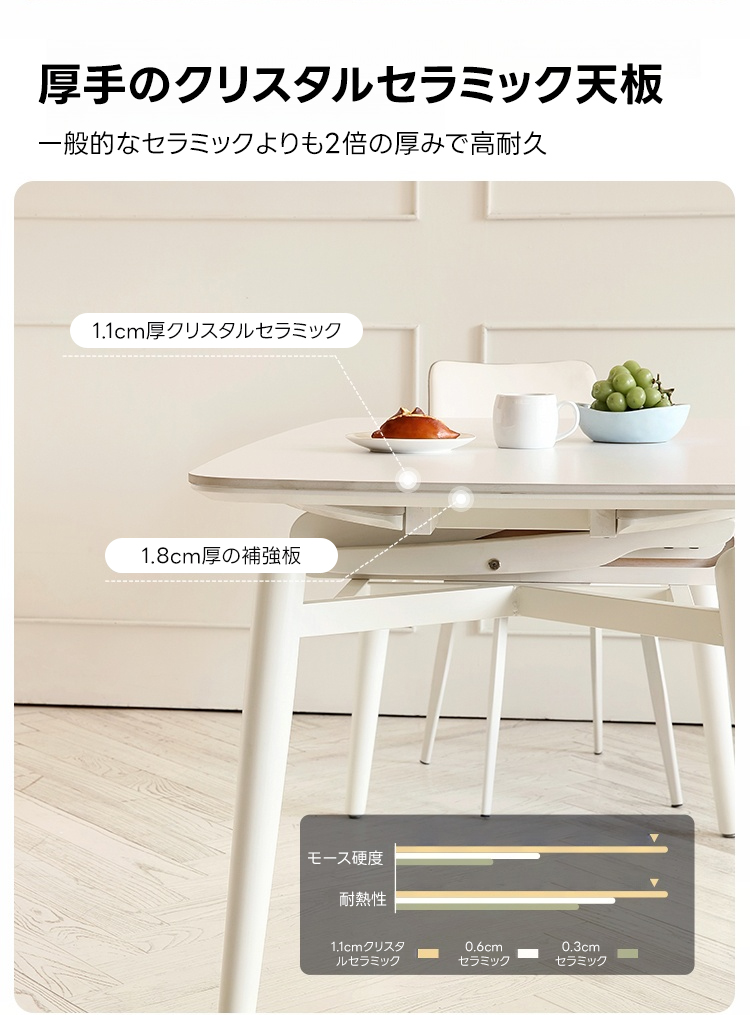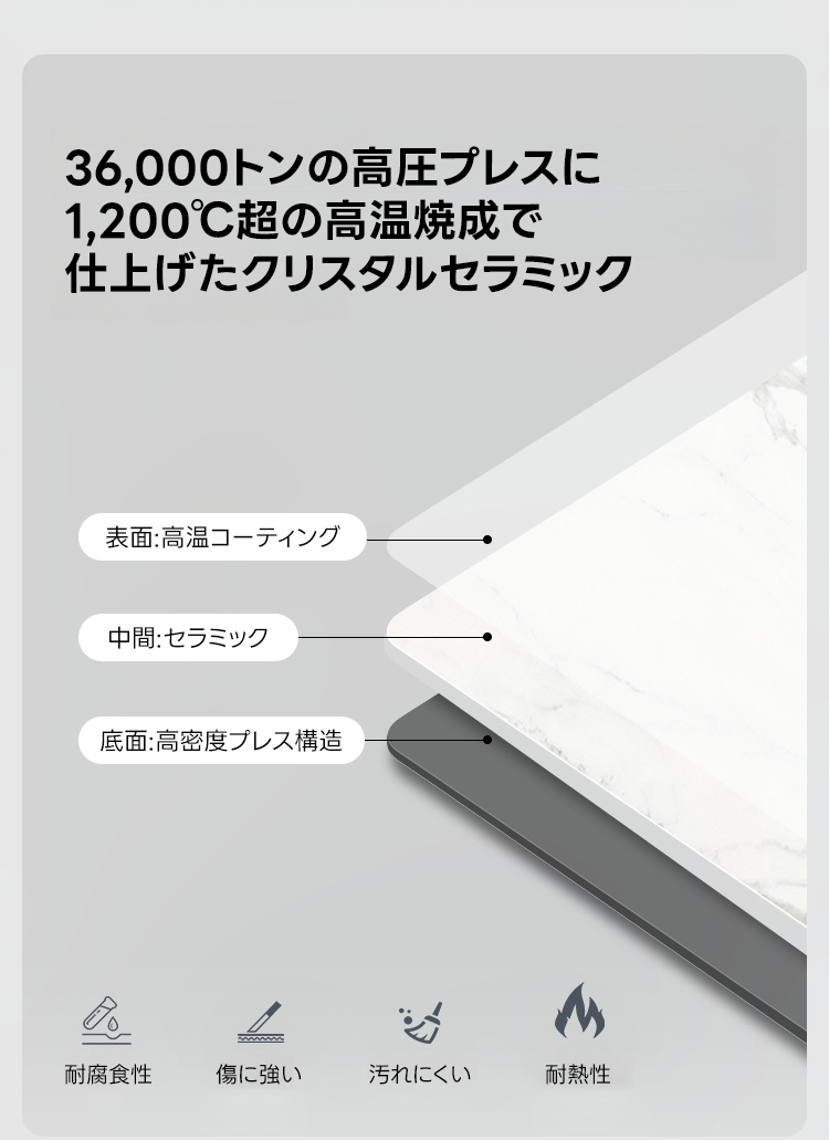 - 【高品質な素材とデザイン】耐熱性と耐傷性に優れた1.1cm厚のクリスタルセラミック天板を採用し、高温でも変形せず安心して使用できます。スチール製の脚部は高い安定性を誇り、長期間使用してもぐらつきにくい設計です。