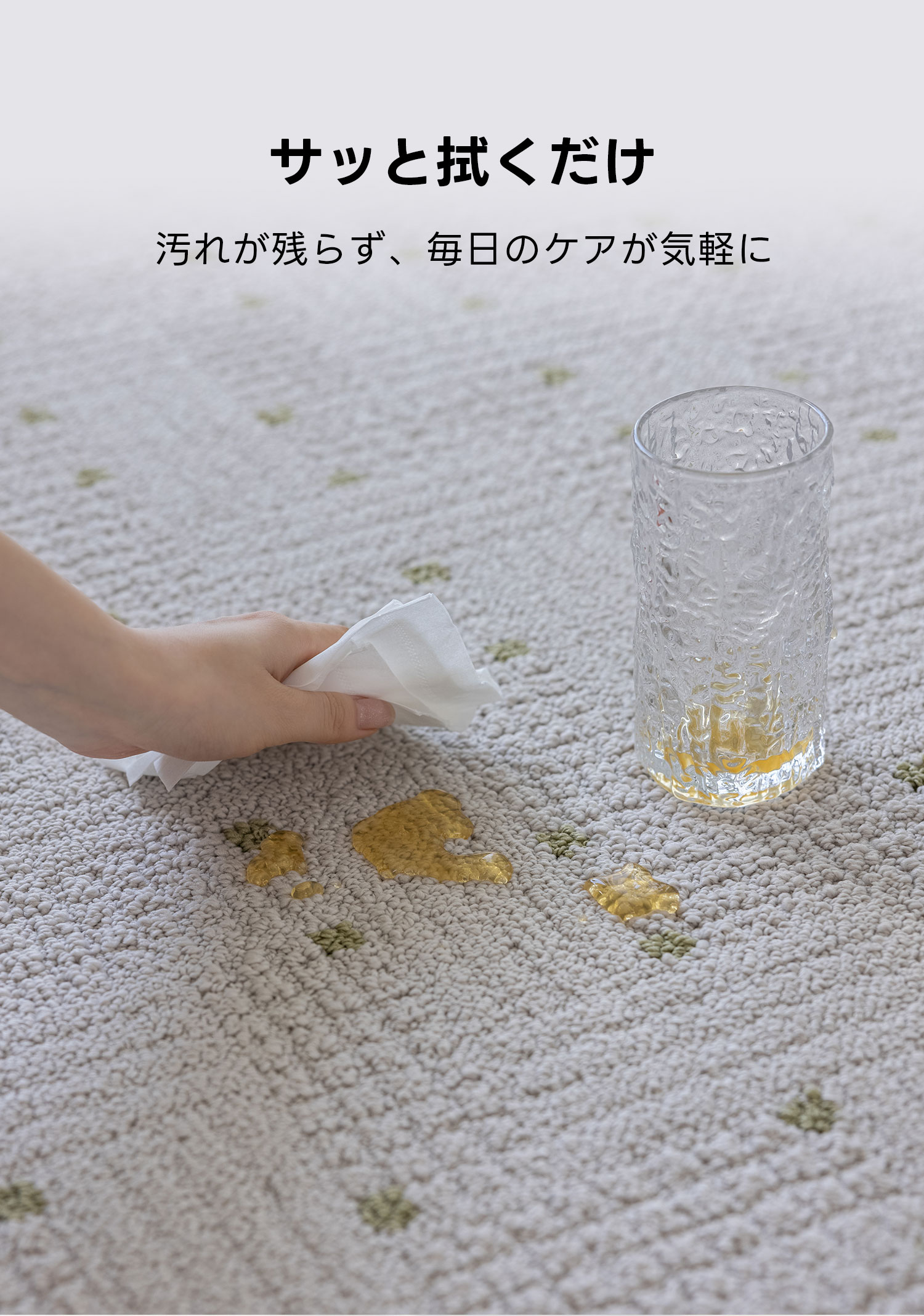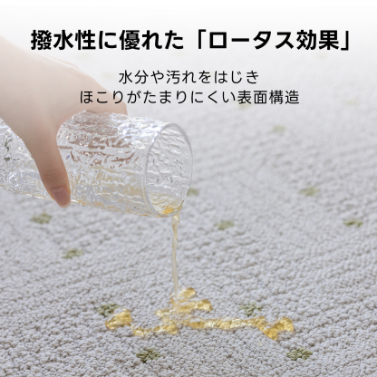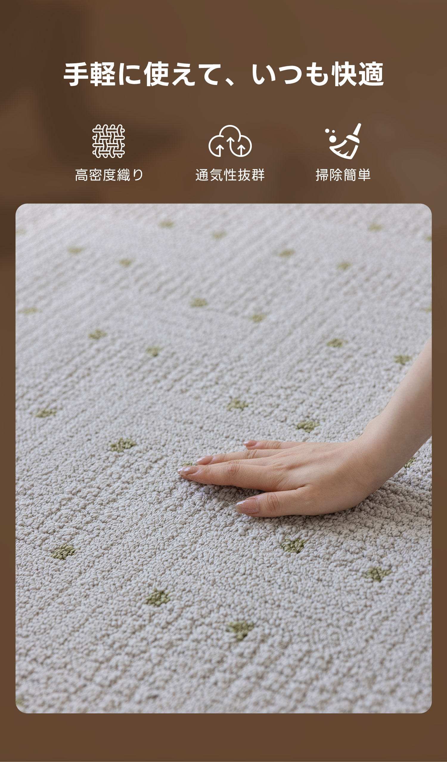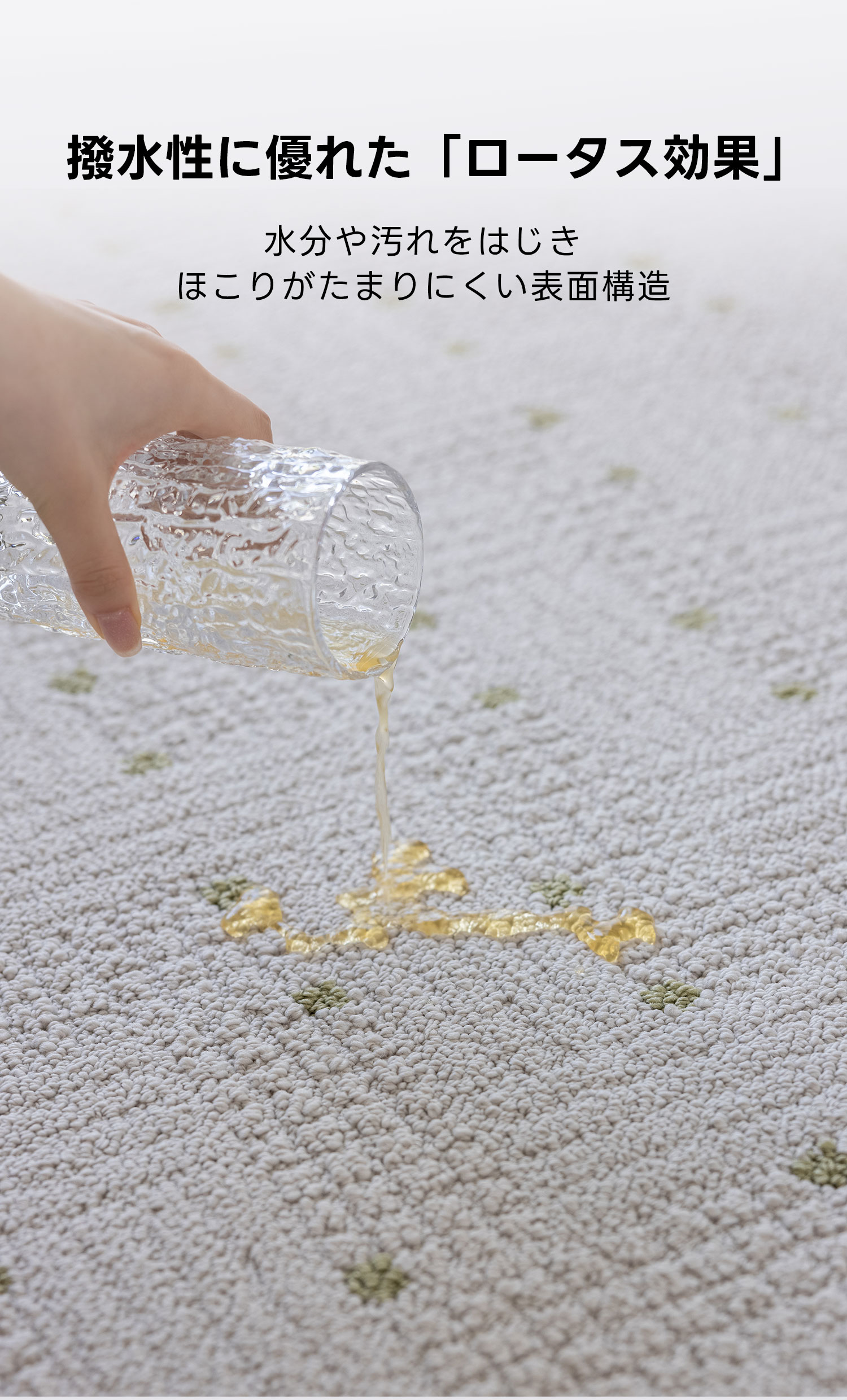 - 【撥水性と通気性の両立】:このラグは撥水性に優れたロータス効果を持ち、水分や汚れを簡単にはじきます。通気性も良く、オールシーズン快適に使用できます。日々のお手入れも簡単で、清潔を保つことができます。