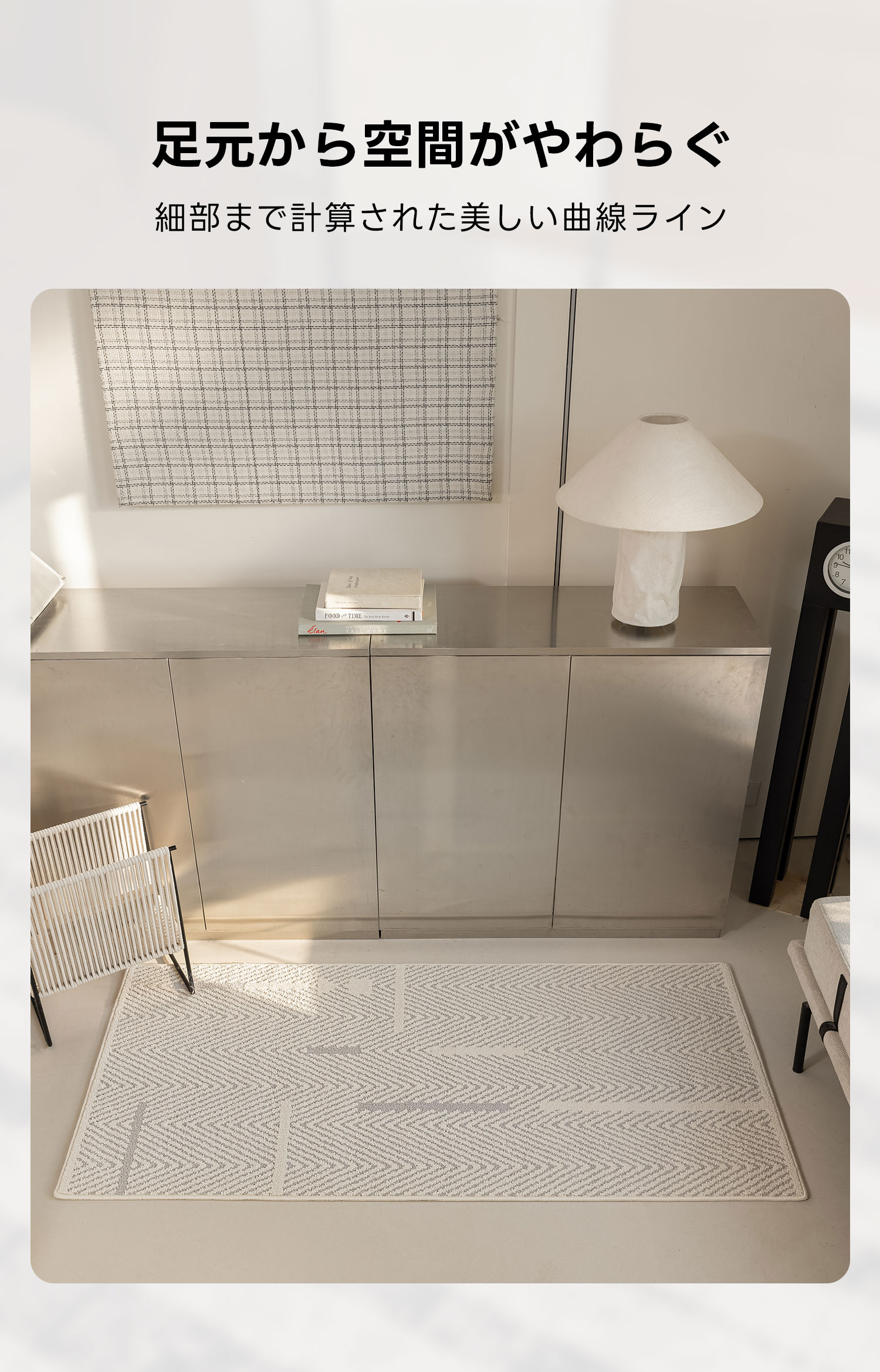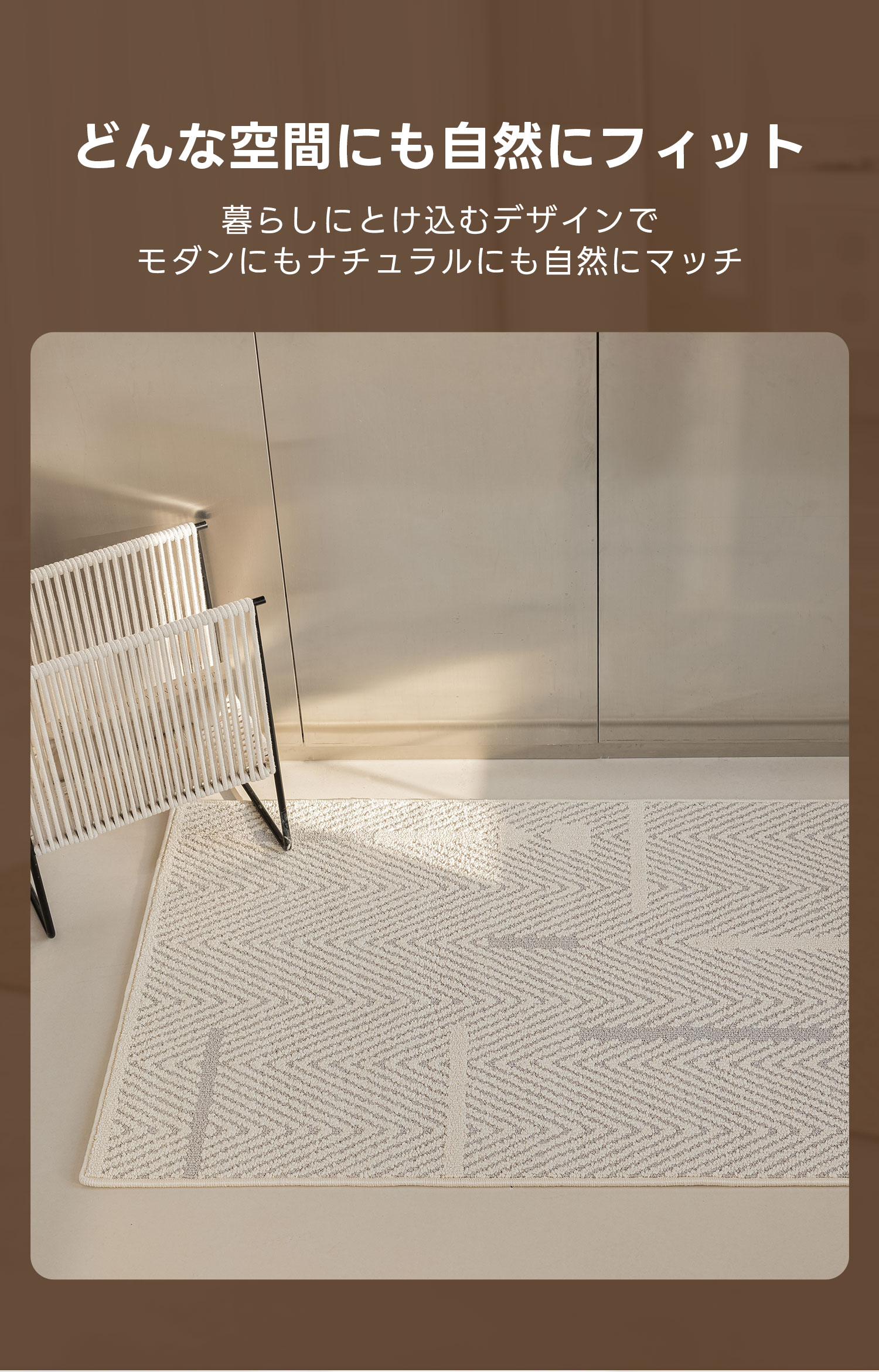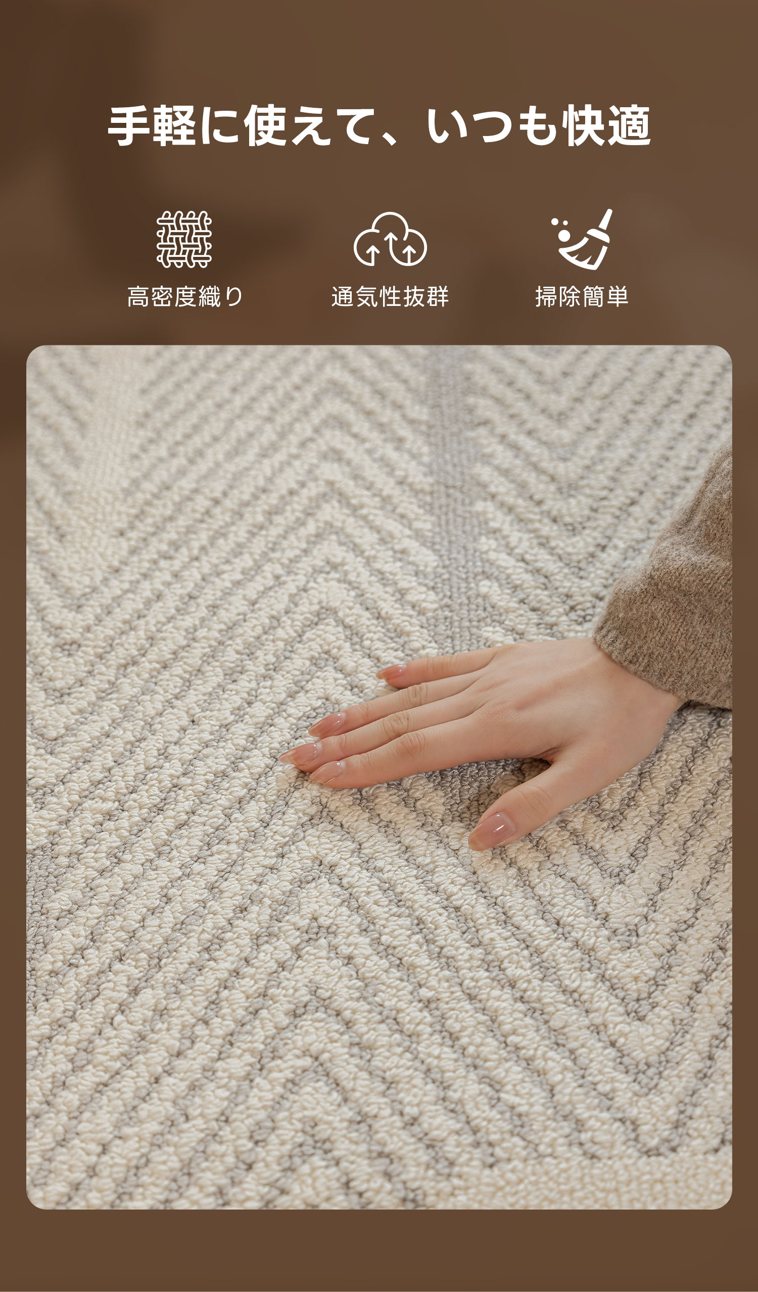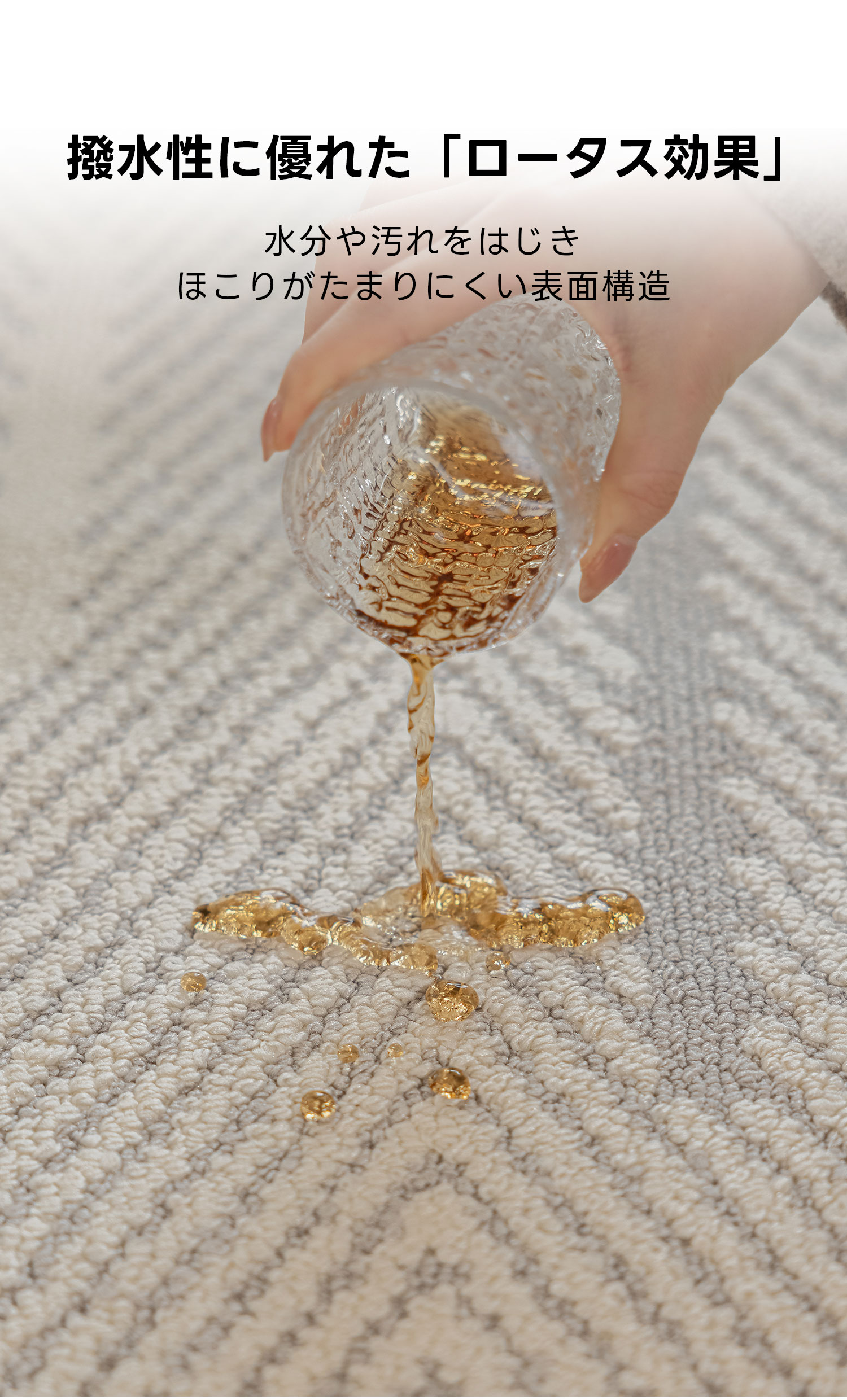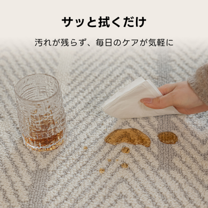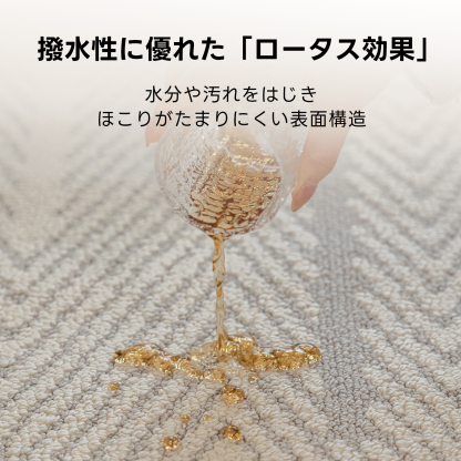 - 【撥水性と汚れ防止機能】ミニマルヘリンボーンラグは、ロータス効果により水分や汚れを弾く表面構造を持ち、ほこりがたまりにくい設計です。汚れがついてもさっと拭くだけで簡単にお手入れでき、常に清潔な状態を保てます。