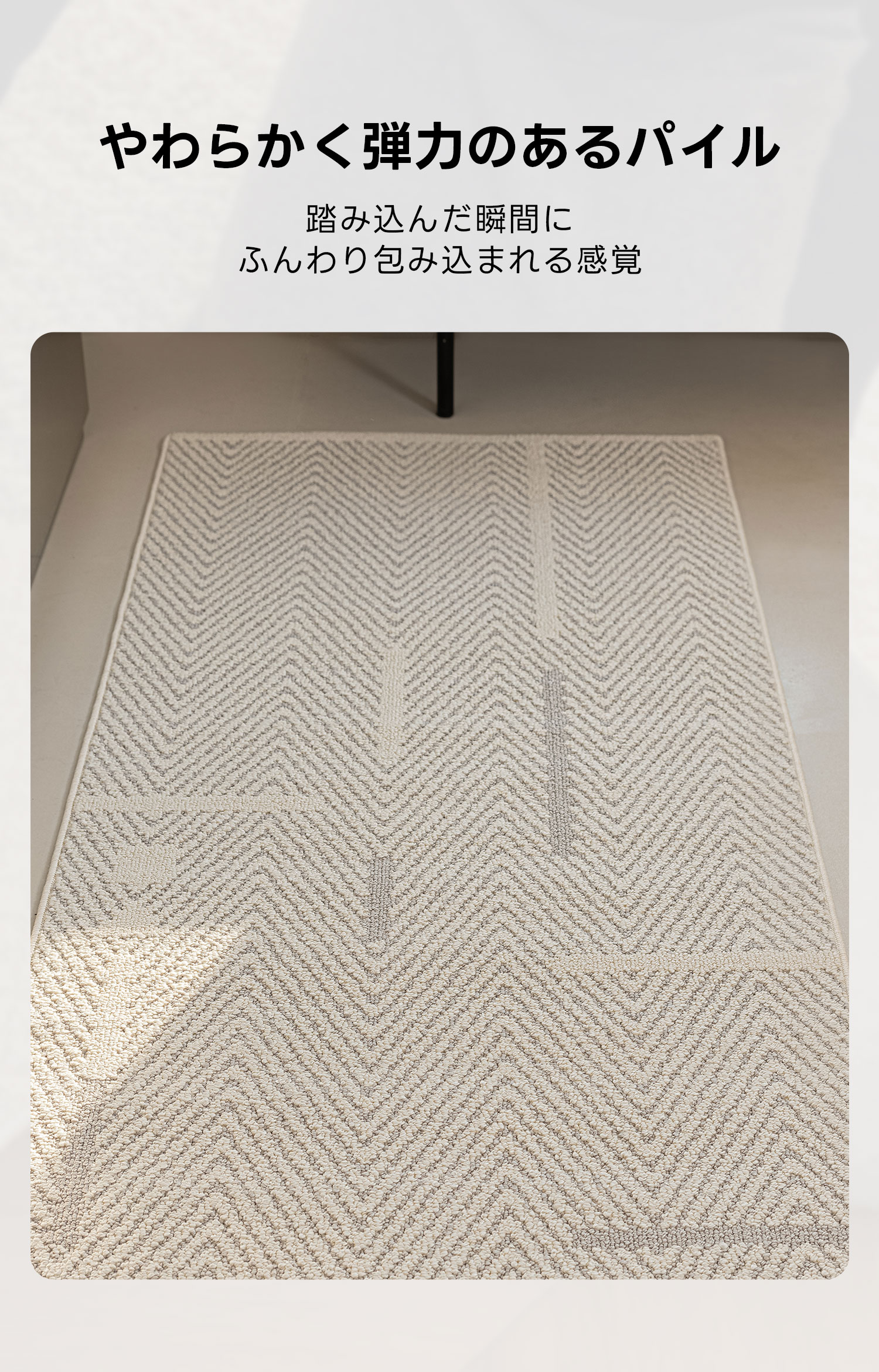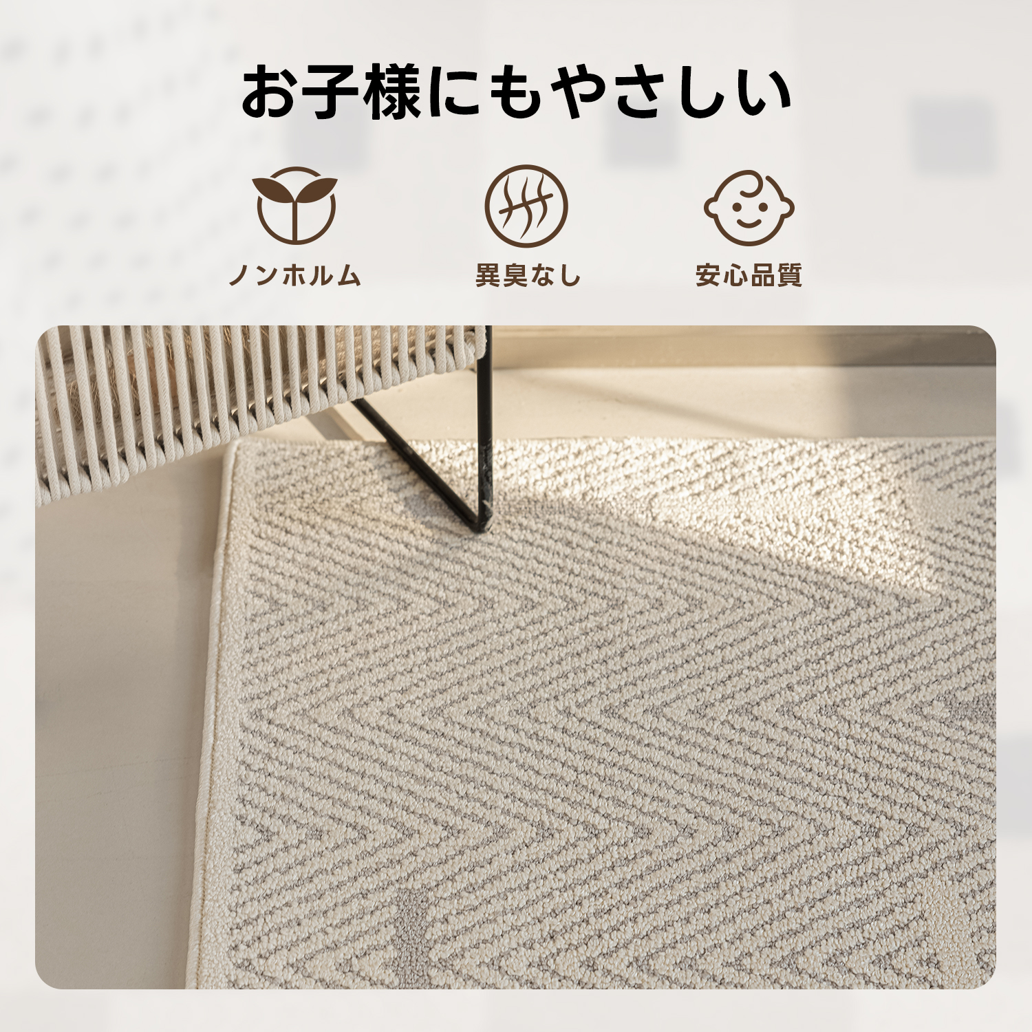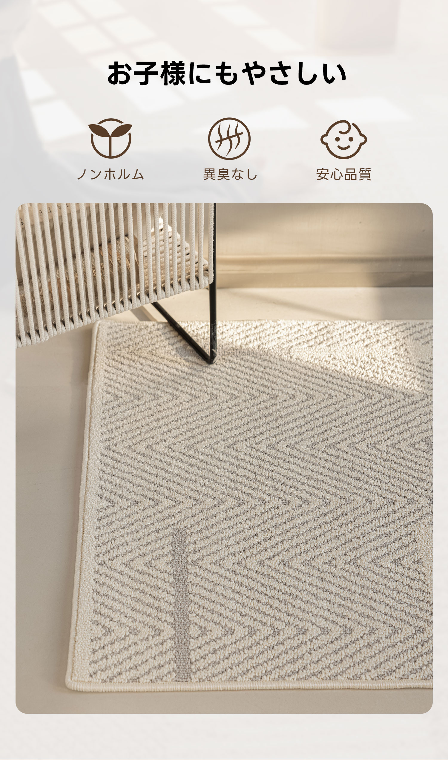 - 【快適な踏み心地】ふんわりとした弾力のあるパイルで、足元から空間をやわらげます。ノンホルムでお子様にもやさしい素材を使用しており、異臭がなく安心して使用できます。
