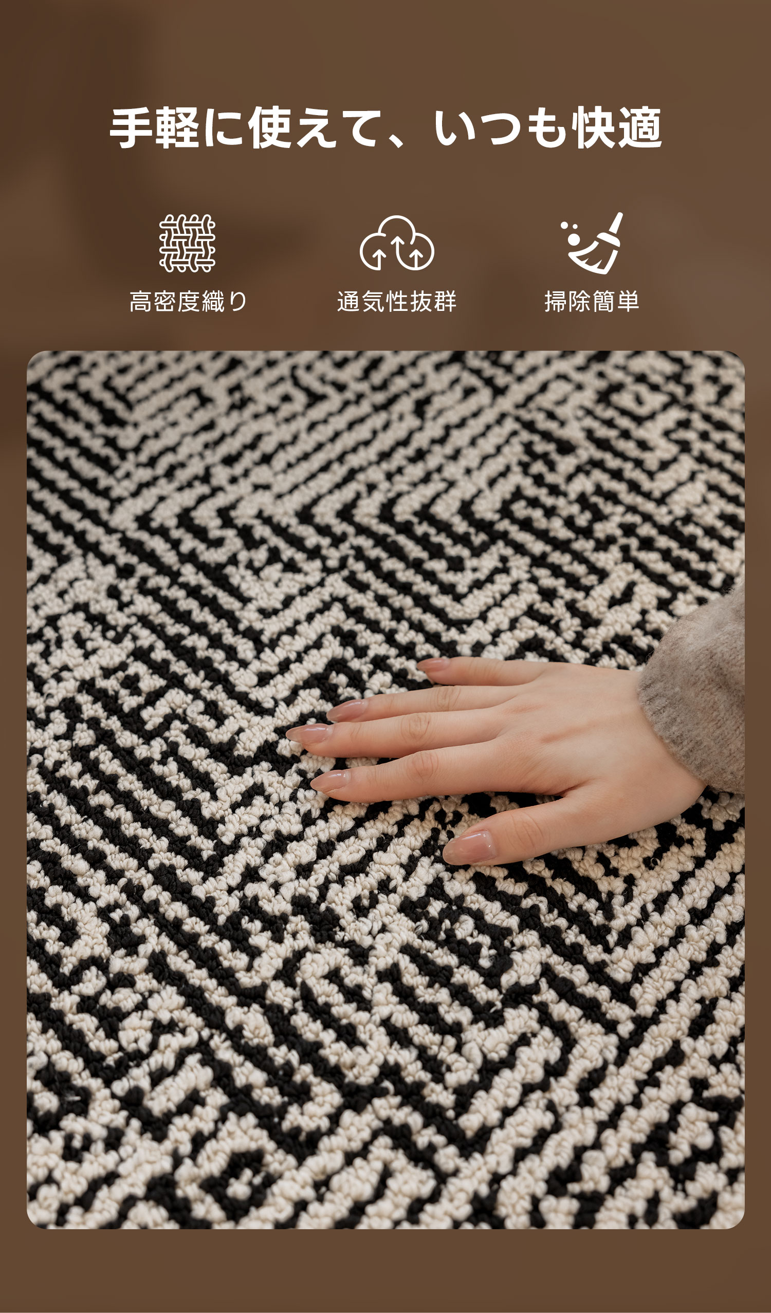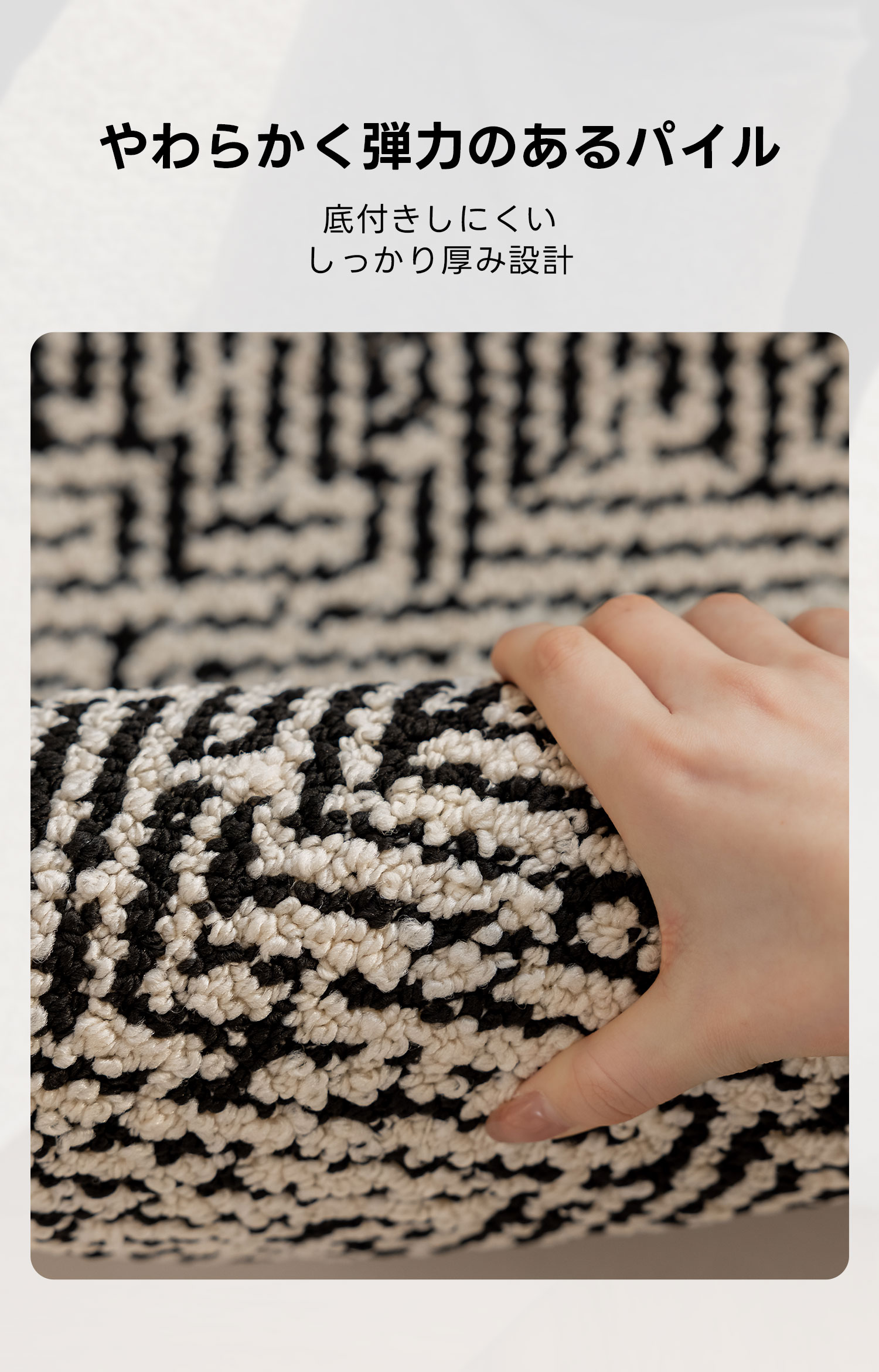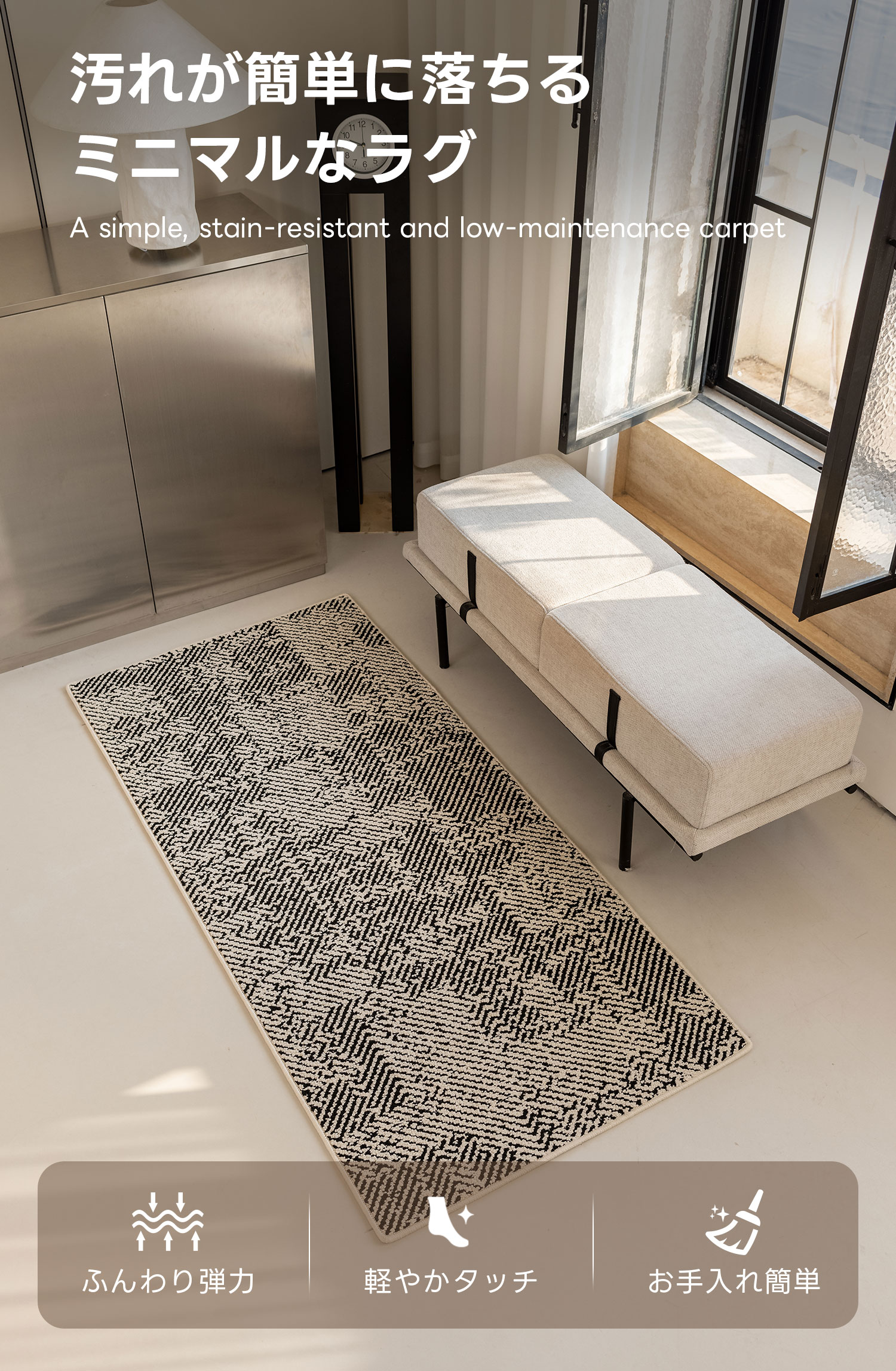 - 【シンプルモダンデザイン】ジオラインラグは、シンプルでモダンなデザインが特徴です。ブラックとホワイトの色合いがスタイリッシュで、どんなインテリアにも自然に溶け込みます。玄関やエントランス、ダイニング、寝室、リビング、書斎など、さまざまな空間にフィットします。