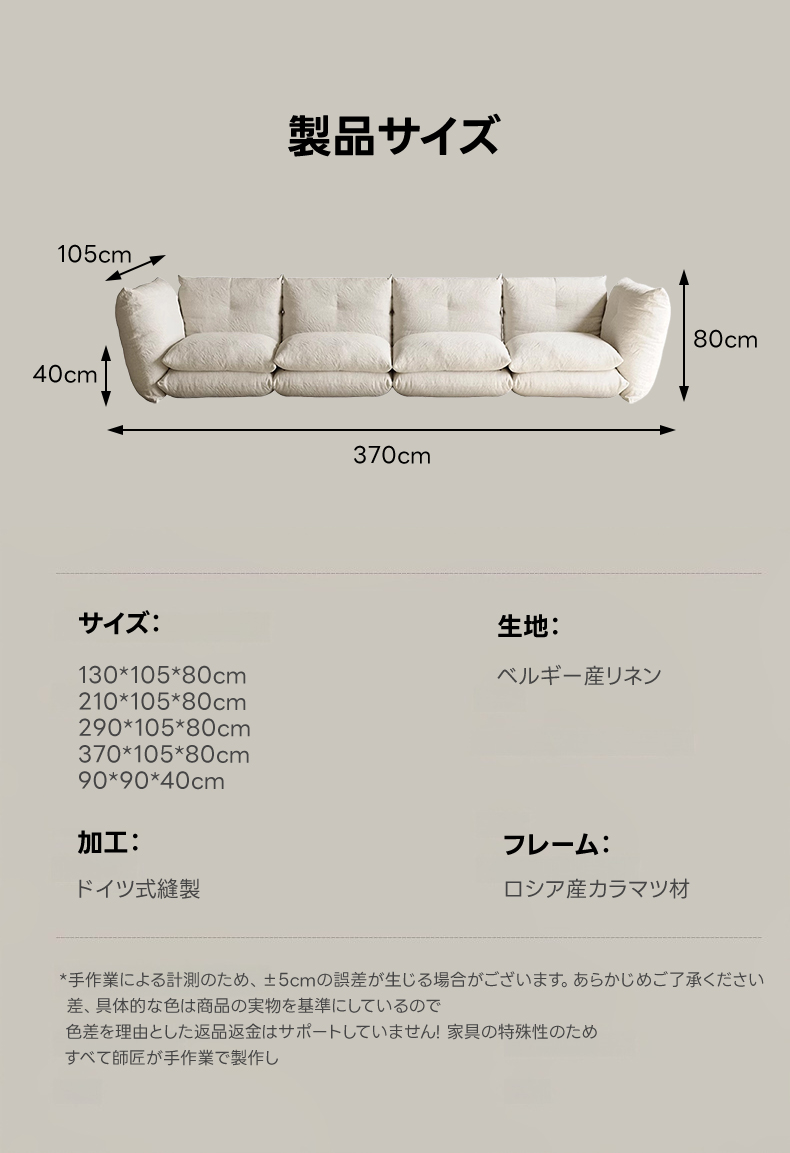 - 【多様なリビングスペースに対応】:幅130cmから370cmまでのサイズ展開により、様々なリビングスペースにフィットします。カップルやファミリーでの使用に最適で、団らんの場を一層豊かにします。
