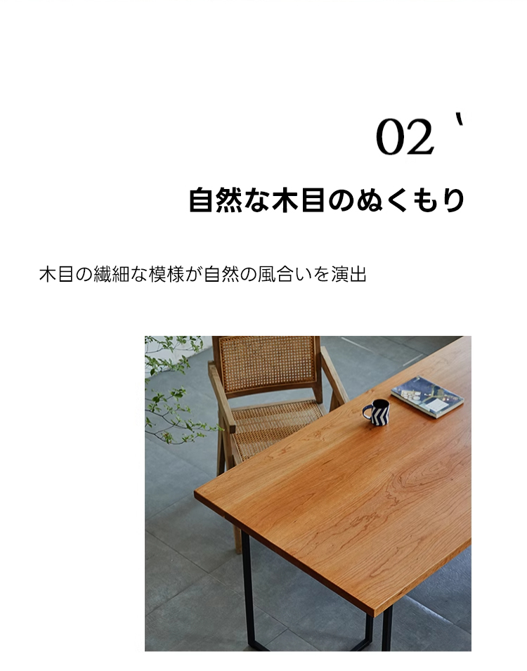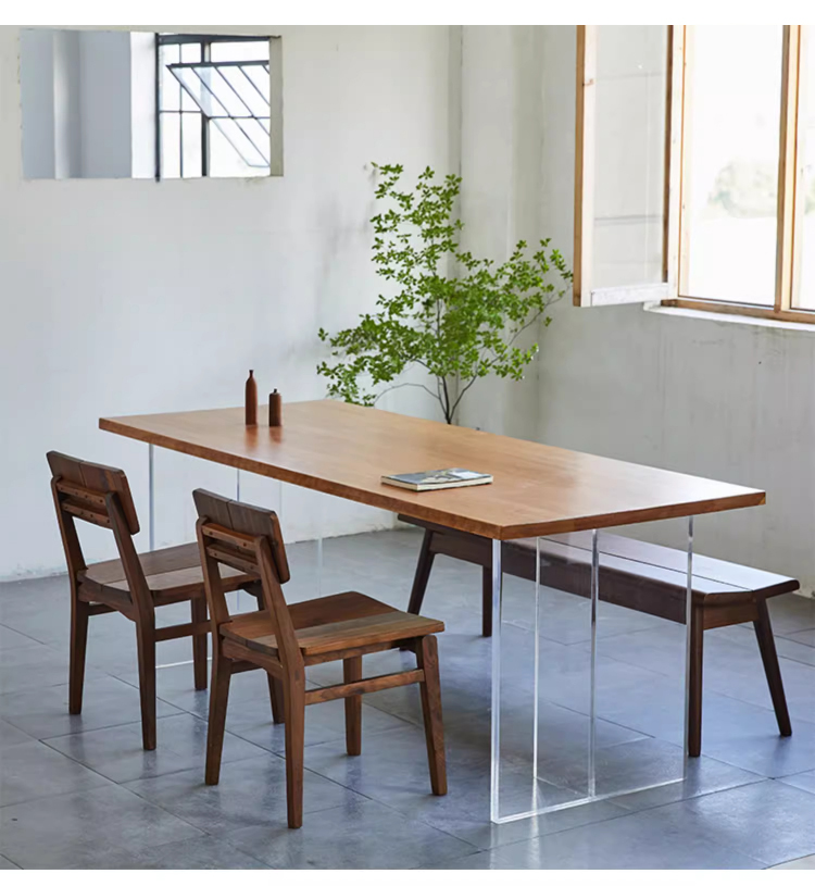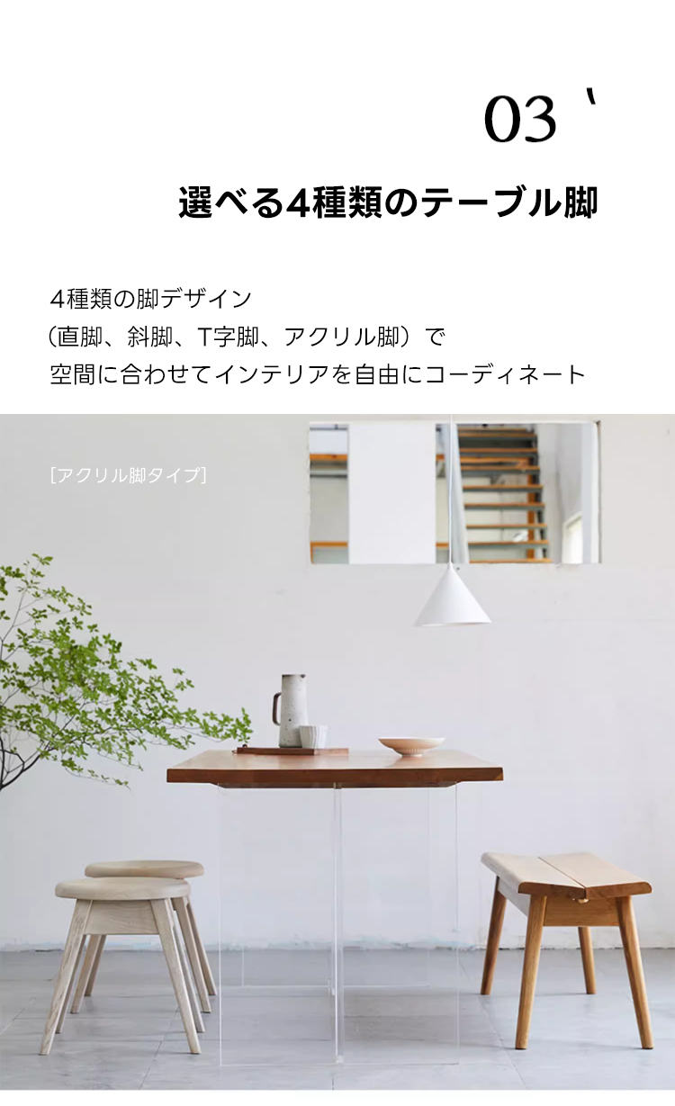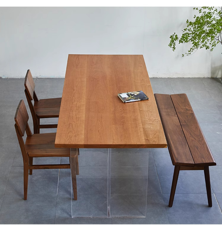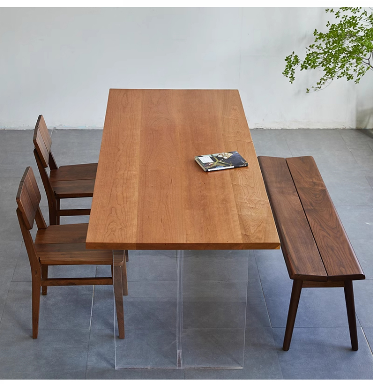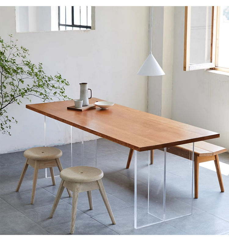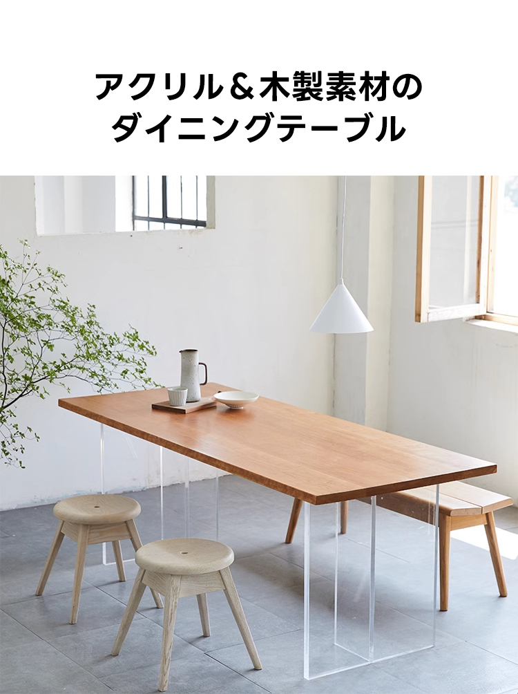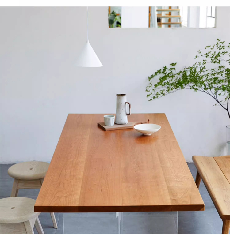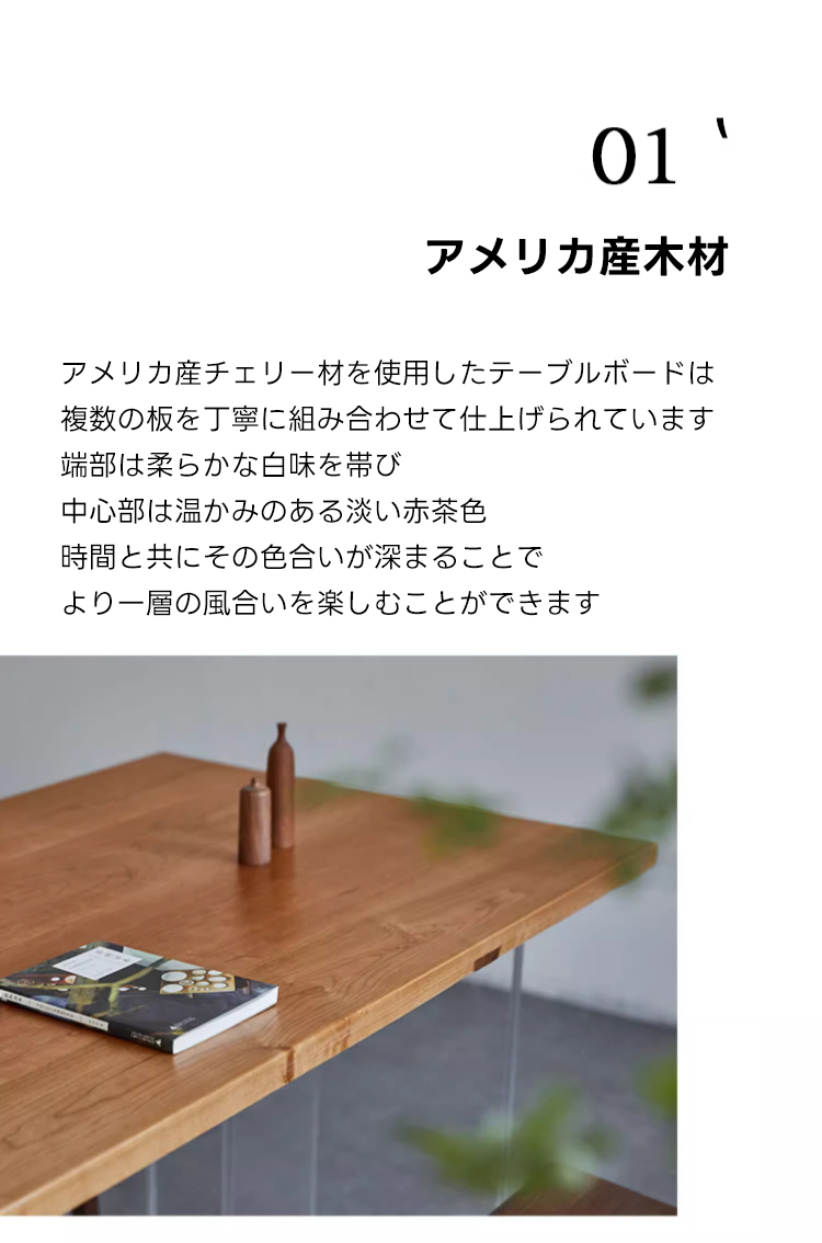 - 【こだわりの素材】:テーブルボードにはアメリカ産のチェリー材を使用し、脚部には高品質なアクリルを使用。透明感があり、空間を広く見せる効果があります。環境に優しい無臭塗装を施しており、安心してご使用いただけます。