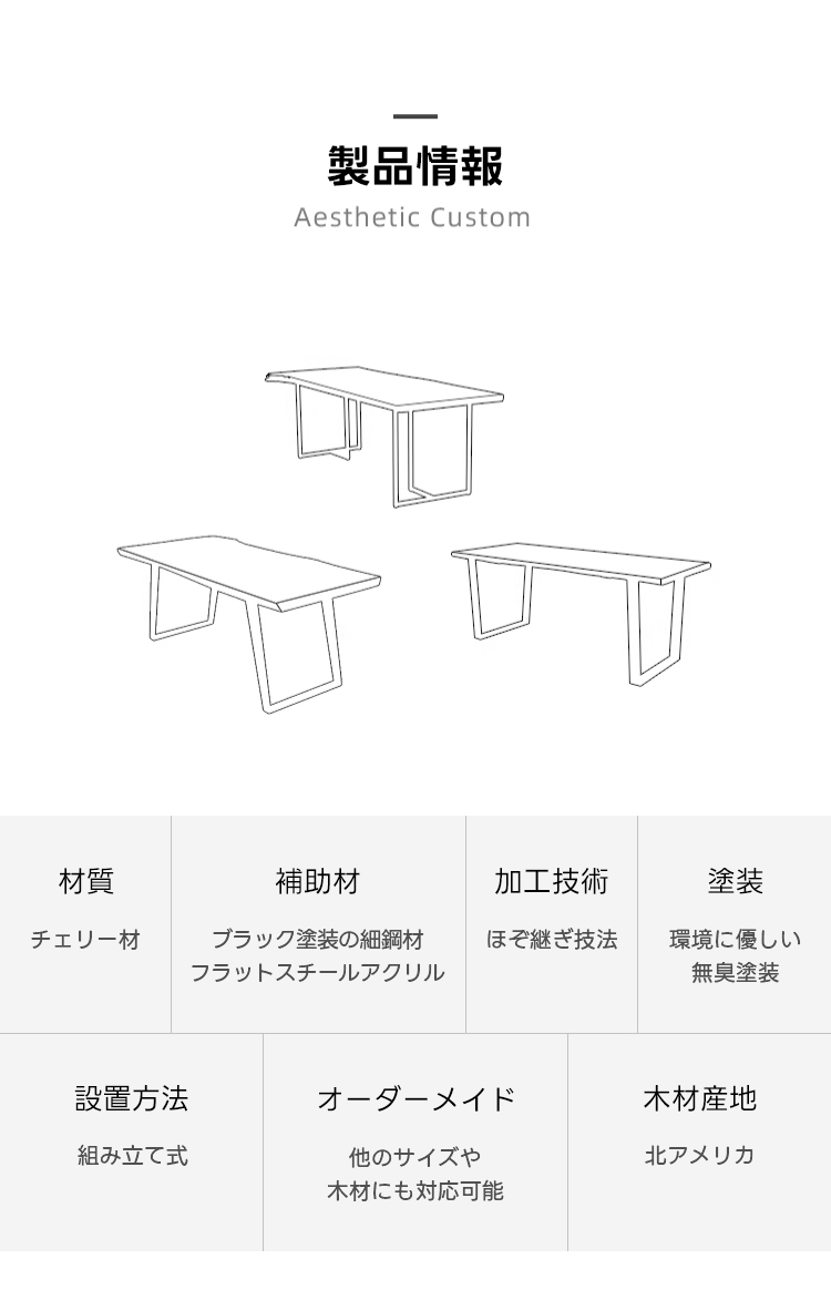 - 【簡単な組み立てとカスタマイズ】:組立品であり、簡単に設置可能。オーダーメイド対応で、サイズや木材の変更も可能です。自分好みのダイニングスペースを作り上げましょう。